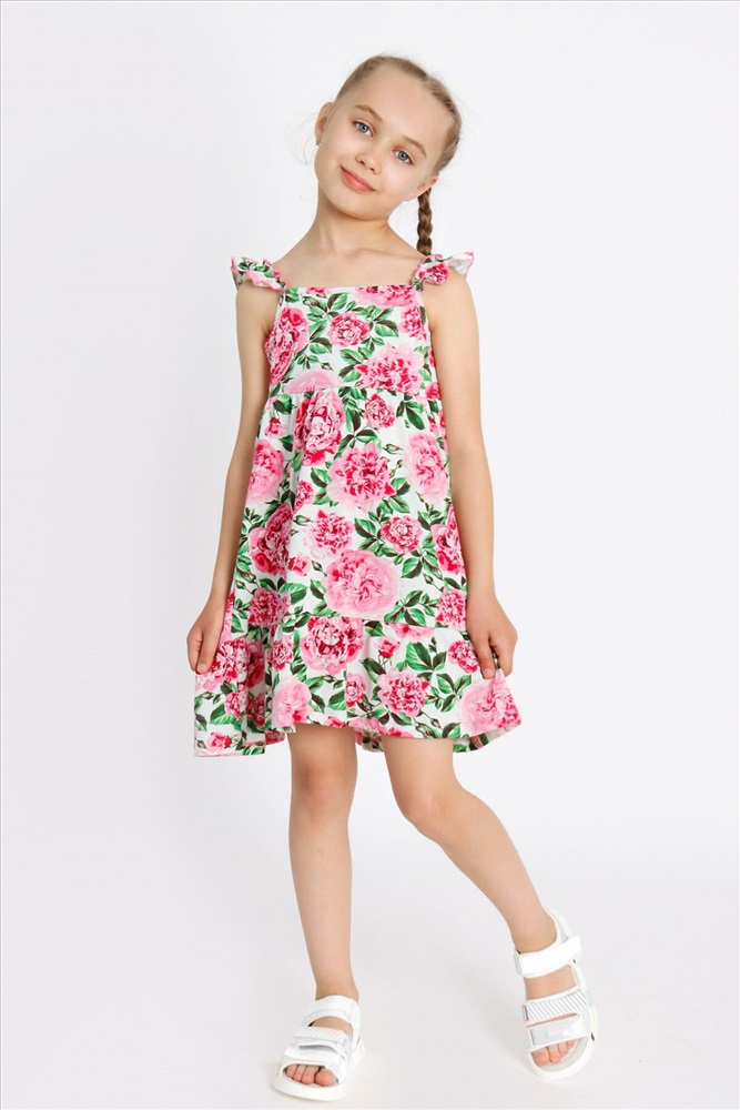 Сарафан из легкой хлопковой ткани с рисунком, отрезной выше талии, на узких лямках, отделанных крыльями. От кокетки - в сборку. Нижняя часть сарафана украшена рюшей. Полочка укороченная, спинка удлиненная. Ткань гипоаллергенная, хорошо пропускает воздух.
