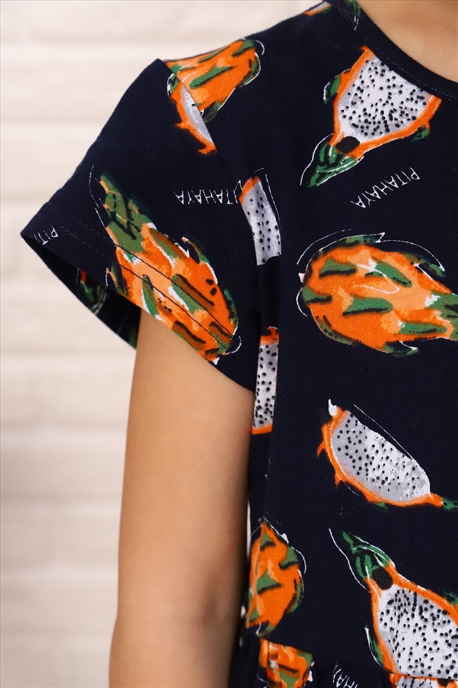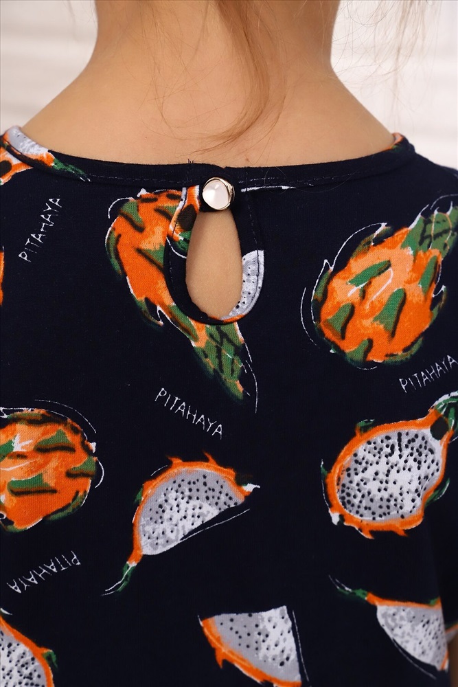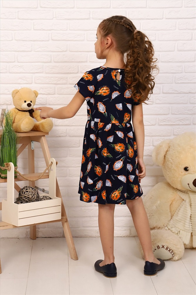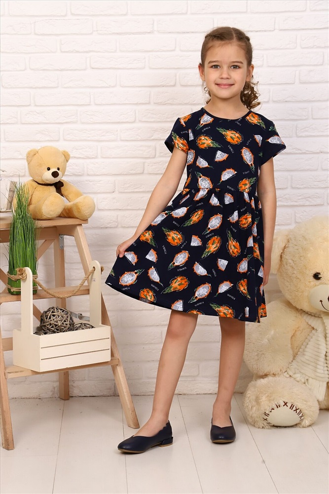 Страна производства: Россия Платье в десткий сад или на прогулку для девочек дошкольного и младшего школьного возраста, из трикотажного полотна кулирная гладь с рисунком. Платье полуприлегающего силуэта, отрезное и расширенное от линии талии, с втачным рукавом, с центральной застежкой на петлю и пуговицу сзади. На верхней части спинки вырез в виде капельки под застежку. Рукав короткий. Низ рукава и изделия подогнуты. Горловина и капелька на спинке окантованы.