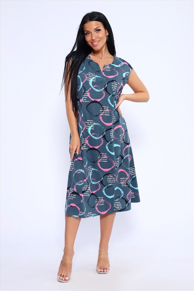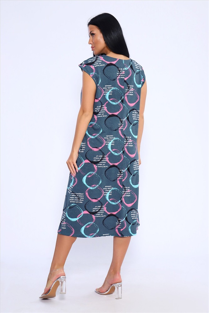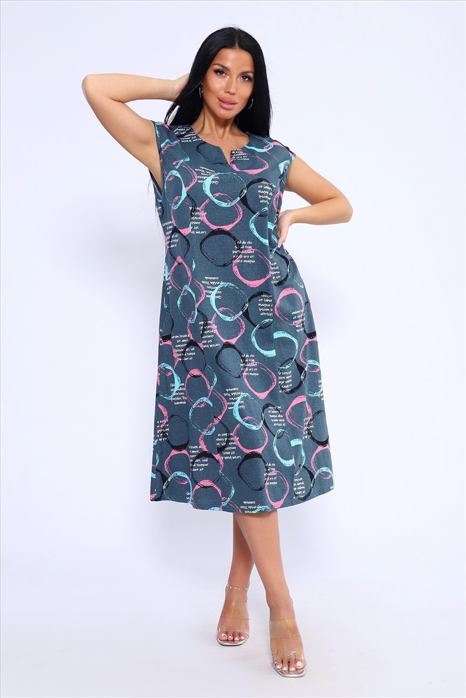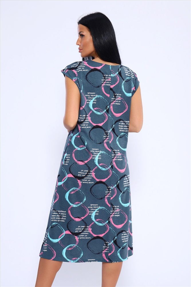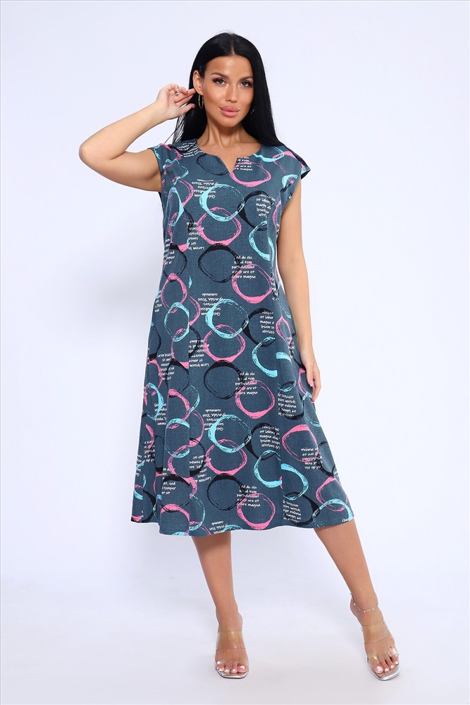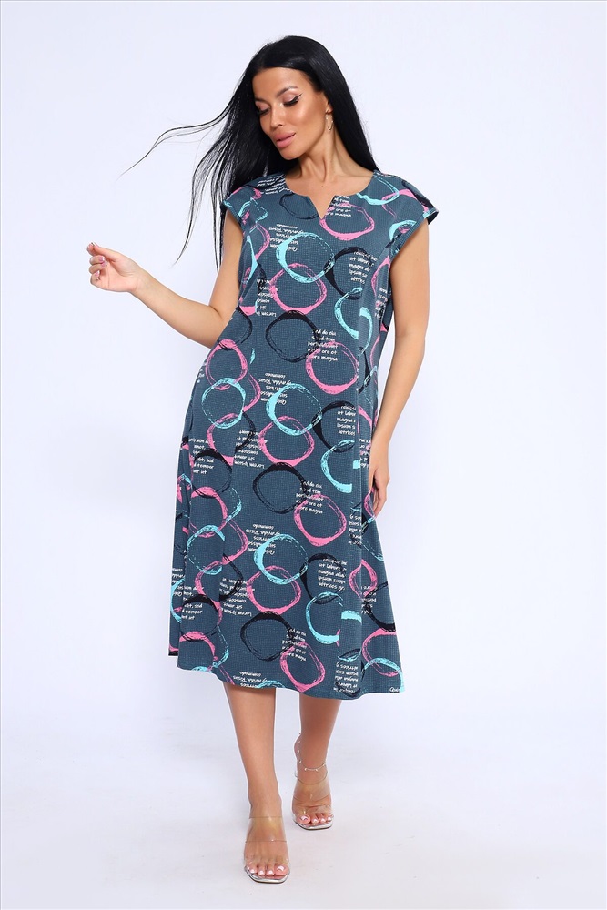 Лёгкое и удобное платье из 100% хлопка идеальный выбор для тех, кто ценит комфорт и стиль. Благодаря идеальным лекалам, это платье прекрасно сидит на любой фигуре, позволяя вам наслаждаться ощущением спокойствия и уюта после рабочего дня или посвятить себя повседневным заботам по дому. Платье доступно в больших размерах, что делает его подходящим для широкого круга женщин. Модная контрастная расцветка с кругами придаёт ему особый шарм. Горловина имеет круглую форму с декоративной капелькой в виде буквы V, что добавляет изюминку в общий образ. Платье имеет спущенную пройму и карманы в боковых швах, что делает его не только стильным, но и практичным.