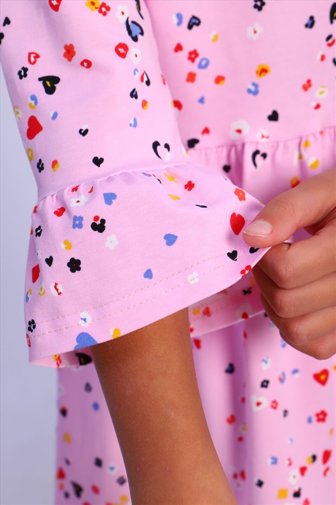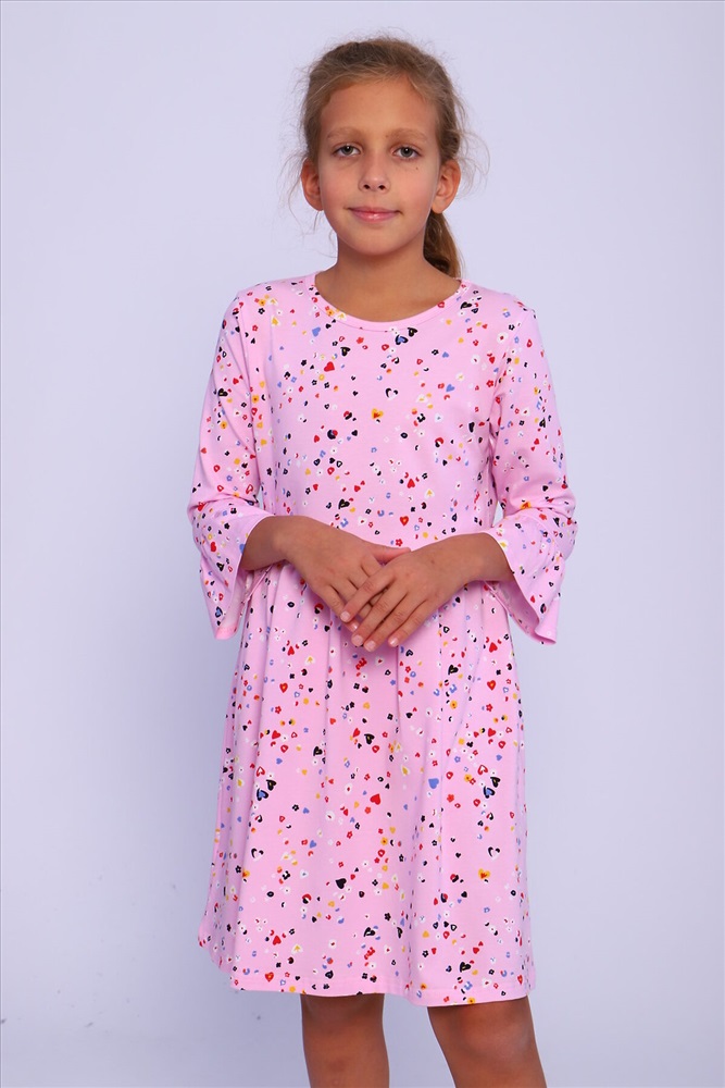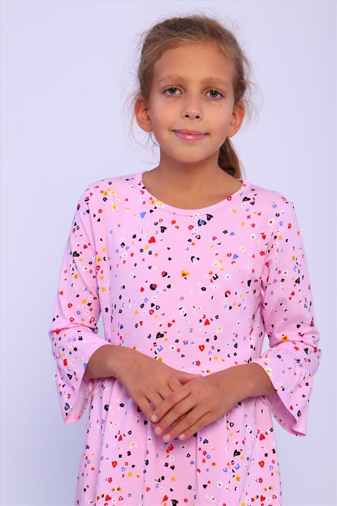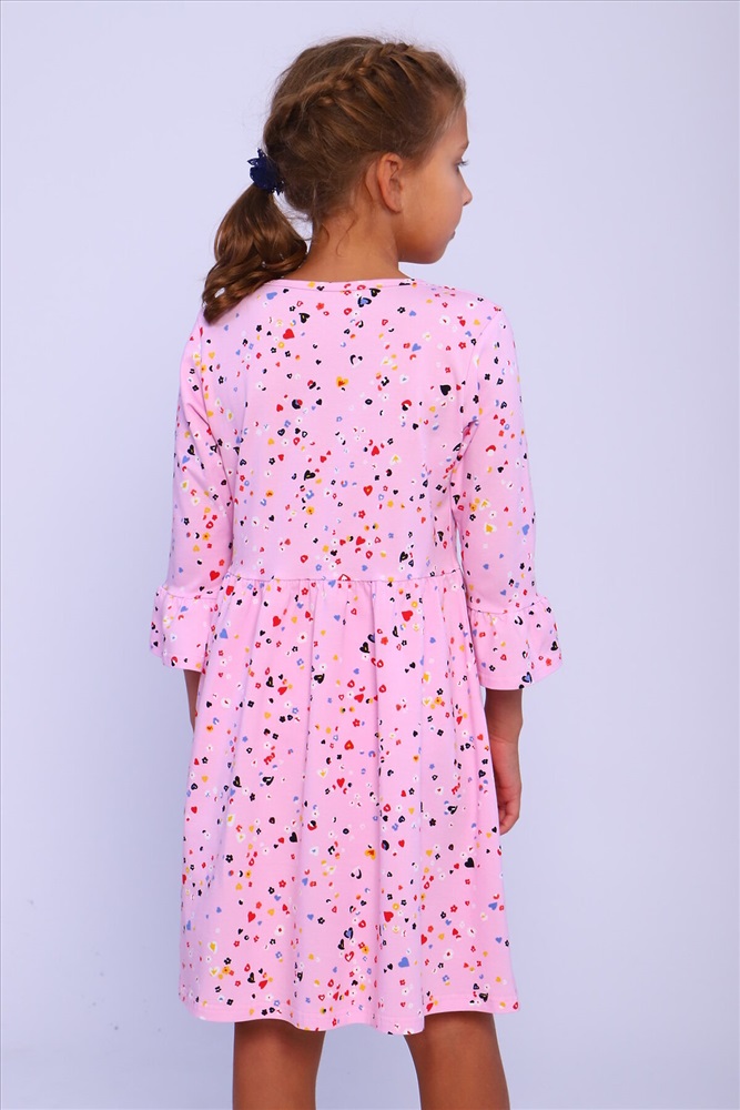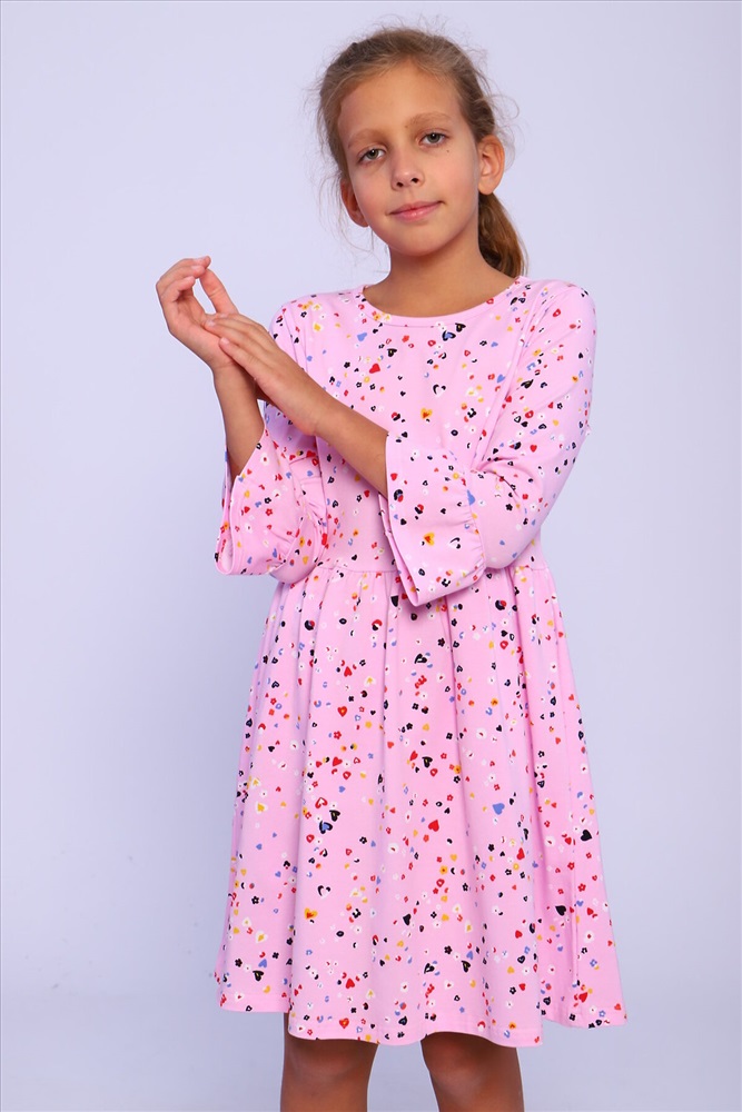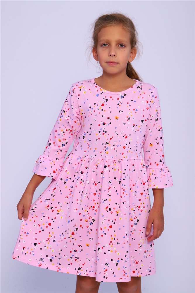 Страна производства: Россия Платье для девочек дошкольного и младшего школьного возраста, из трикотажного полотна кулирка с лайкрой с рисунком. Силуэт прилегающий, отрезное и расклешенное от линии талии, рукав 3/4 втачной одношовный. По низу рукава широкий волан, выполненный из основного материала. Срез горловины окантован.