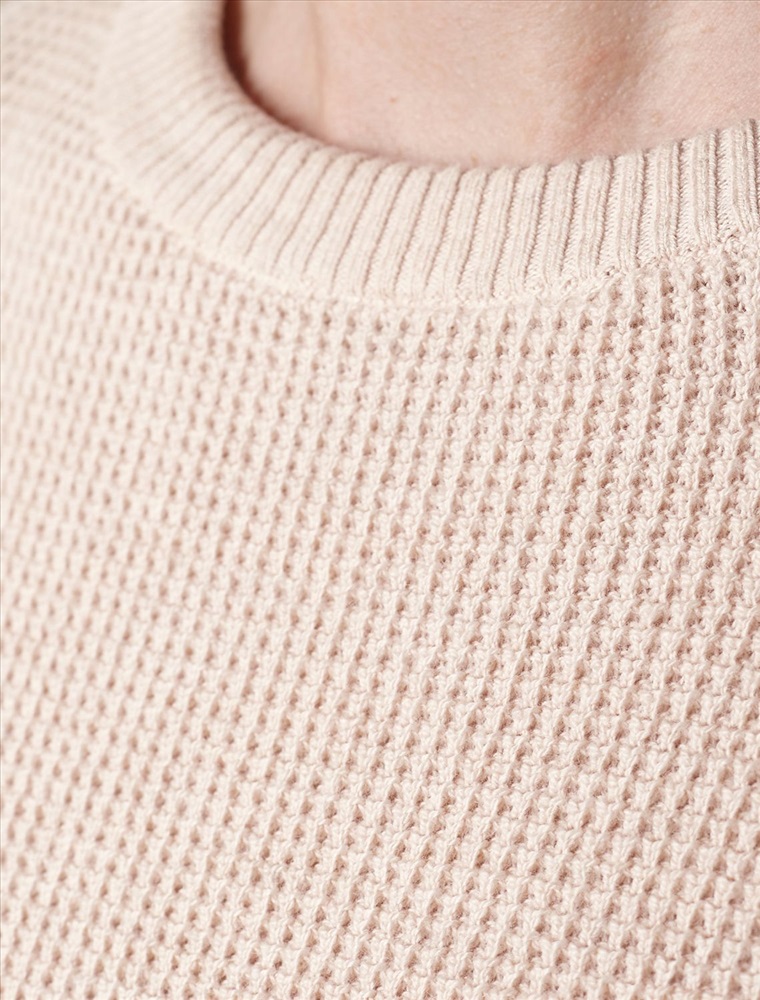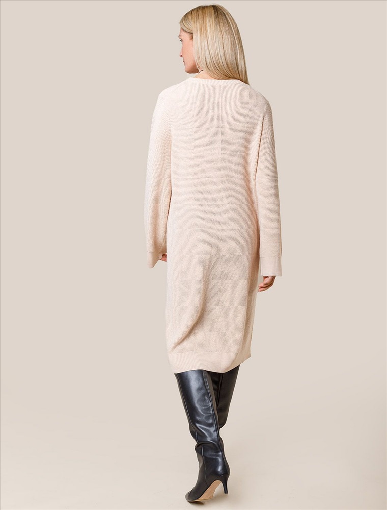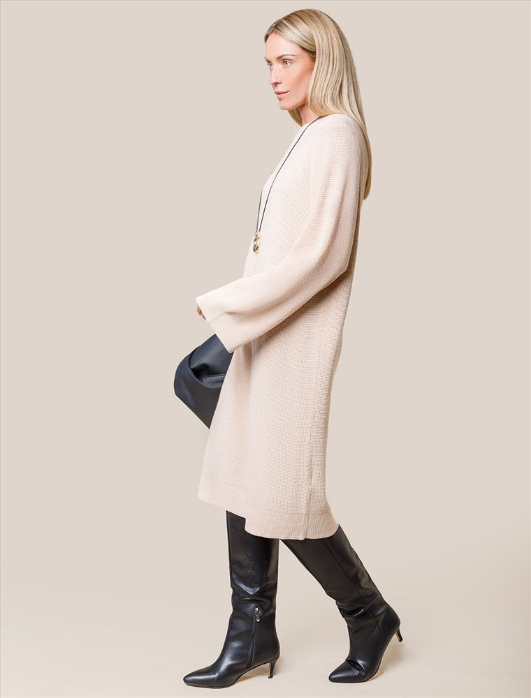 Платье прямого силуэта фактурной вязки выполнено из хлопка с добавлением кашемира.