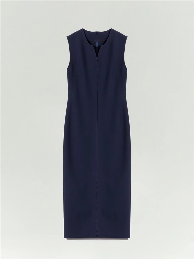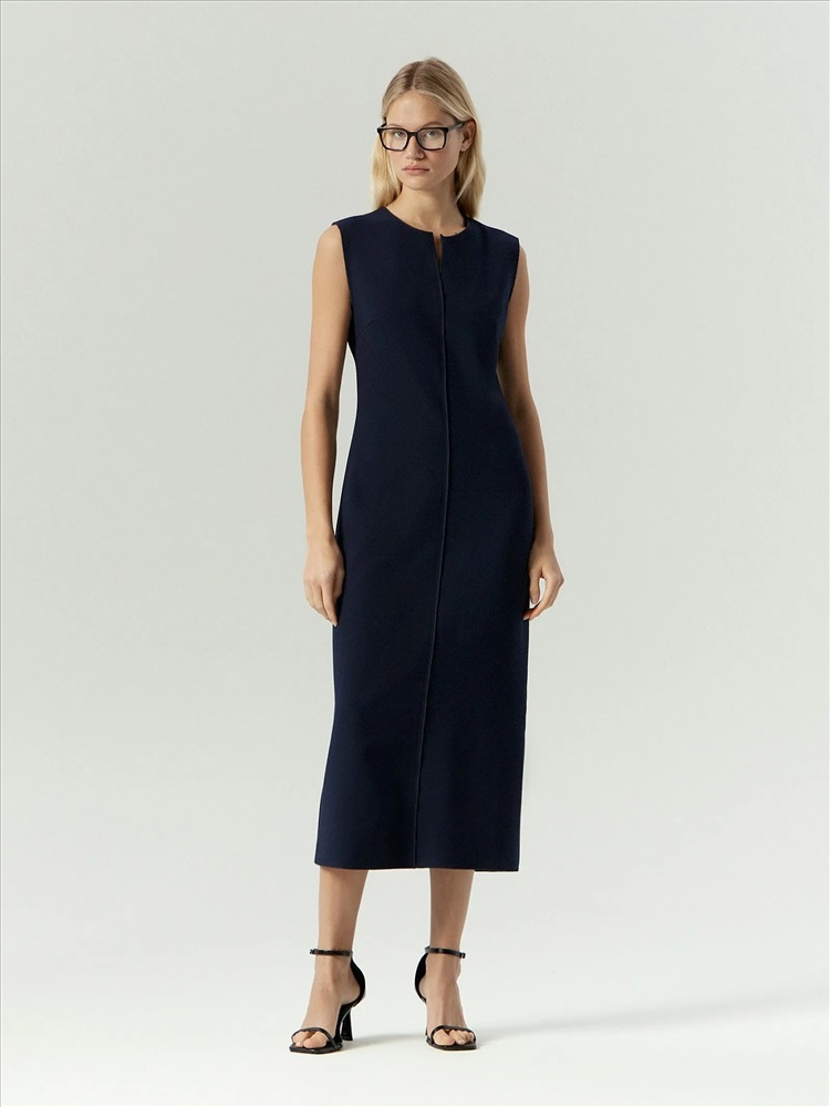 Платье-футляр из костюмной ткани в синем цвете станет отличным вариантом на каждый день. За счёт добавления эластана материал тянется и комфортно садится, а высокое содержанием вискозы делает его приятным к телу. Приталенную модель без рукавов отличает акцентный шов. Модель выполнена в длине мидакси, которая не теряет актуальности и подходит к любому случаю.