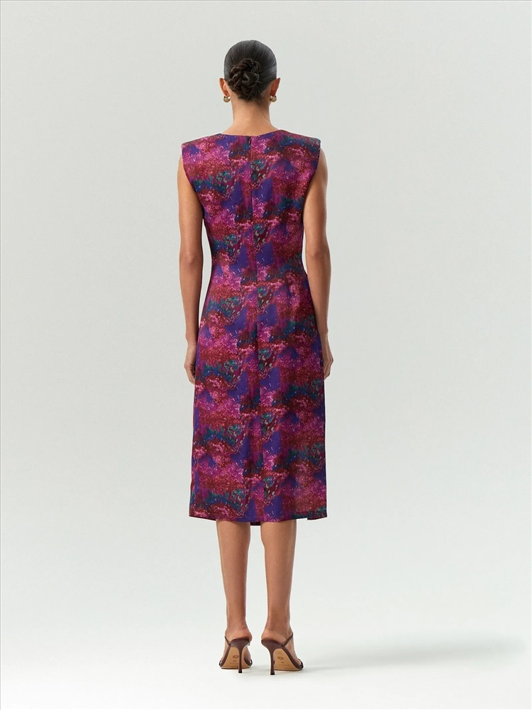 Платье к особому случаю для тех, кто не боится быть ярче. Глубокие, насыщенные, мощные цвета — индиго, пурпурный, бирюзовый, соединились в гипнотическом принте. Фасон выдержан в рамках лаконичной классики. Уплотнённая и структурированная область плеч делает силуэт графичнее. Разрез от середины бедра отдаёт дань трендам года. Защип с одной стороны скрывает область живота. Высокая пройма закрывает область подмышек и линию бюстгальтера. Сделано из приятной на ощупь, нежной вискозы и дополнено подкладкой. Застёгивается на молнию.