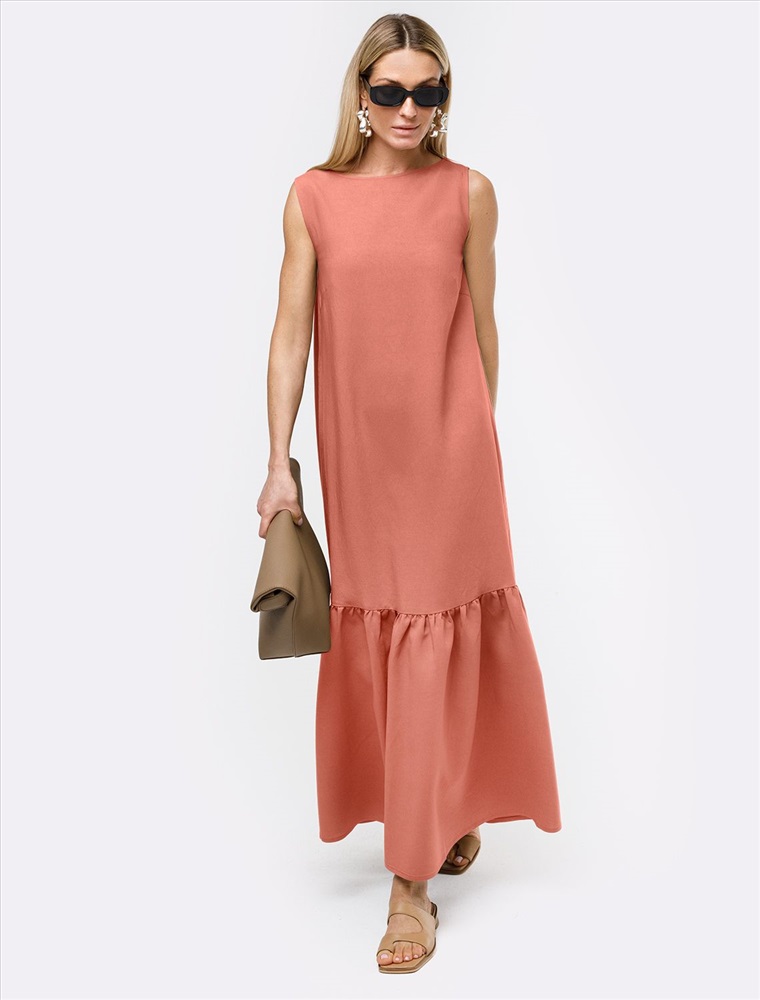 Параметры модели на первом фото: Рост 170, бюст 89, талия 63, бедра 92 Платье с горловиной формы лодочка выполнено из плотного лиоцелла. Модель прямого кроя дополнена пышным воланом снизу, изысканно развивающемся на ходу. Ткань хорошо держит форму, плавно драпируется и не просвечивает. В теплое время года приятно охлаждает кожу. Добавление синтетических волокон в составе изделия, предотвращает сминаемостьи поддерживает формоустойчивость.