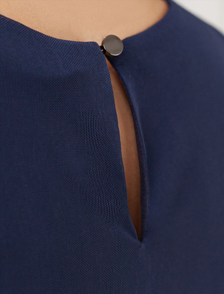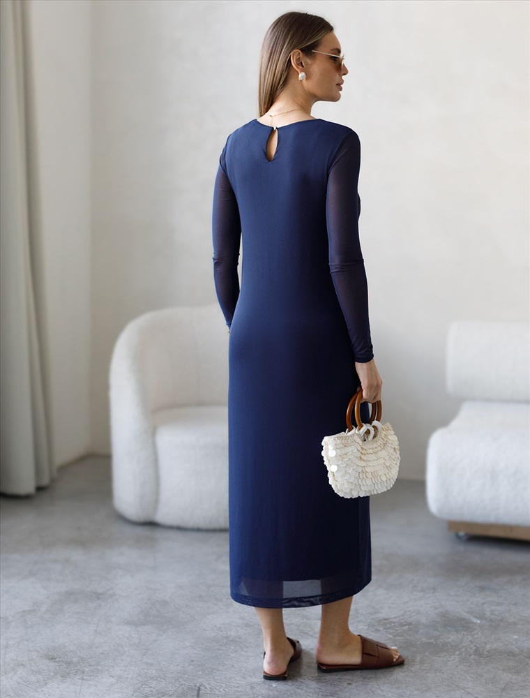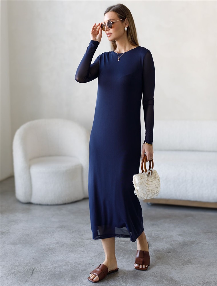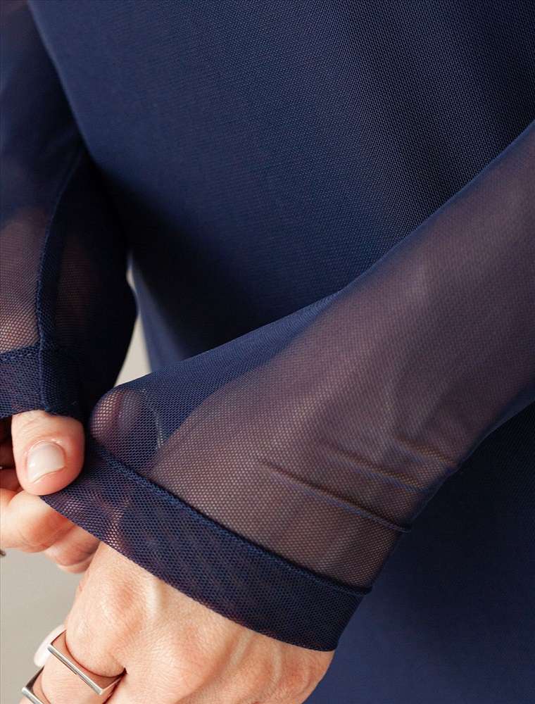 Модель выполнена из воздушной сетчатой ткани с вискозной подкладкой, которая подчеркивает фигуру. Прямой крой создает стройный силуэт. Богатый темно-синий цвет создает эффект глубины и роскоши. Прозрачные рукава добавляяют образу пикантности. Идеально подходит как для вечерних выходов, так и для повседневного образа.