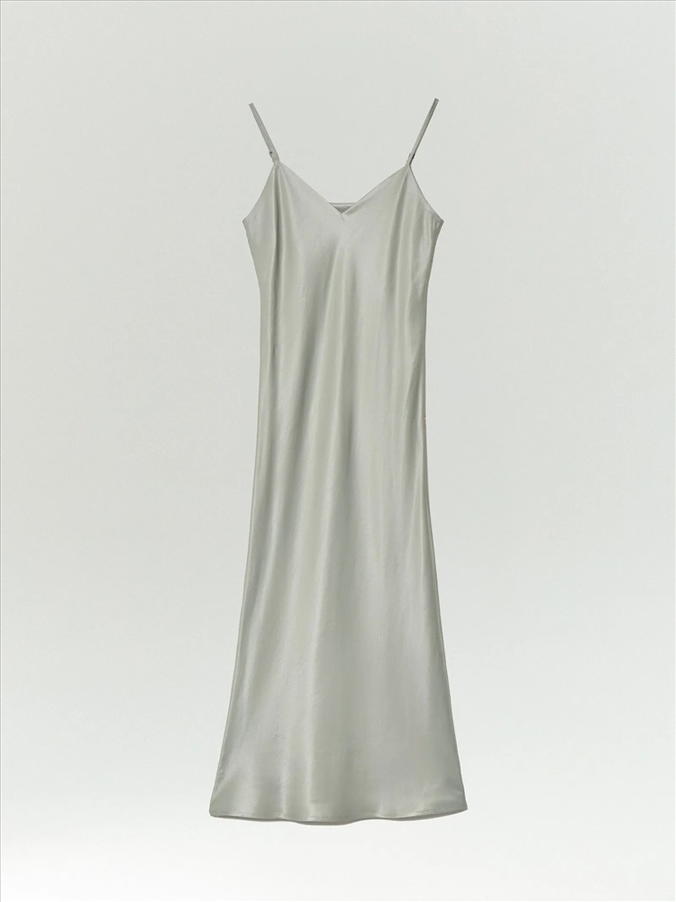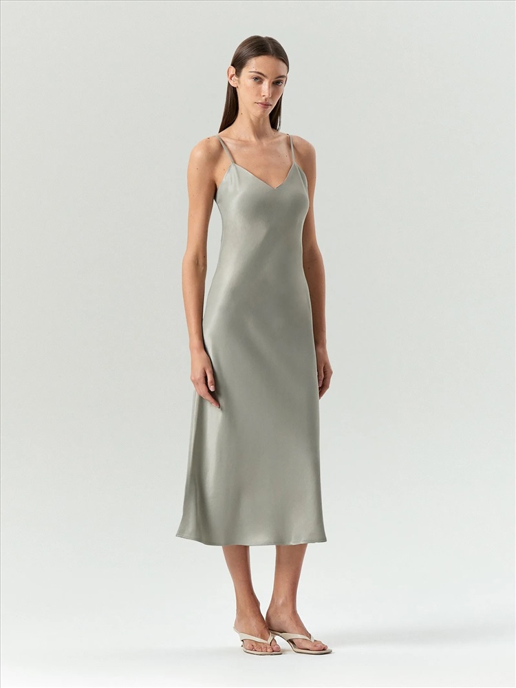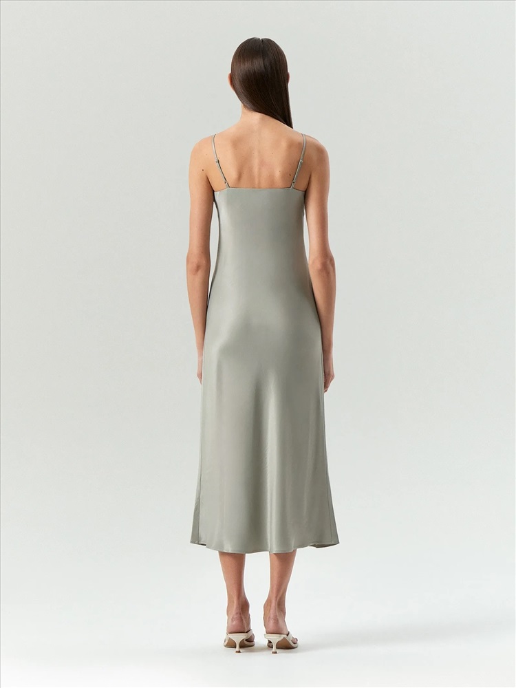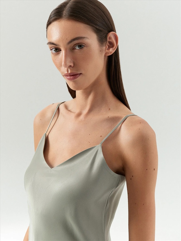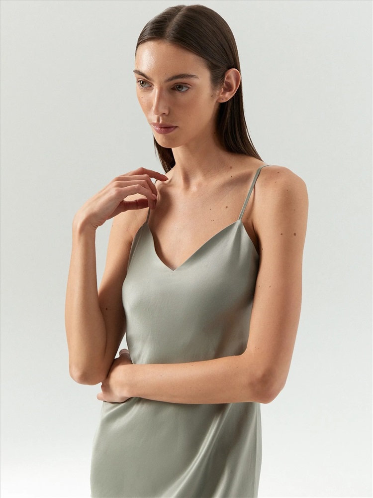 Комбинация в актуальном оттенке между фисташкой и шалфеем. Приталенная модель с деликатным треугольным вырезом подчеркнет красоту зоны декольте, шеи и плеч. Длина миди располагает к сочетанию с обувью на высоком каблуке. Платье подходит для создания роскошных праздничных образов. В повседневных образах будет выигрышно смотреться с разнообразными жакетами и куртками, в том числе из кожи и экокожи. Выполнено из струящейся вискозы, без подкладки.