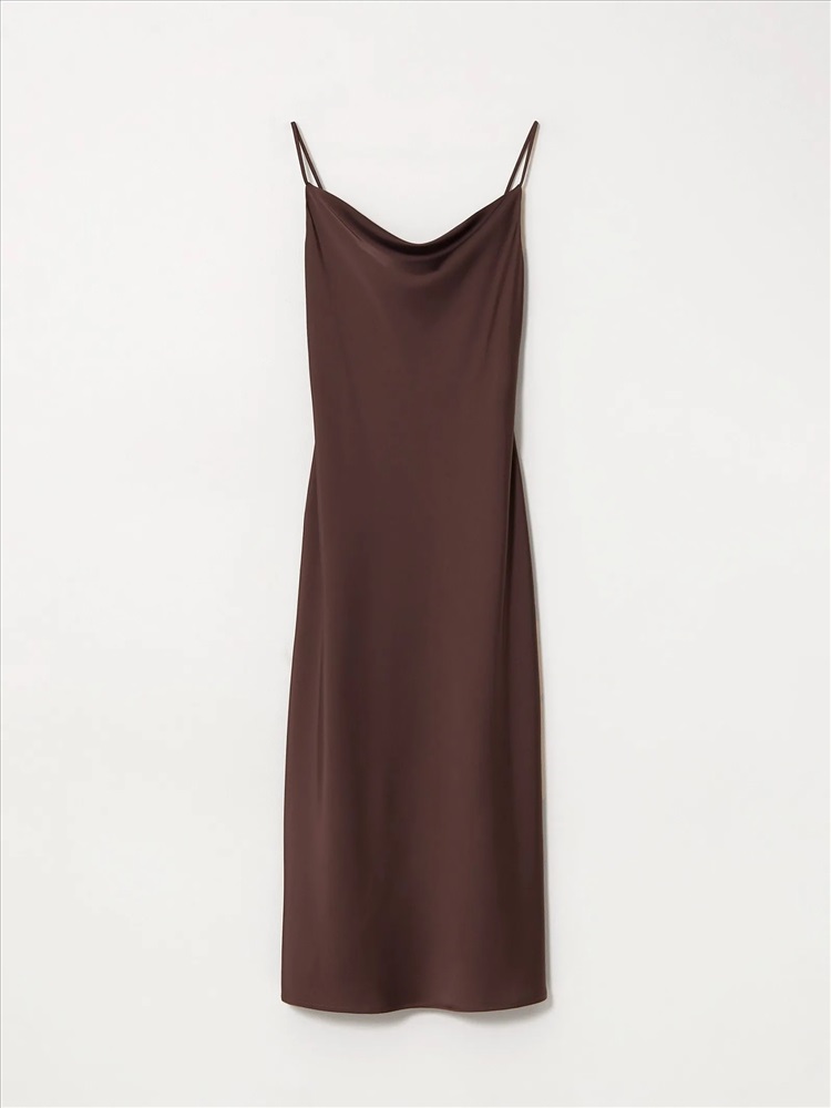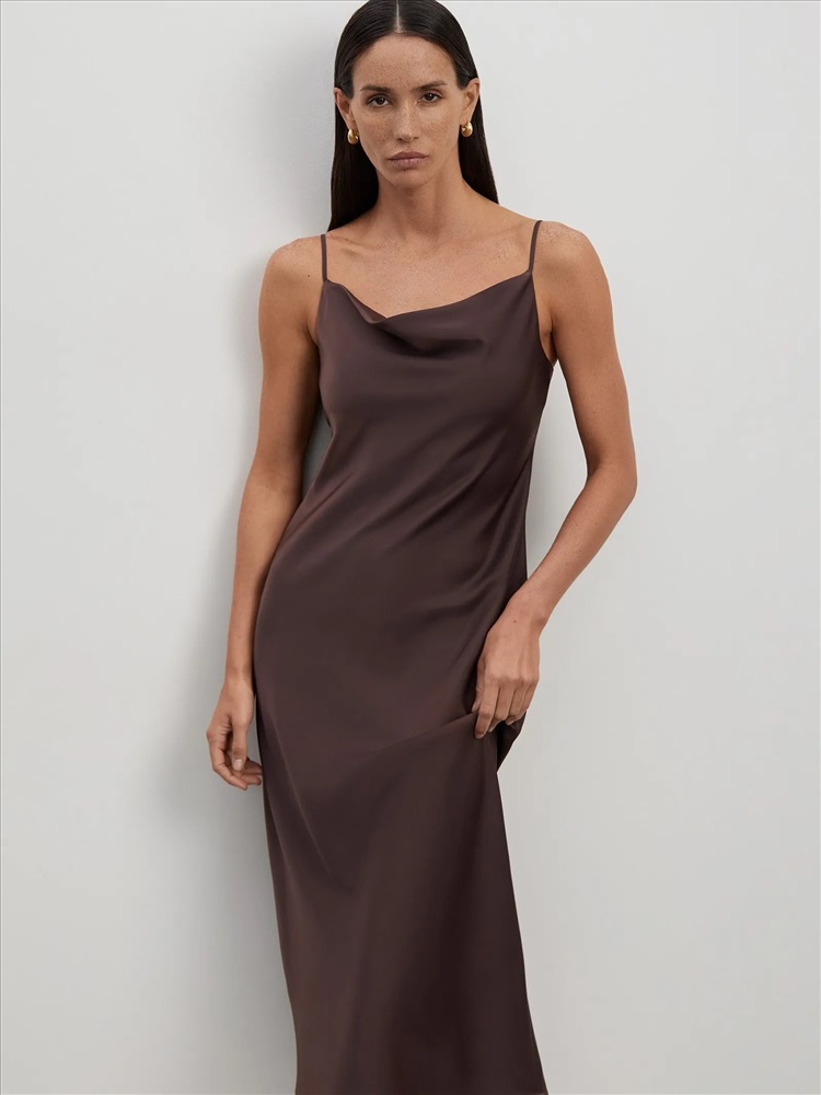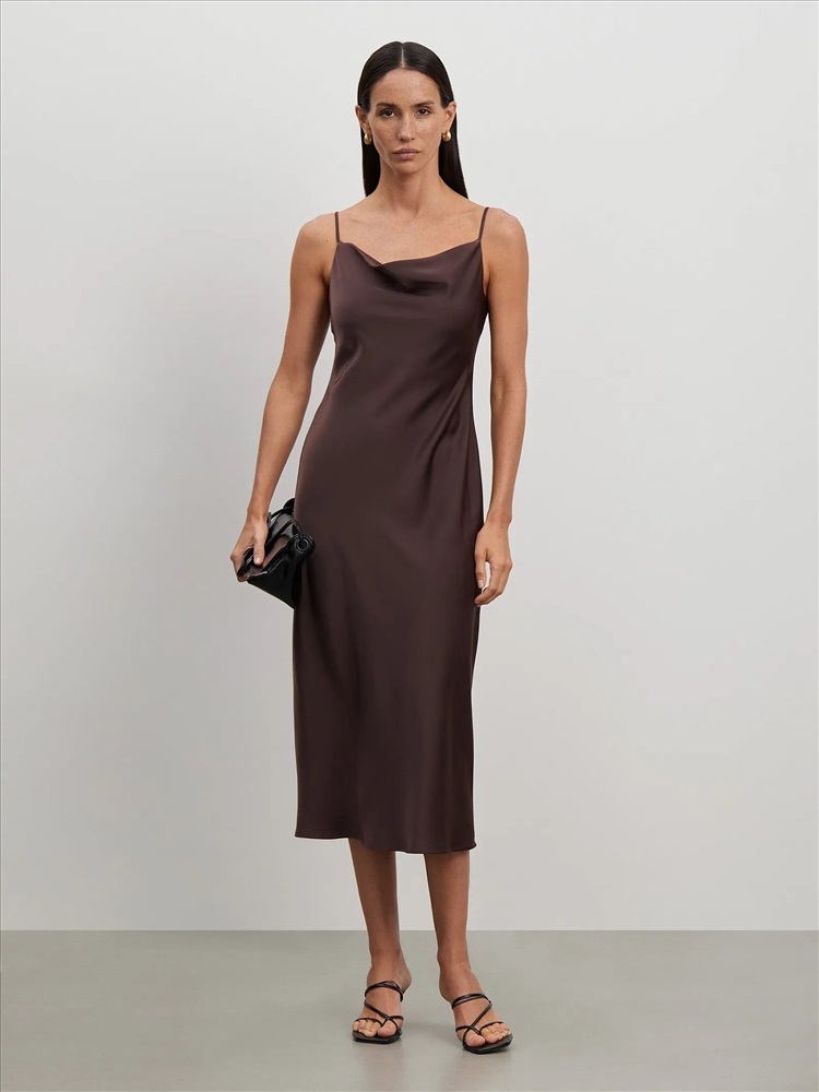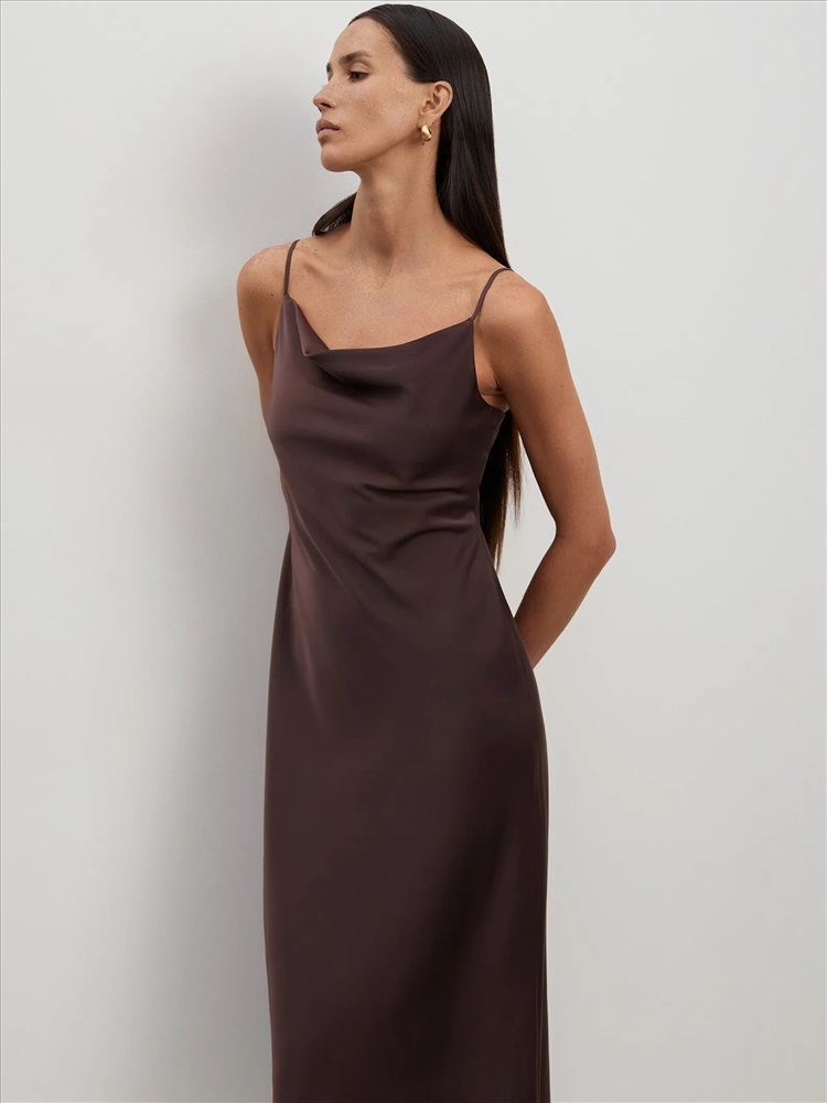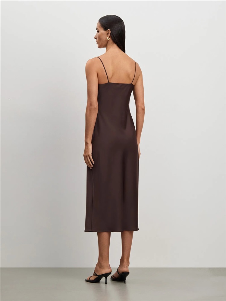 Платье-комбинация в цвете горького шоколада. Выполнено из струящегося материала с содержанием вискозы. Платье на тонких бретелях эффектно открывает спину. Акцент на зоне декольте создаёт вырез-качелька. Модель приталенного силуэта в длине миди выгодно подчеркнёт фигуру. Подойдёт для праздника и творческих мероприятий, а также впишется в повседневные образы в паре с жакетом или кардиганом. Платье можно стилизовать с объёмным кардиганом и обувью на плоском ходу или с однотонным жакетом и босоножками на высоком каблуке.