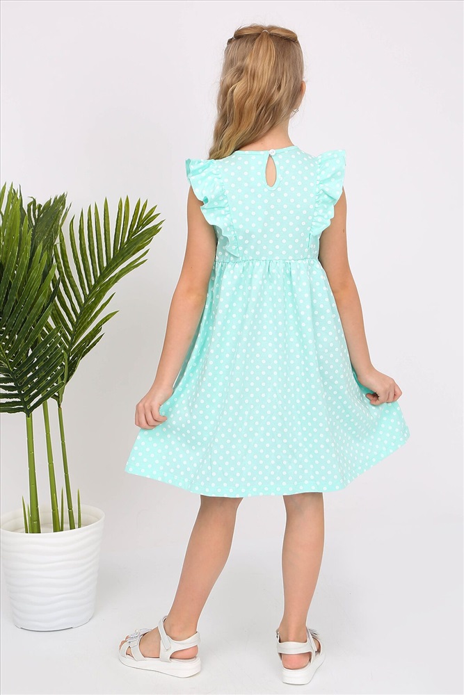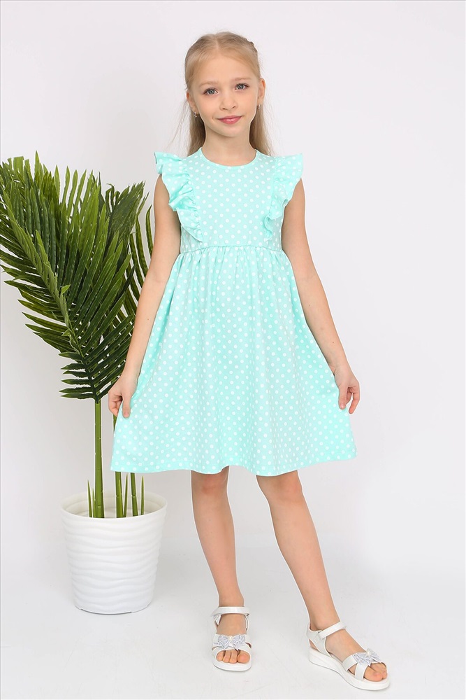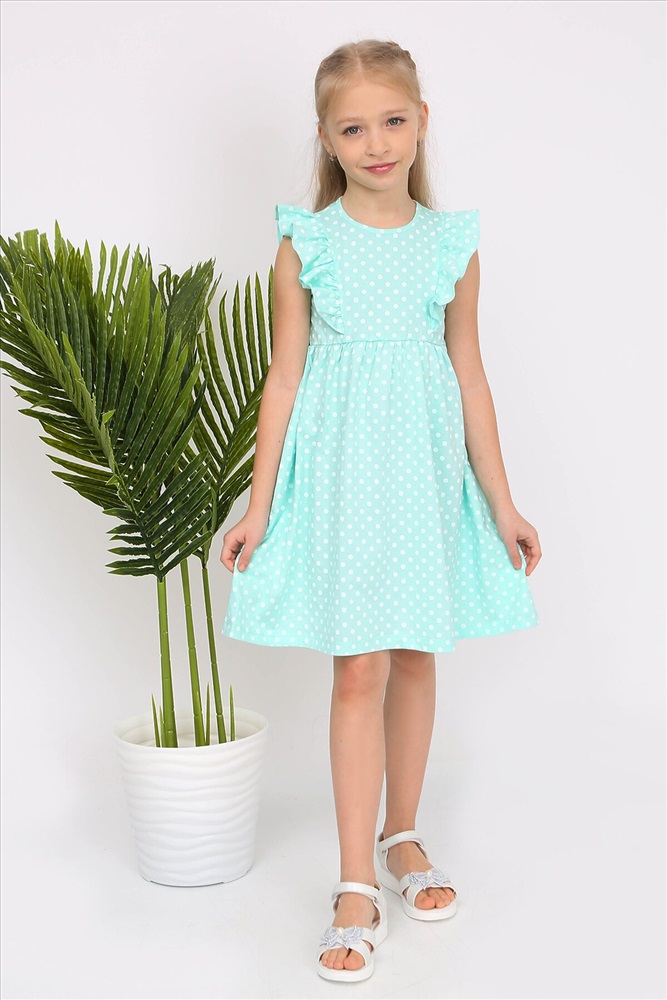 Платье из кулирки. Силуэт приталенный с юбкой на сборке. Спереди и на спинке рельефы с оборками, без рукава, горловина и проймы окантованы, на спинке капелька с пуговицей. Подходит для жаркой погоды.