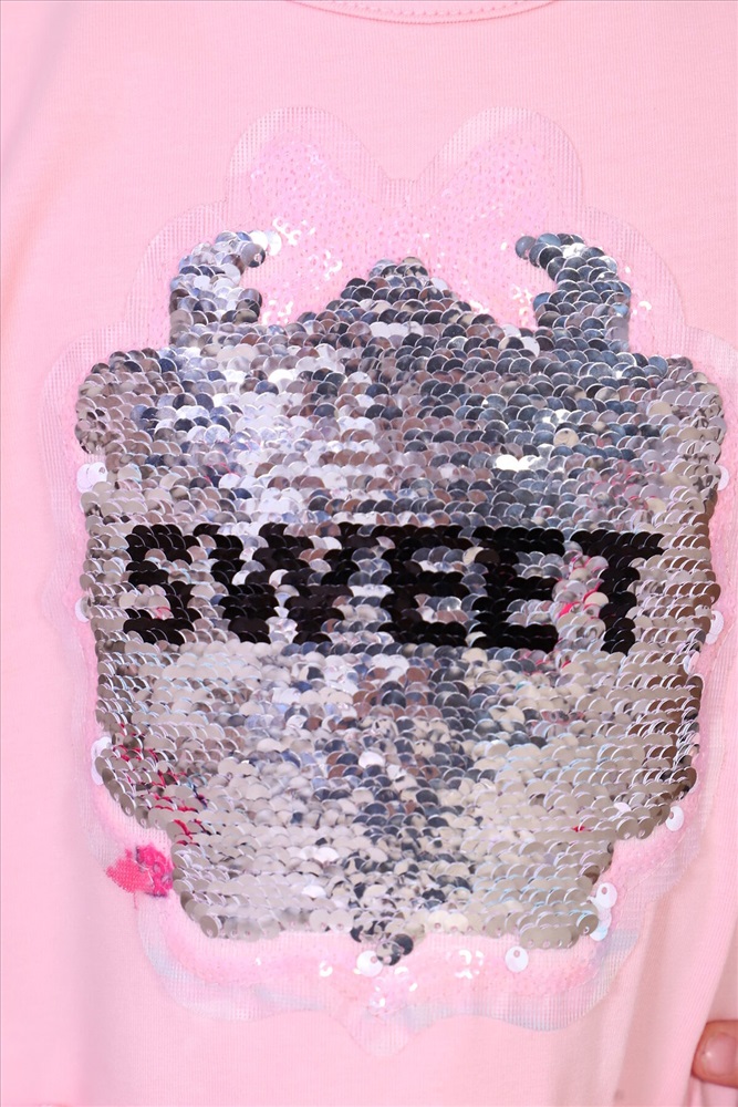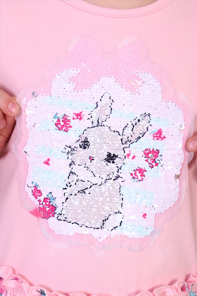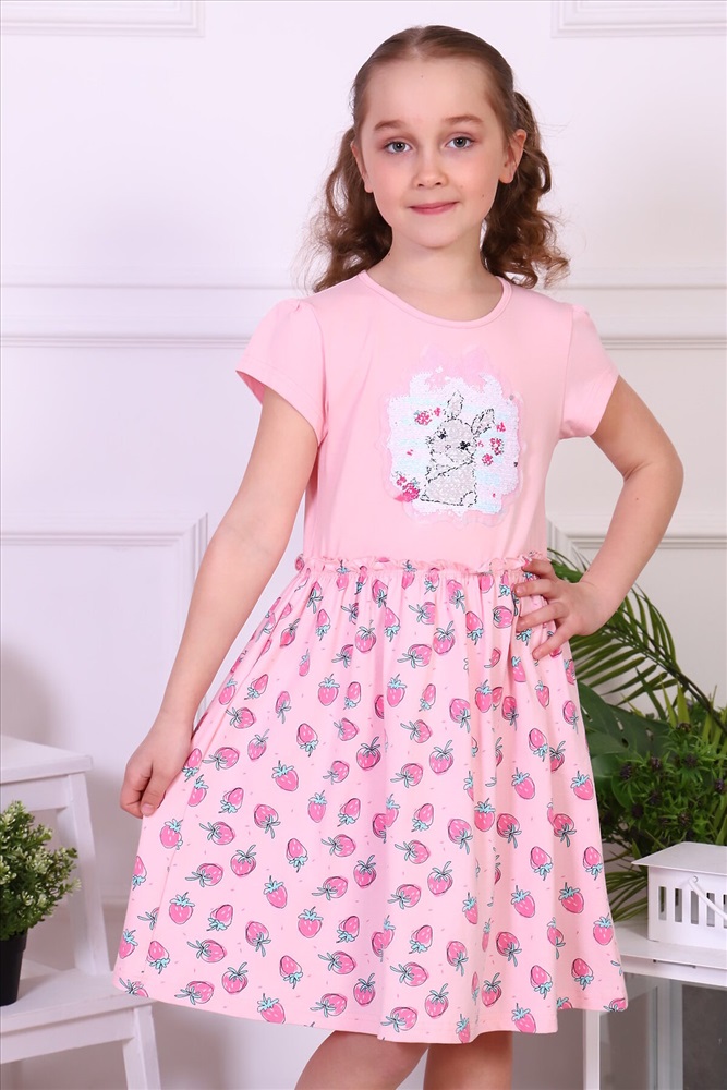 Платье для девочек дошкольного и младшего школьного возраста, из набивного и однотонного трикотажного полотна кулирка с лайкрой. Верхние части переда и спинки и рукава выполнены из однотонного полотна, нижние части переда и спинки - из набивного. Платье прилегающего силуэта, отрезное и расклешенное от линии талии, с втачным коротким рукавом. Нижние части переда и спинки присборены на резинку. Верхние срезы нижних частей переда и спинки обметаны и настрочены на верхние части переда и спинки, с образованием рюшки по линии талии. Низа рукавов и изделия подогнуты. Горловина окантована. На верхней передненй части настрочена декоративная нашивка.