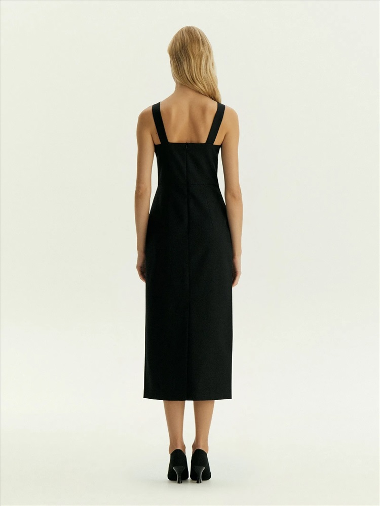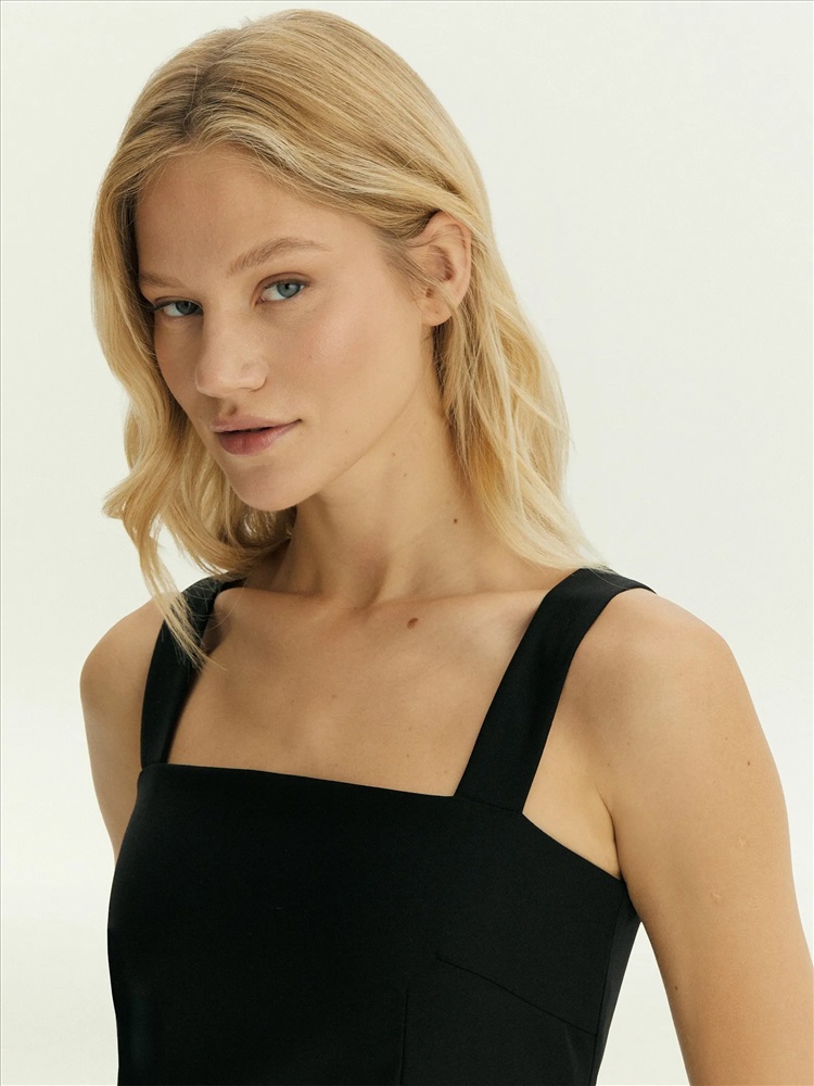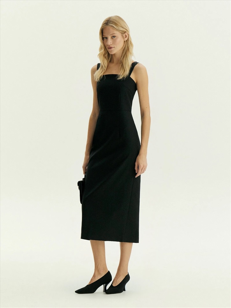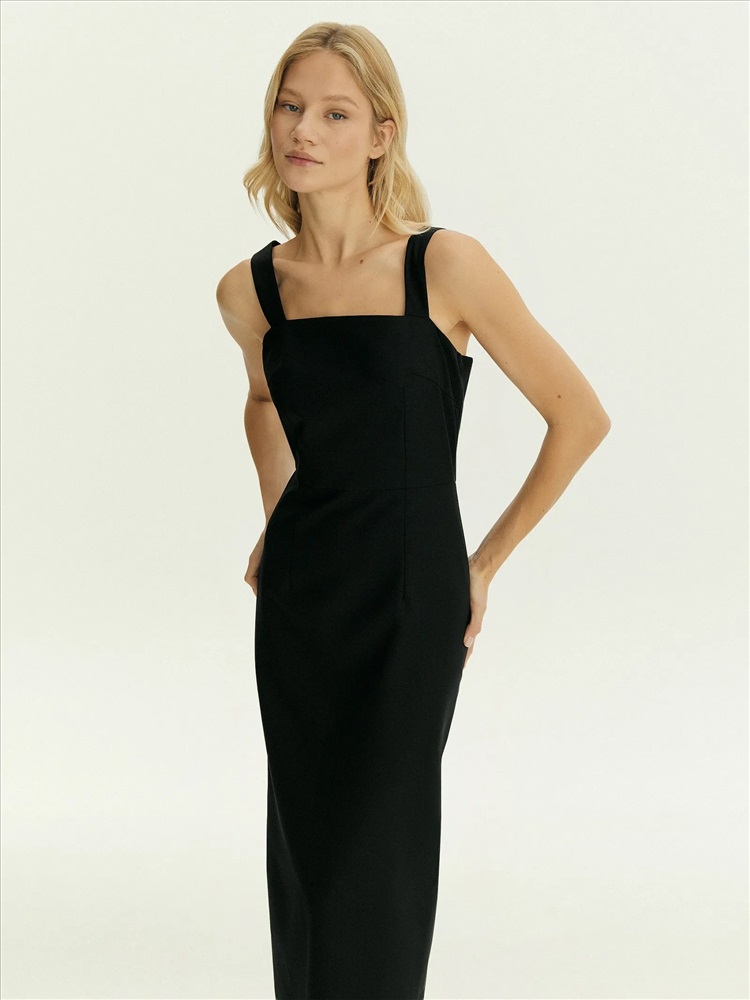 Незаменимое базовое платье в чёрном цвете. Тонкая и лёгкая ткань почти наполовину состоит из натуральной шерсти: то, что нужно на демисезон, прохладное лето, зиму. Платье одинаково хорошо и в офисных, и в коктейльных образах. Удобная модель без рукавов, на широких бретелях идеальна под жакеты. Открытая спина делает образ более эффектным. Приталенное платье-футляр в длине миди без лишнего декора поддержит дресс-код днём, подчеркнёт достоинства фигуры вечером. Вытачки визуально формируют и вытягивают силуэт, а отрезная талия корректирует область живота. Разрез со шлицей сзади усиливает динамику образа. Изделие застёгивается на молнию сзади. Платье может стать частью капсулы с топом и юбкой laine. Можно носить с тонкими лонгсливами нашей новой коллекции или любыми базовыми боди.