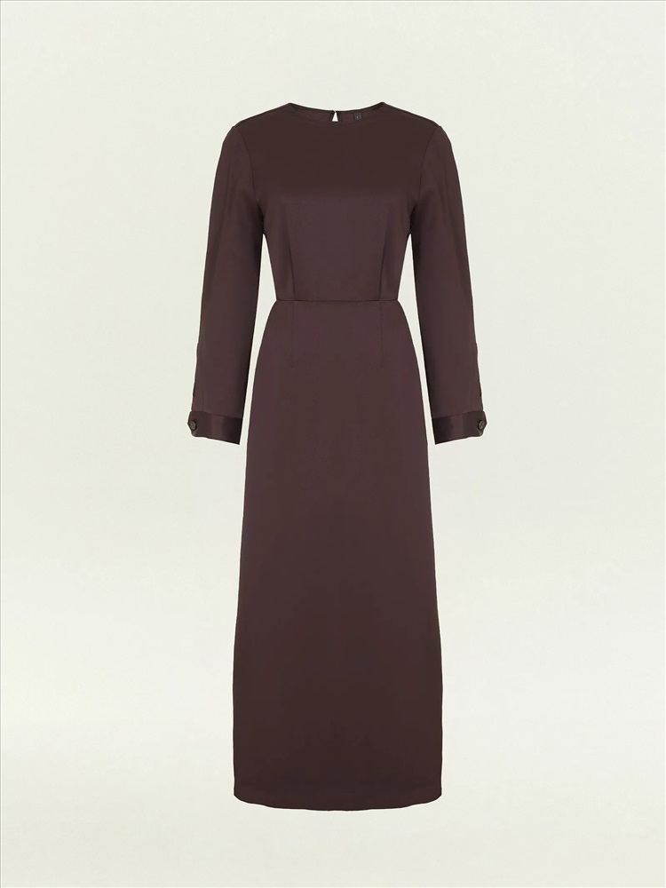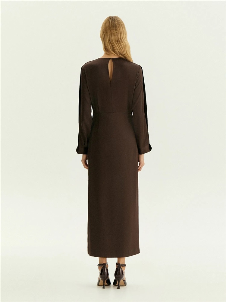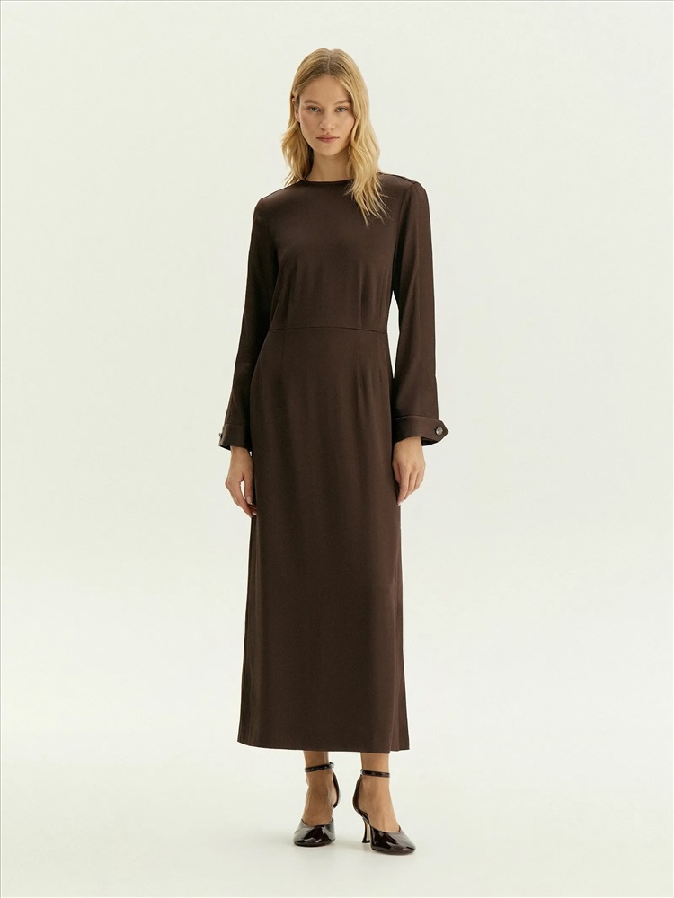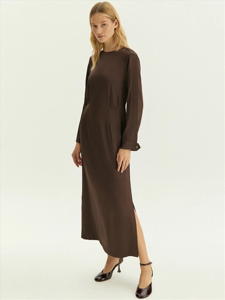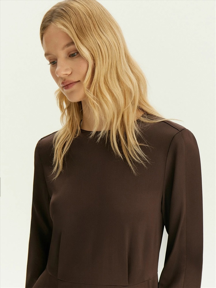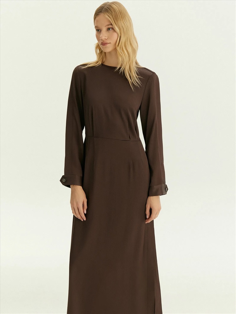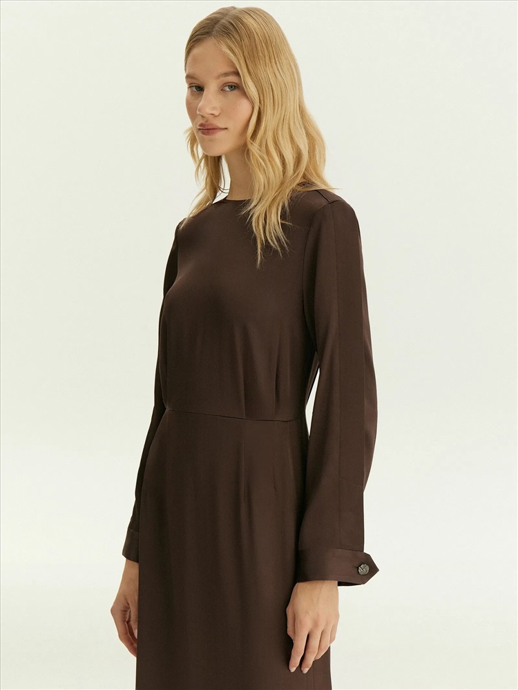 Платье в шоколадном цвете выполнено из струящегося материала с высоким содержанием вискозы. Это элегантный вариант на каждый день, который также будет достойно смотреться на деловых встречах, корпоративах, торжественных мероприятиях и праздниках. Модель миди с отрезной талией, длинным рукавом и круглым вырезом красиво садится по фигуре. Изделие выполнено без подкладки.