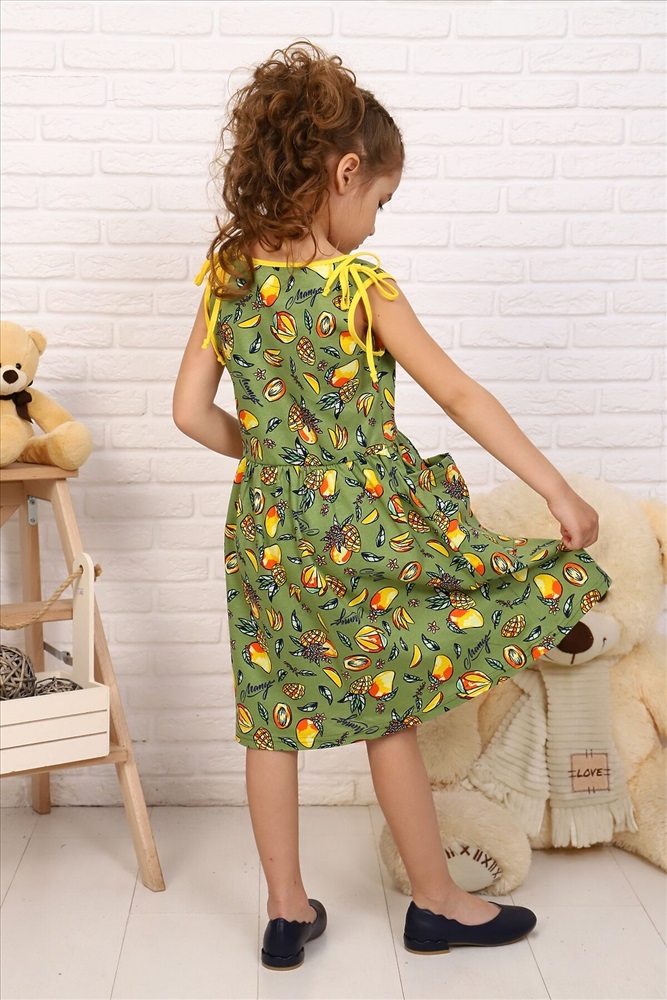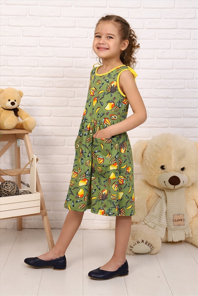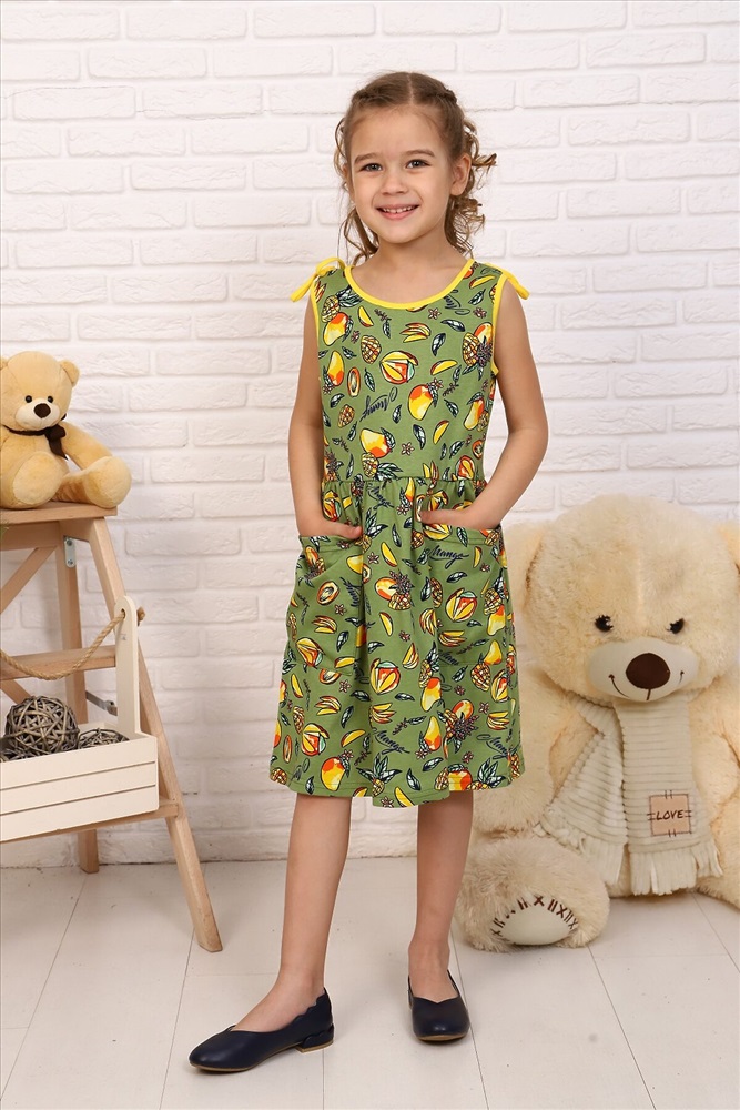 Страна производства: Россия Платье в десткий сад или на прогулку для девочек дошкольного и младшего школьного возраста, из трикотажного полотна кулирная гладь с рисунком. Платье полуприлегающего силуэта, отрезное и расширенное от линии талии, без рукавов. Спереди на нижней части накладные карманы. По плечевым швам настрочены завязки из окантовочной ленты. Низ изделия подогнут. Горловина и проймы окантованы.