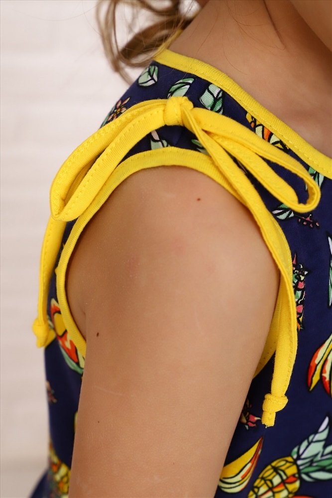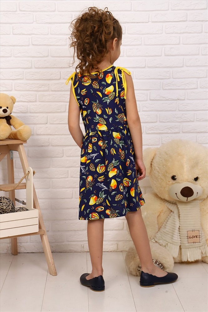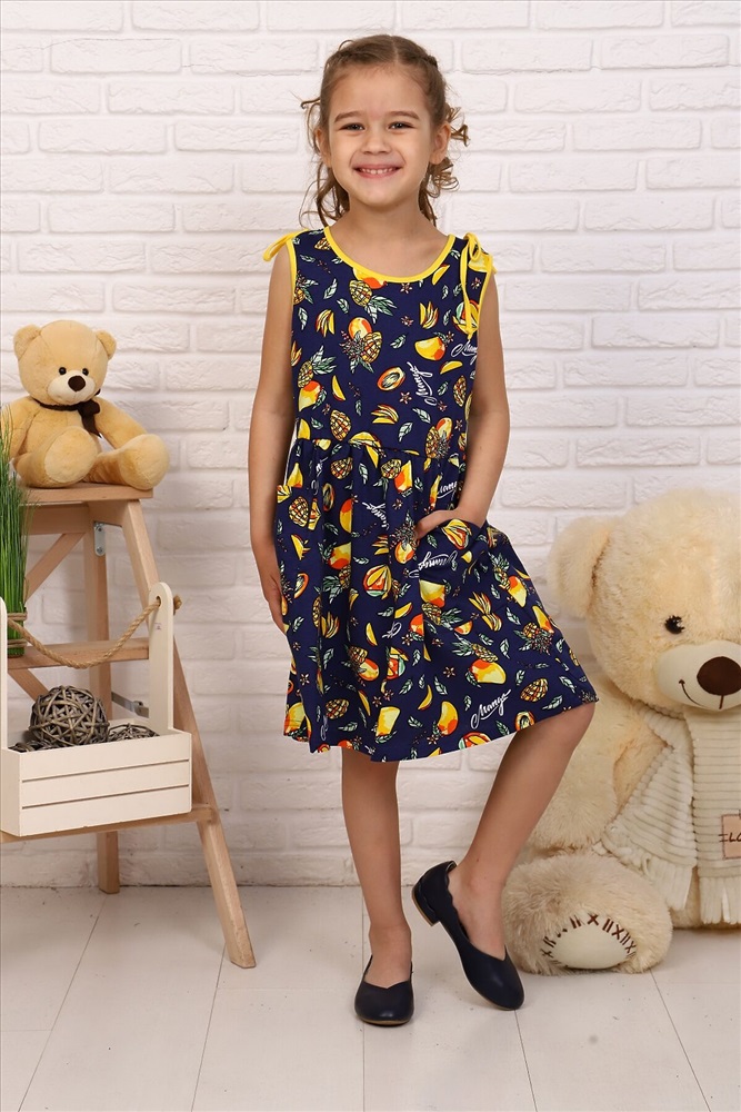 Платье в десткий сад или на прогулку для девочек дошкольного и младшего школьного возраста, из трикотажного полотна кулирная гладь с рисунком. Платье полуприлегающего силуэта, отрезное и расширенное от линии талии, без рукавов. Спереди на нижней части накладные карманы. По плечевым швам настрочены завязки из окантовочной ленты. Низ изделия подогнут. Горловина и проймы окантованы.