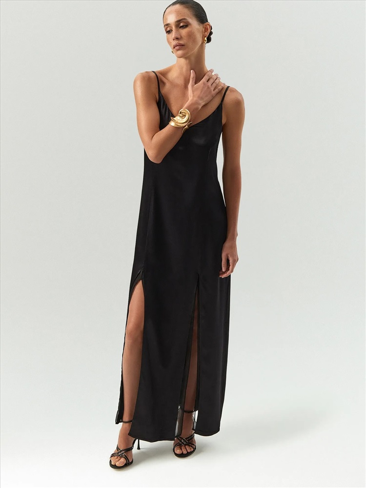 Длинное платье-комбинация в чёрном цвете создаст выразительный образ без лишних деталей. Минималистичная модель дополнена лишь летящим нижним слоем из шифона и разрезами, которые добавляют динамики. Платье сделано из соблазнительно нежной вискозы. Застёгивается на молнию сбоку.
