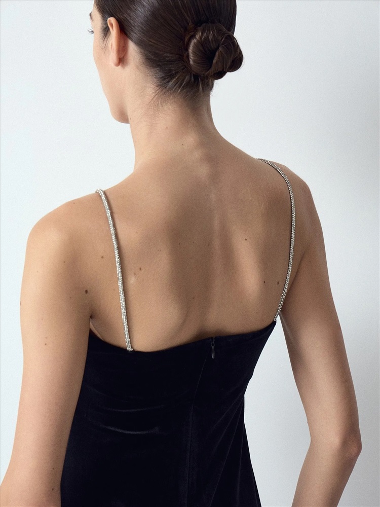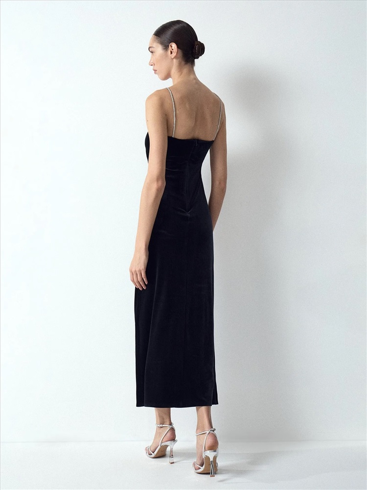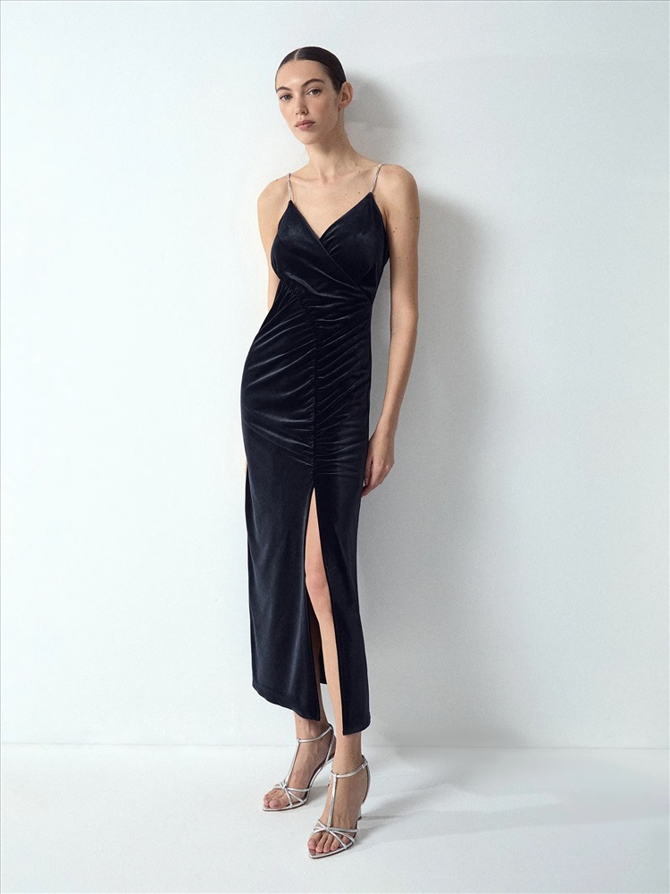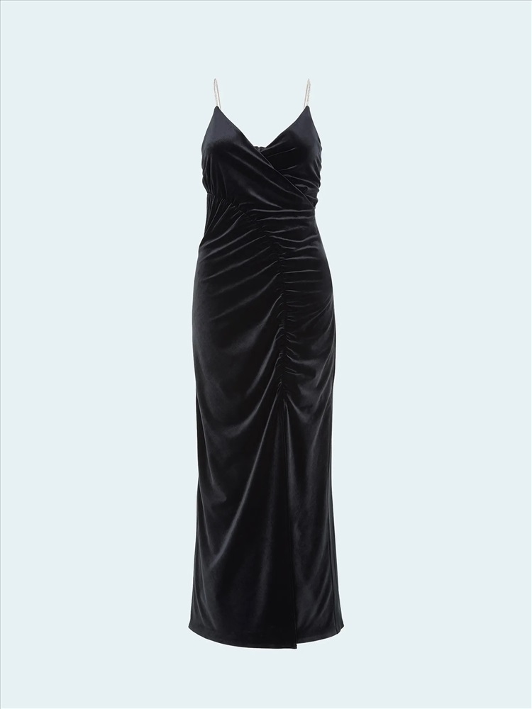 Бархатное платье станет элегантным выбором к особому случаю. Сверкающие акцентные бретели позволяют не использовать дополнительных аксессуаров. Драпировка выполнена так, чтобы визуально корректировать область талии и живота, скрывая определённые нюансы. Платье красиво смотрится и в маленьких, и в больших размерах. Эластичный материал делает посадку ещё более комфортной. Модель маломерит на один размер.