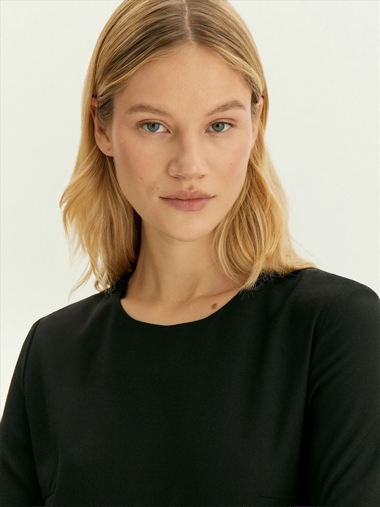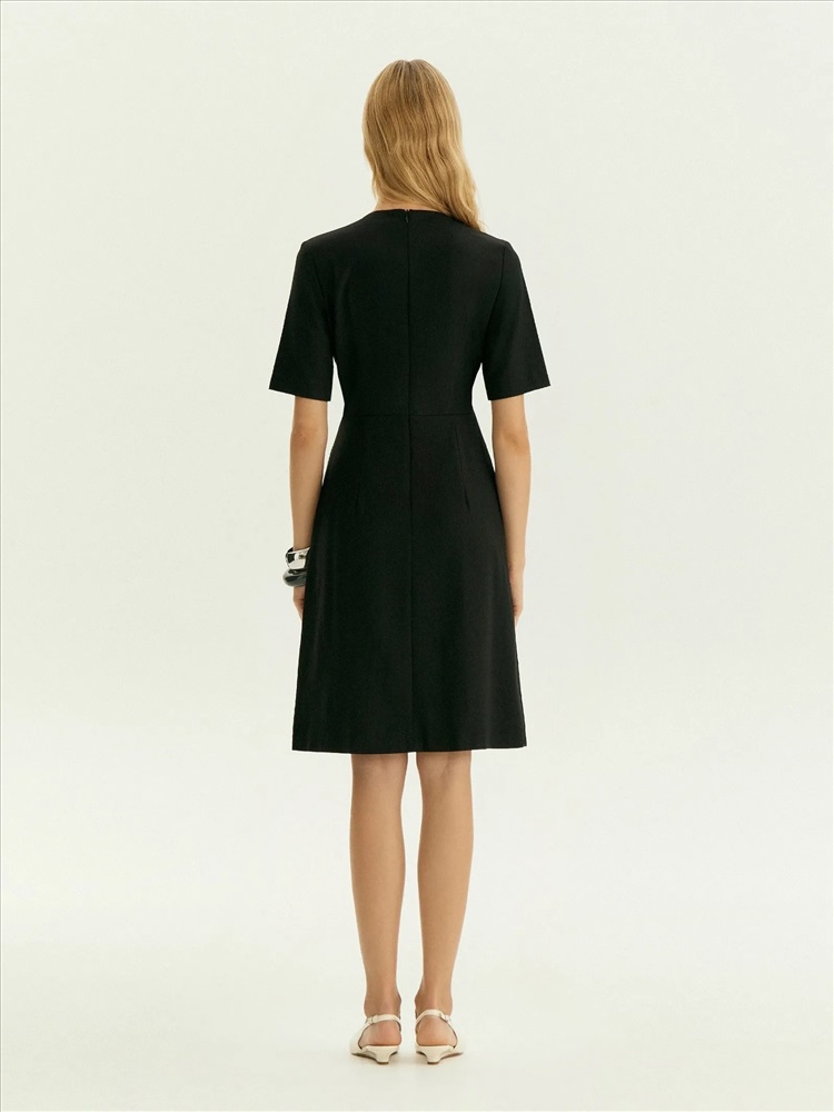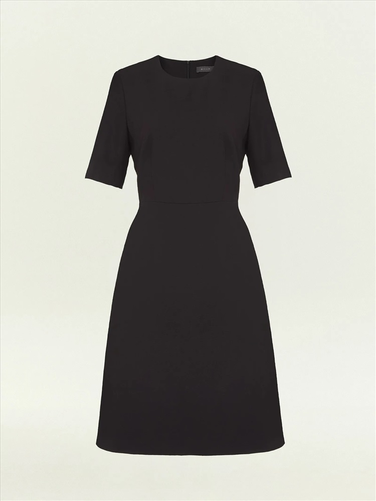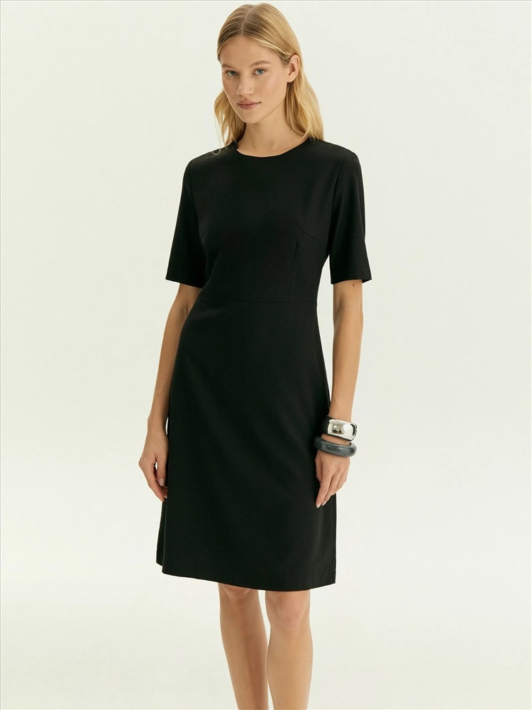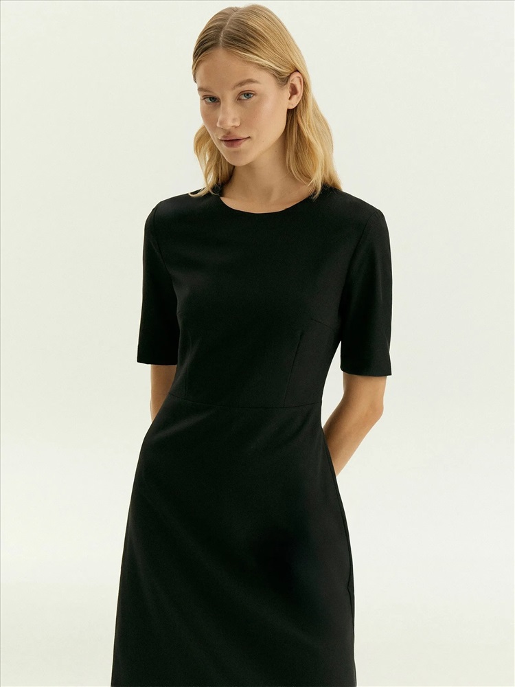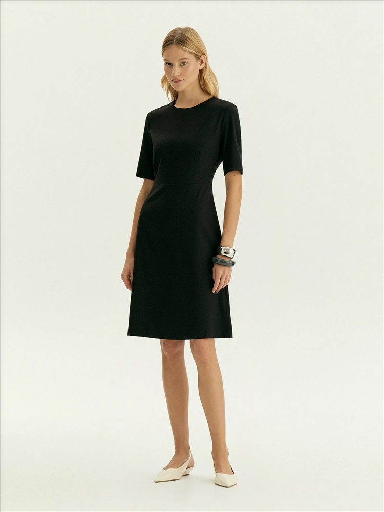 Чёрное платье A-силуэта чуть выше колена отлично подойдёт для повседневных и офисных образов. Выполнено из практичного материала с содержанием шерсти и с добавлением эластана, хорошо садится по фигуре. Изготовлено на приятной к телу подкладке из вискозы.