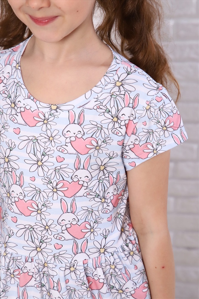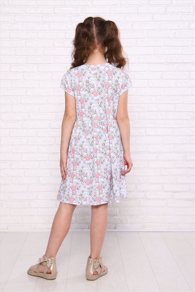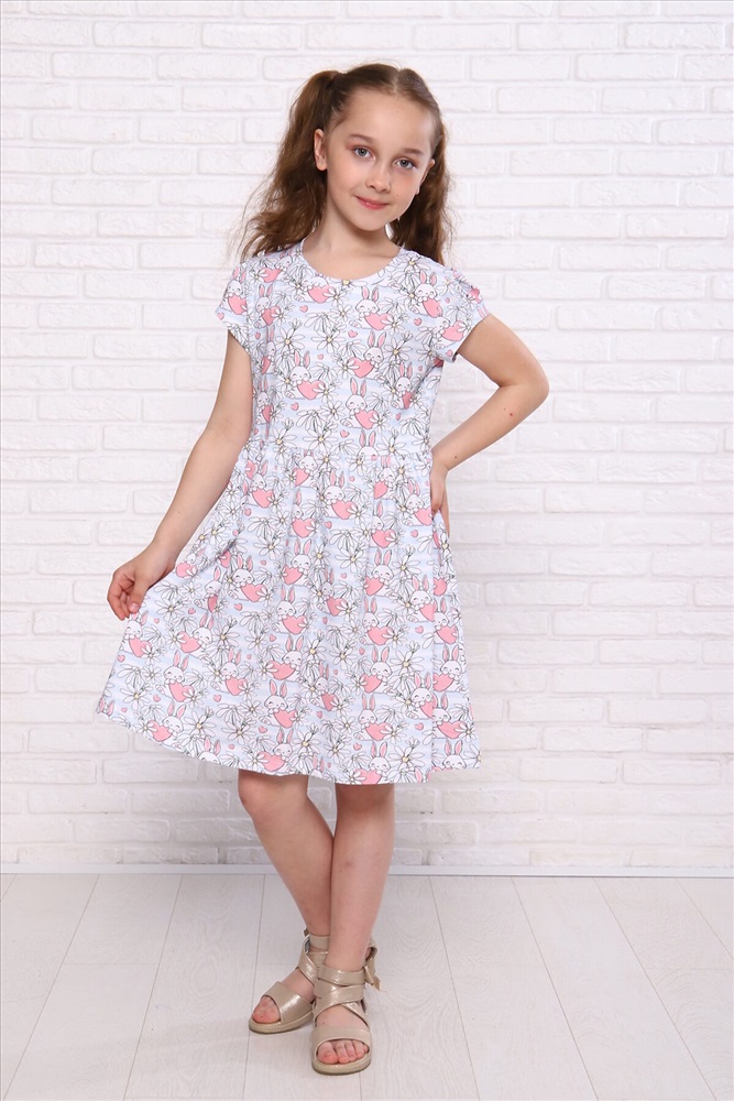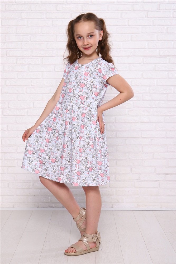 Страна производства: Россия Повседневное платье в детский садик или на прогулку для девочек дошкольного и младшего школьного возраста, из трикотажного полотна кулирка с лайкрой с рисунком. Платье прилегающего силуэта, отрезное и расклешенное от линии талии, с втачным коротким одношовным рукавом, с обтачкой в горловине. По окату рукава небольшая сборка. Низа рукавов и нижней части платья подогнуты. По шву втачивания обтачки в горловину проложена отделочная строчка.