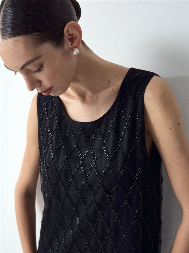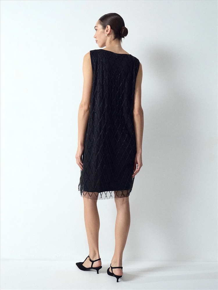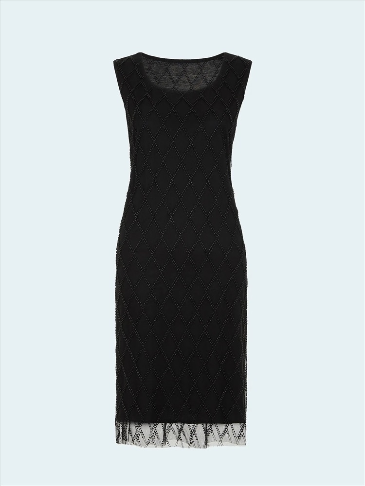 Платье создаст чарующий образ к особому случаю. Особую прелесть вещи обеспечивает воздушная органза на чёрном сатине, декорированная бисером и стеклярусом чёрного цвета. Простая и элегантная модель чуть выше колена, без рукавов и с круглым вырезом, смотрится очень достойно. Образ в стиле lady like можно дополнить перчатками и клатчем.