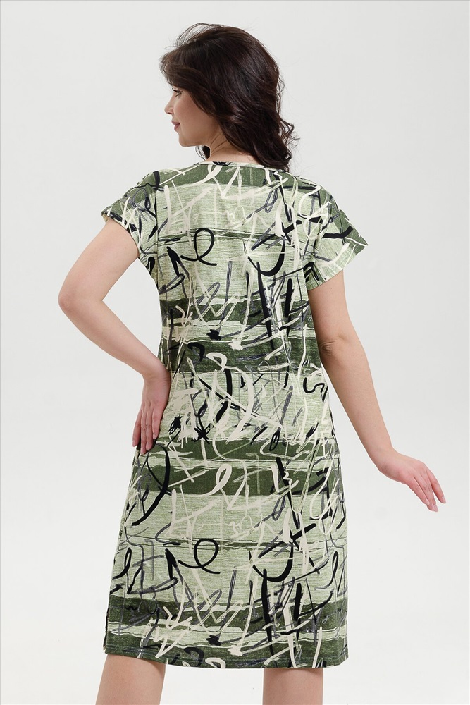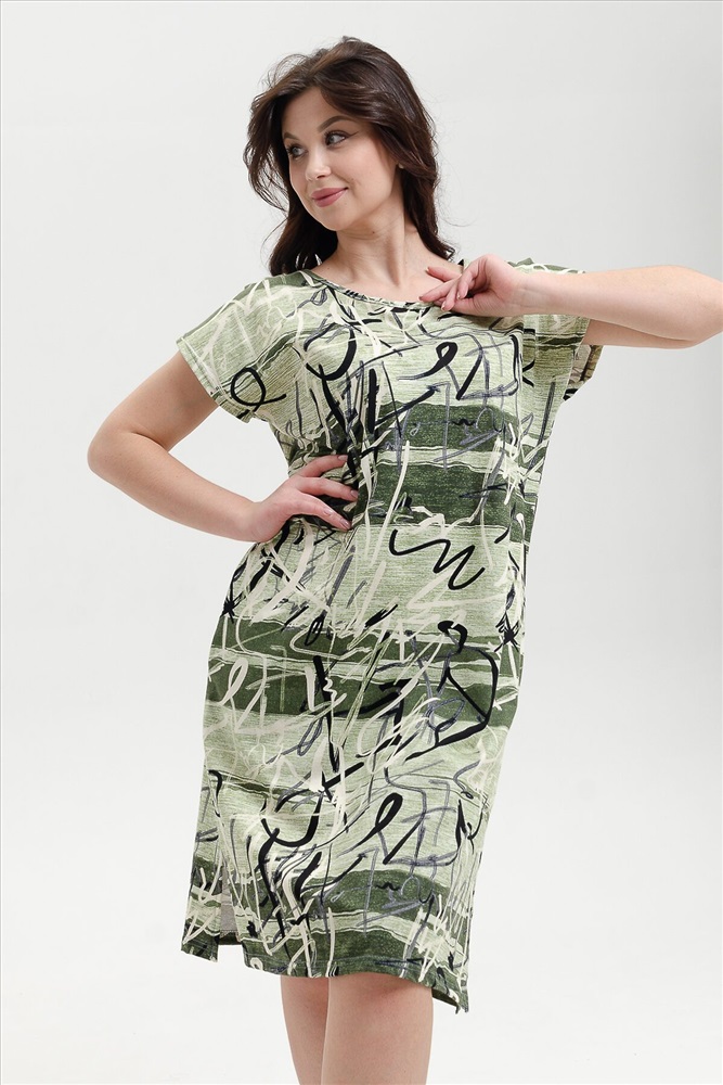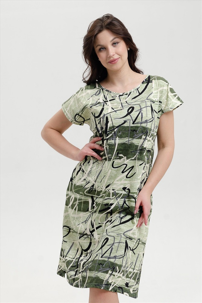 Страна производства: Россия Платье женское средней длины выполнено из кулирки 100% хлопок оригинальной расцветки. Рукав спущенный, в боках карманы, горловина обработана узким кантом.