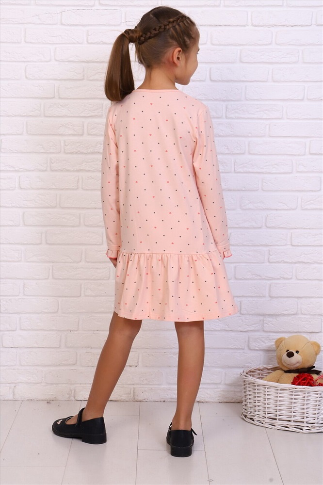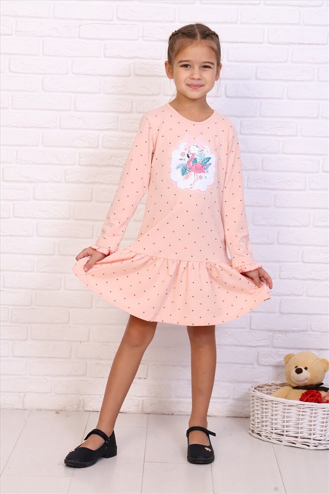 ID товара: 880832 Состав: 92% Хлопок, 8% Лайкра Сезон: Демисезон Длина: До колена Фасон: Трапеция Рукав: длинные Вырез горловины: Округлый Рисунок: Сердечки Декоративные элементы: Пайетки Основная ткань: Кулирка с лайкрой Стиль: повседневный Страна бренда: Россия Страна производства: Россия Платье для девочек дошкольного и младшего школьного возраста, из трикотажного полотна - кулирка с лайкрой с рисунком. Платье трапециевидного силуэта, с отрезным воланом по низу, с втачным рукавом, без застежки. Нижний волан присборен. Рукав длинный, одношовный, с рюшкой по низу. Горловина окантована. Низа рукавов и изделия подогнуты. Спереди настрочена декоративная нашивка. Комментарии к товару