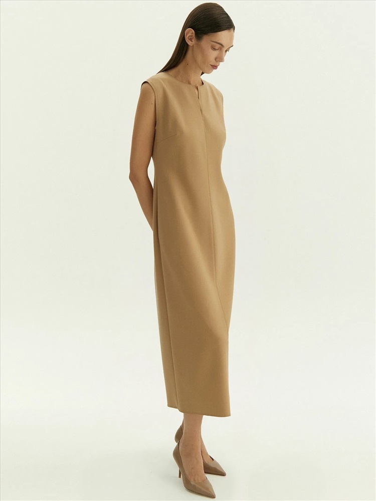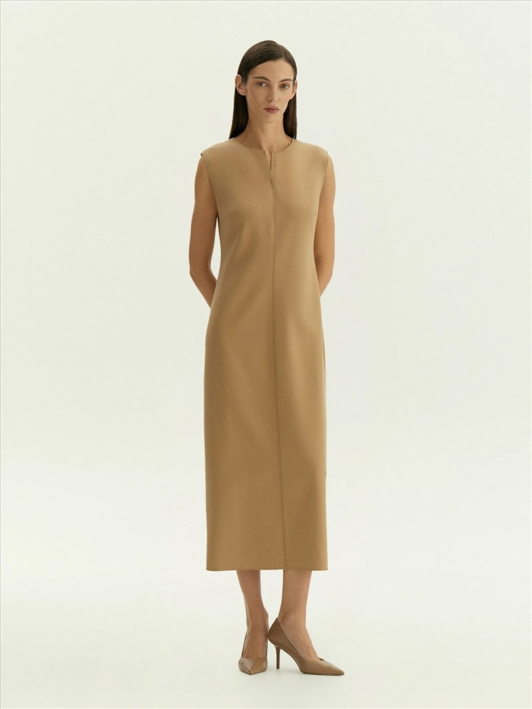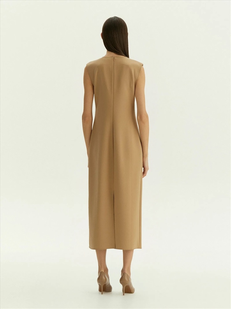 Платье-футляр из очень мягкого, приятного на ощупь трикотажа в телесно-бежевом цвете станет отличным вариантом на каждый день. Приталенную модель без рукавов отличает акцентный шов. Модель выполнена в длине мидакси, которая не теряет актуальности и подходит к любому случаю. Платье может стать частью капсулы с топом tucomo в том же стиле.