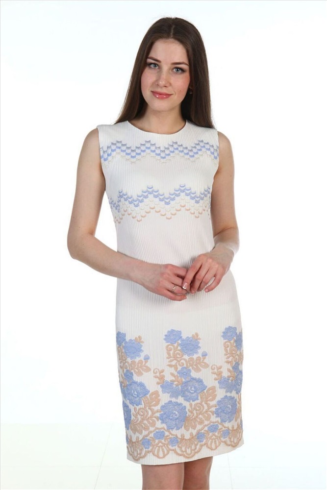 Простое и элегантное, оно является базовым элементом женского гардероба, на основе которого можно создавать множество разнообразных образов от делового до кокетливо-сексуального. Платье выполнено из трикотажного полотна. Платье цвета кремовый,голубой имеет подклад.