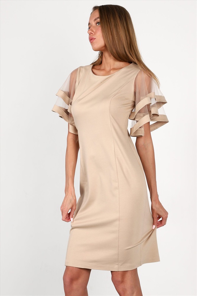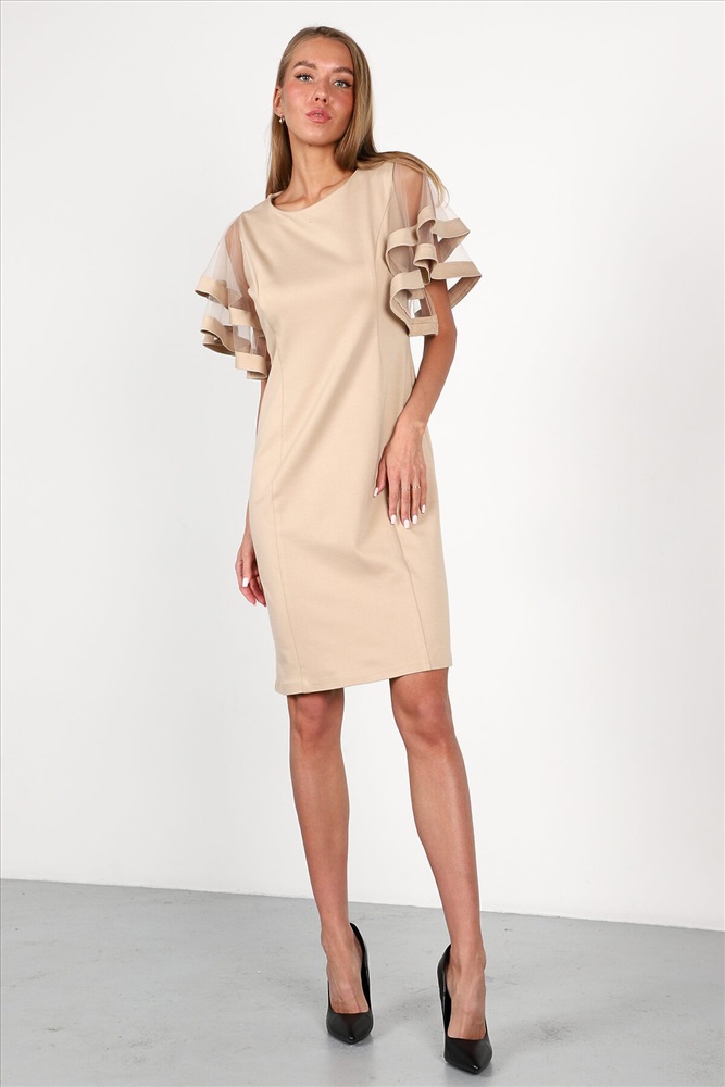 Платье-футляр полуприлегающего силуэта из плотного трикотажа подчеркнет изгибы фигуры. Вечернее платье, с оригинальными двойными рукавами-воланами из сетки - воплощение женственности и изысканности. Такое платье сделает каждую женщину королевой вечера.