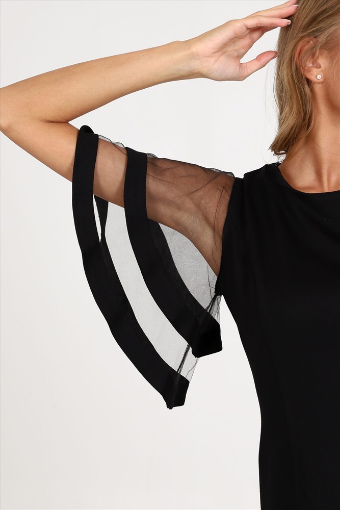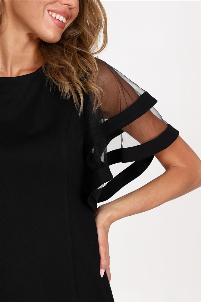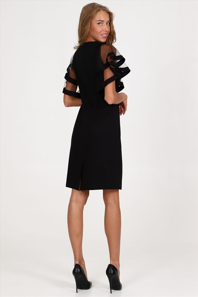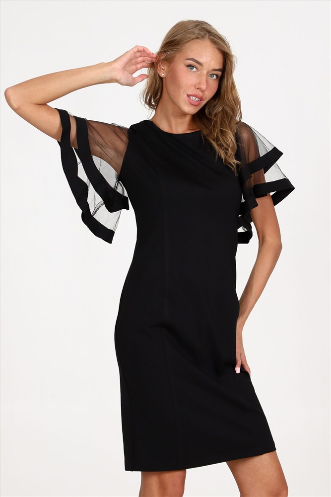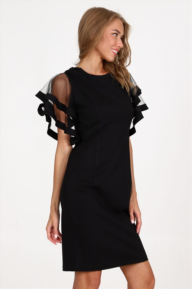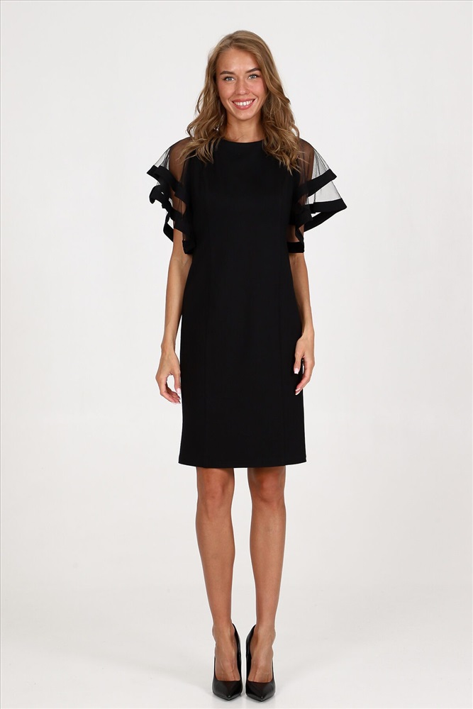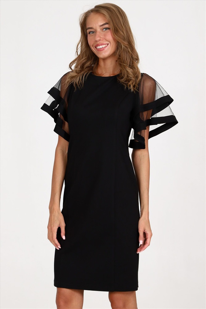 Платье-футляр полуприлегающего силуэта из плотного трикотажа подчеркнет изгибы фигуры. Вечернее платье, с оригинальными двойными рукавами-воланами из сетки - воплощение женственности и изысканности. Такое платье сделает каждую женщину королевой вечера.