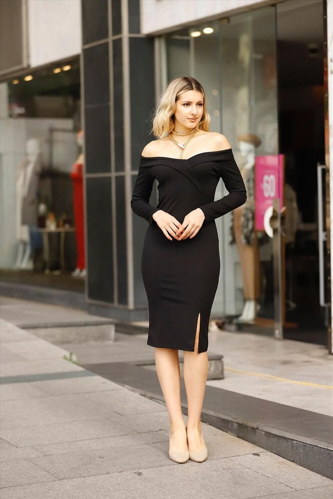 Застежка: без застежки Облегающее платье с открытыми плечами, с разрезом спереди длиной миди сделает вас неотразимой и привлекательной.
