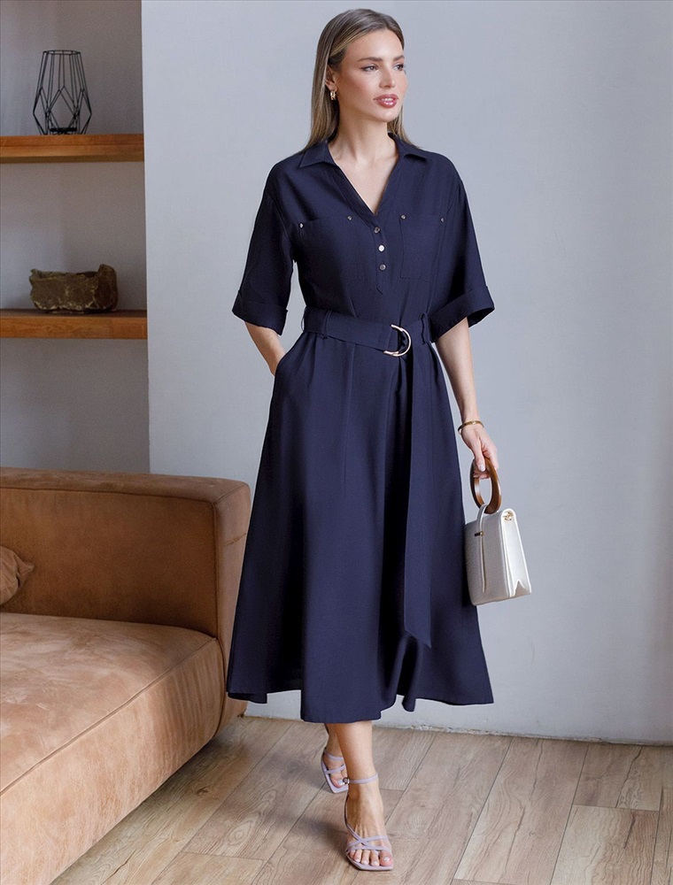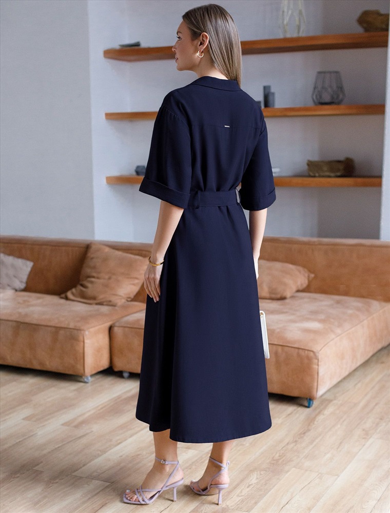 Плотность: 180 Г/м2 Платье-рубашка темно-синего цвета выполнено из плотного лиоцелла. Лиоцелл это более дорогой и экологичный вариант вискозы, очень прочный и шелковистый. Ткань отличается от регулярной коллекции из лиоцелла - она содержит еще больше лиоцелла (92%), благодаря чему имеет более нежную шелковистую фактуру. Свободное платье трапеция будет идеальным выбором для весны и лета. Отложной воротник добавляет классический акцент, широкий пояс с металлической пряжкой подчеркивает талию, делая силуэт выразительным и женственным. Платье с широким рукавом средней длины смотрится современно, карманы и пуговицы добавляют практичности. Платье А-силуэта идеально сядет и на большие размеры, скроет возможные недостатки и подчеркнет достоинства фигуры за счет элегантного облегания талии и расклешенной юбки. На высокий рост платье будет длины миди, а на низкий рост - длина макси. Такое красивое и комфортное платье подойдет для повседневных образов, для стилизации в стиле сафари или casual, а так же для торжественных мероприятий. Комментарии к товару