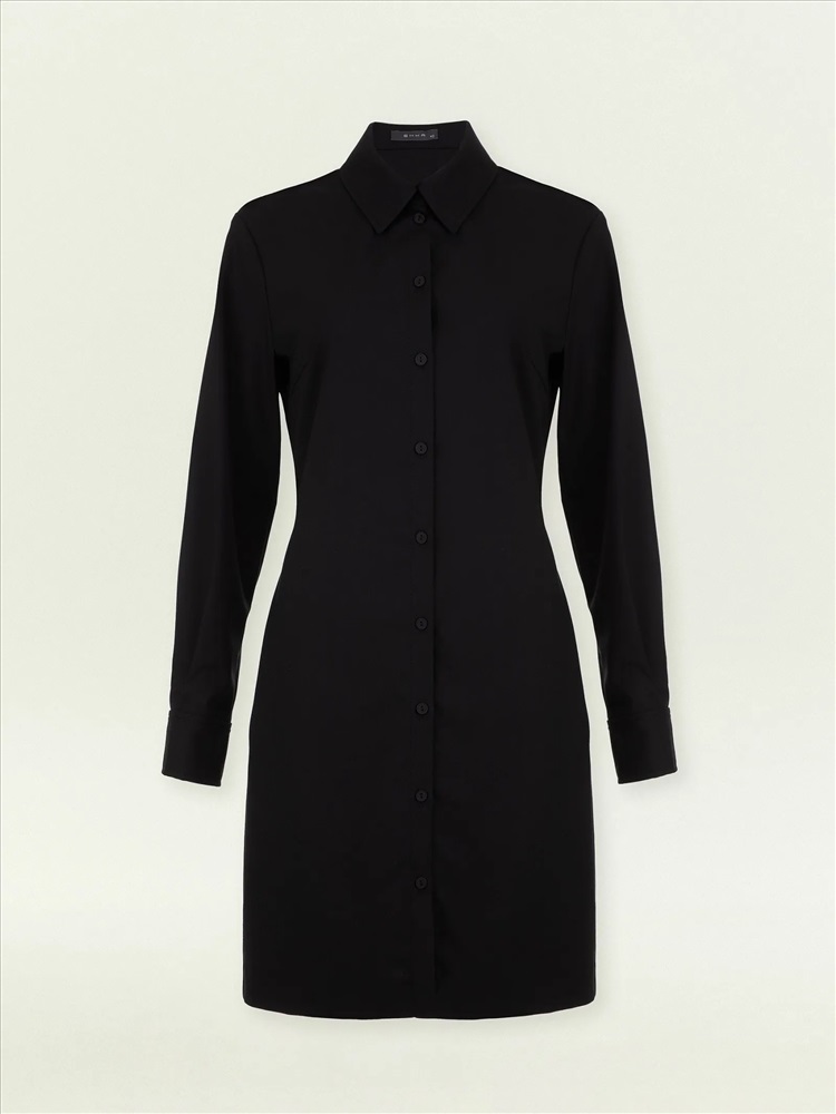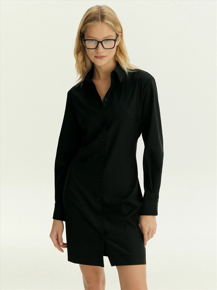 Повседневное платье-рубашка в чёрном цвете заинтриговывает необычным решением — сзади оно выглядит как комплект из рубашки с юбкой. Приталенная модель с вытачками спереди и напуском сзади имеет длину чуть выше колена. Тонкий, но тёплый костюмный материал на четверть состоит из шерсти, выполнен с содержанием вискозы и добавлением эластана. Это идеальный вариант на демисезон и не только. Платье может стать частью капсулы с юбкой, брюками и жилетом urgel.