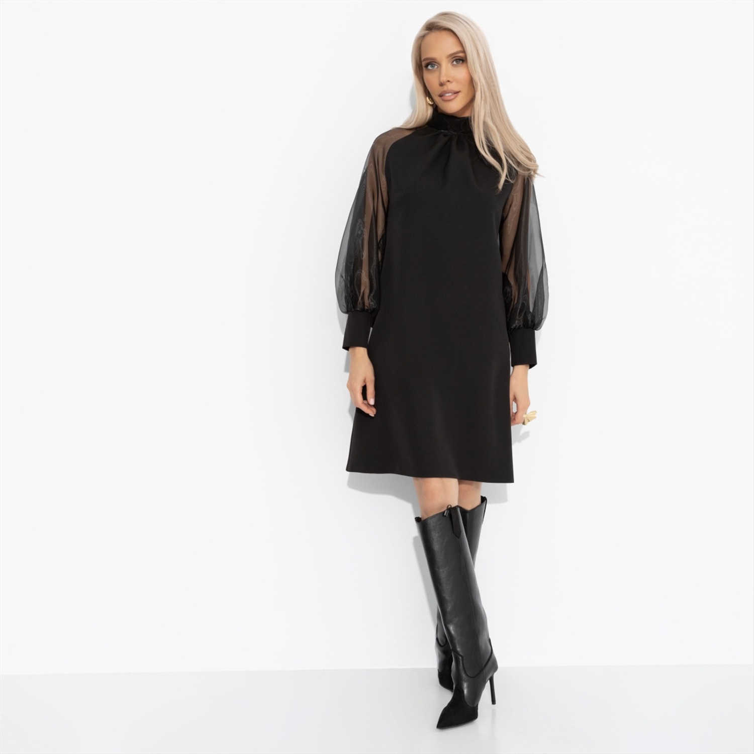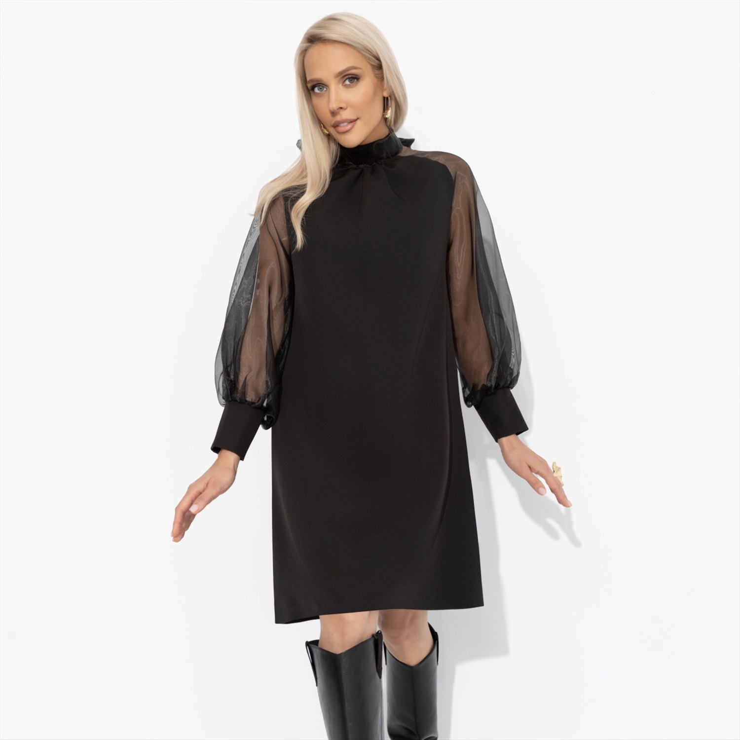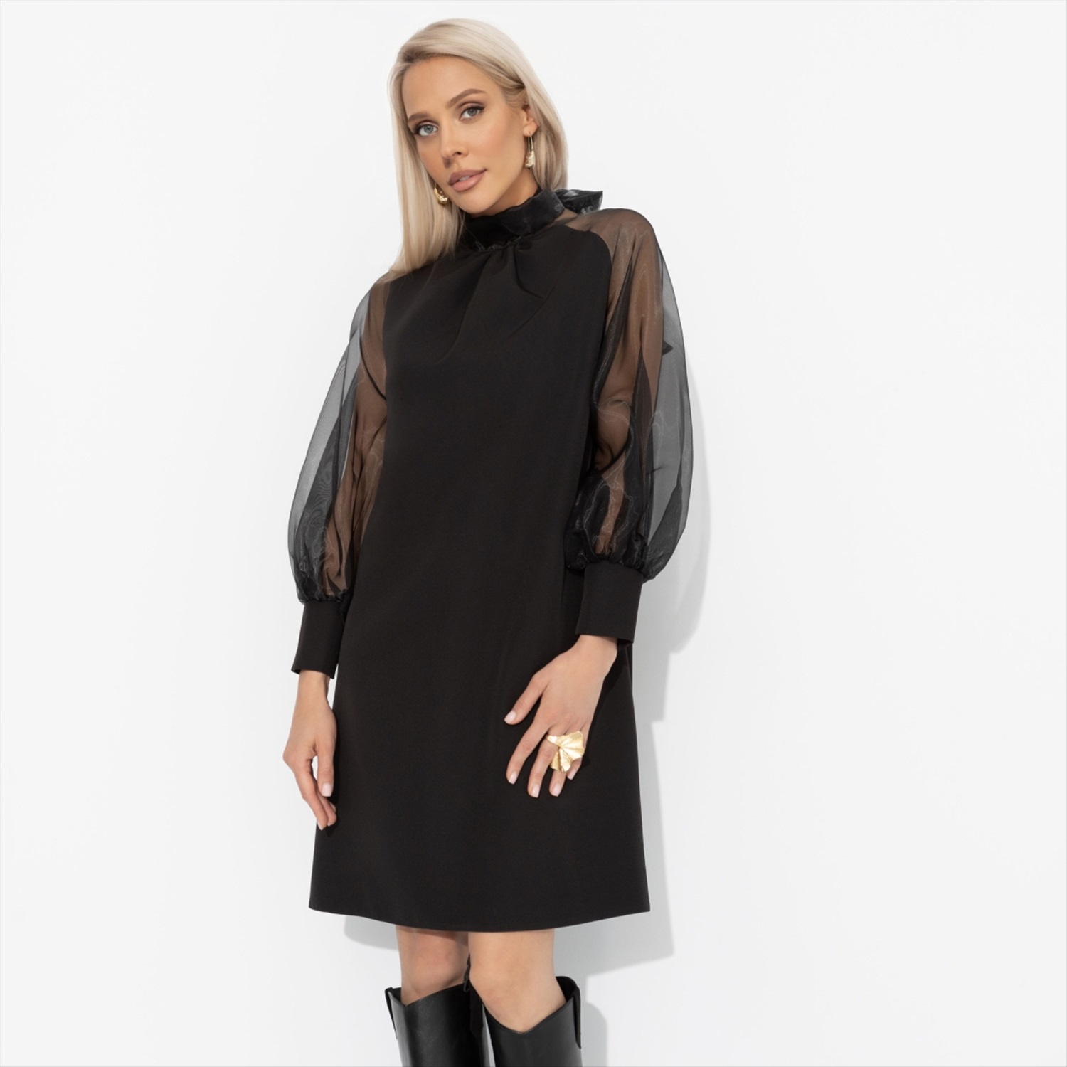 ТН ВЭД: 6104430000 Состав: «Барби», органза (95% п/а, 5% эластан) Плотность ткани: Средняя Тип ткани: Текстиль Вид застежки: Завязки Карманы: Нет Основной цвет ткани: Черный Отрезная талия: Нет Подклад: Нет Резинка по талии: Нет Рисунок/раппорт: Нет, все изделия идентичны Сезон: Круглогодичный Силуэт: Свободный