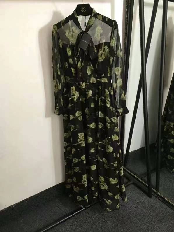 платье с длинными рукавами и принтом роз с бантом, длинная юбка, черный, S-XXL, [размер S; ширина плеч 36, обхват груди 82, обхват талии 68, длина рукава 57, длина 140]