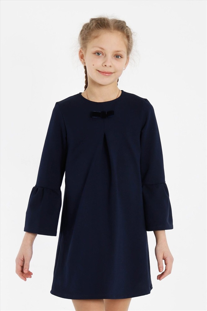 ID товара: 884521 Состав: 54% Полиэстер; 40% Хлопок; 6% Эластан Сезон: Демисезон Длина: Короткая Фасон: Прямое Рукав: Волан Вырез горловины: Округлый Основная ткань: Полиэстер | Футер 2-х нитка Стиль: Деловой стиль Страна бренда: Россия Страна производства: Россия Платье выполнено из темно-синего трикотажа, приталенное, круглый вырез горловины, рукав длинный с воланом. Застежка на две пуговицы сзади. Комментарии к товару