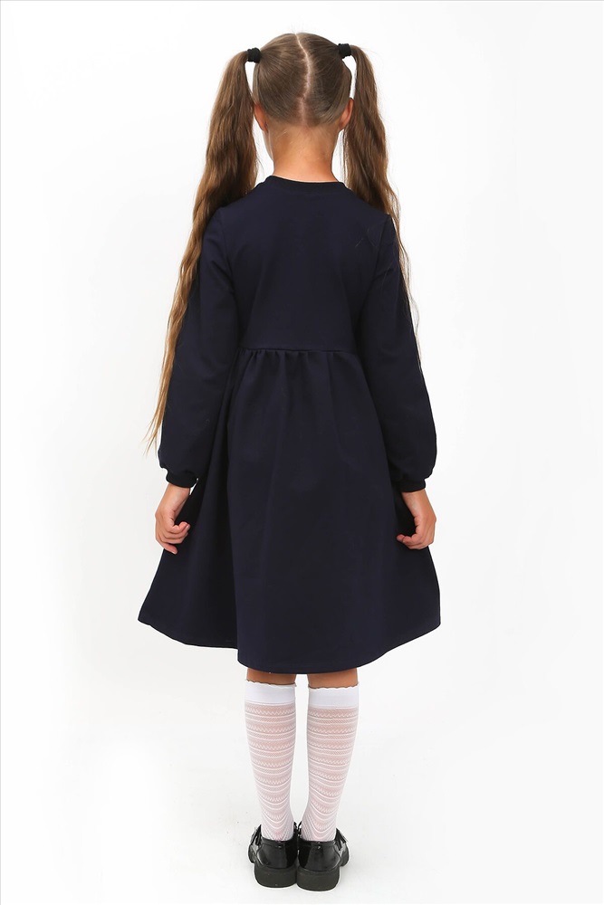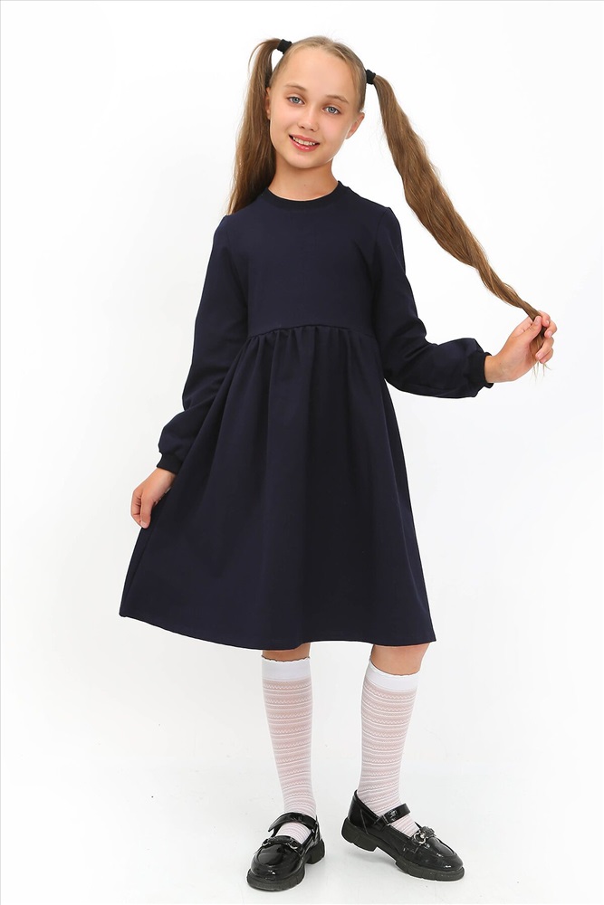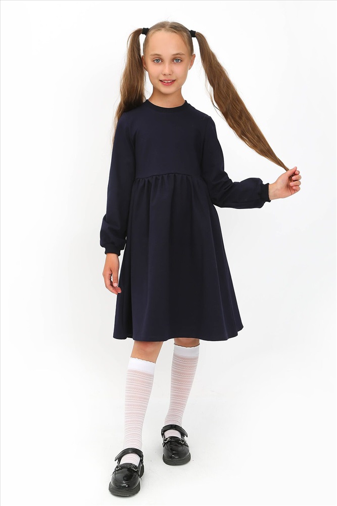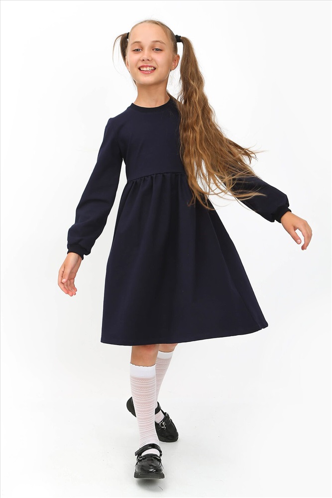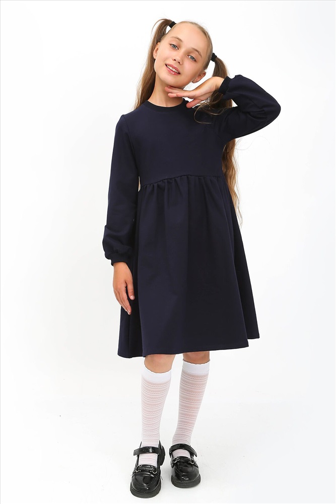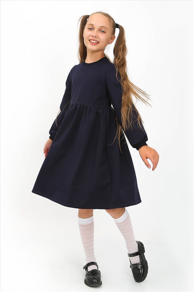 Платье на девочку из однотонного футера петли, прекрасно подойдет для школы. Круглый вырез горловины, пышный втачной рукав на эластичной манжете. Платье отрезное по линии талии, юбка со сборкой.