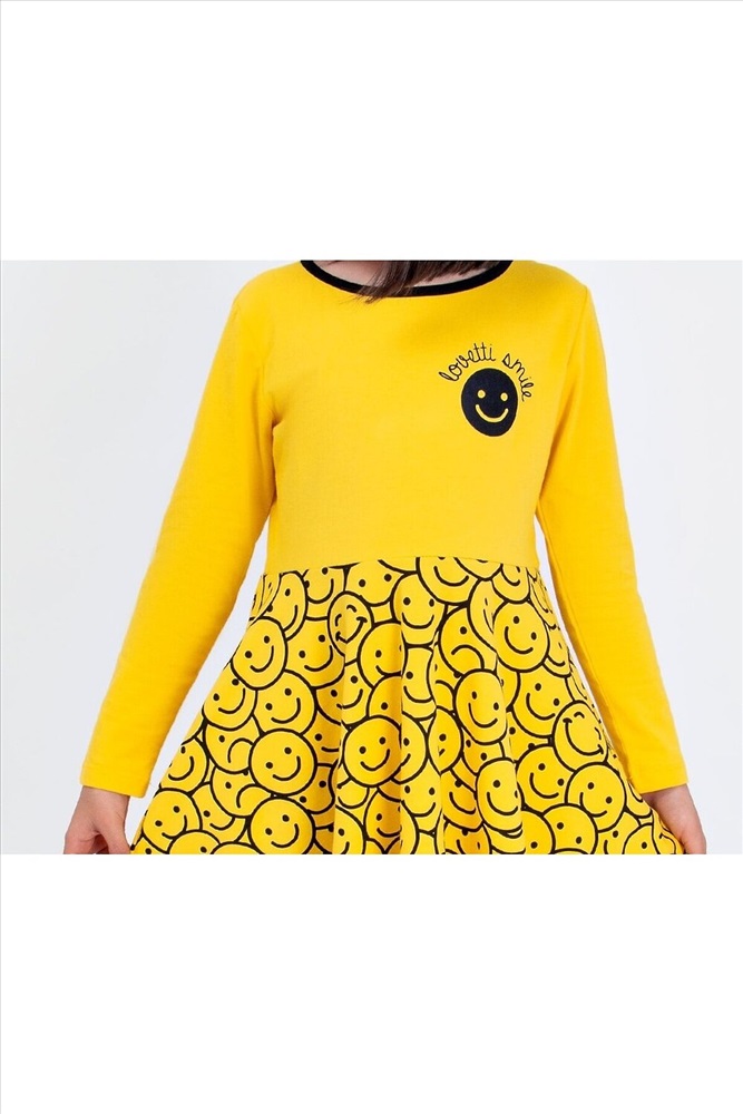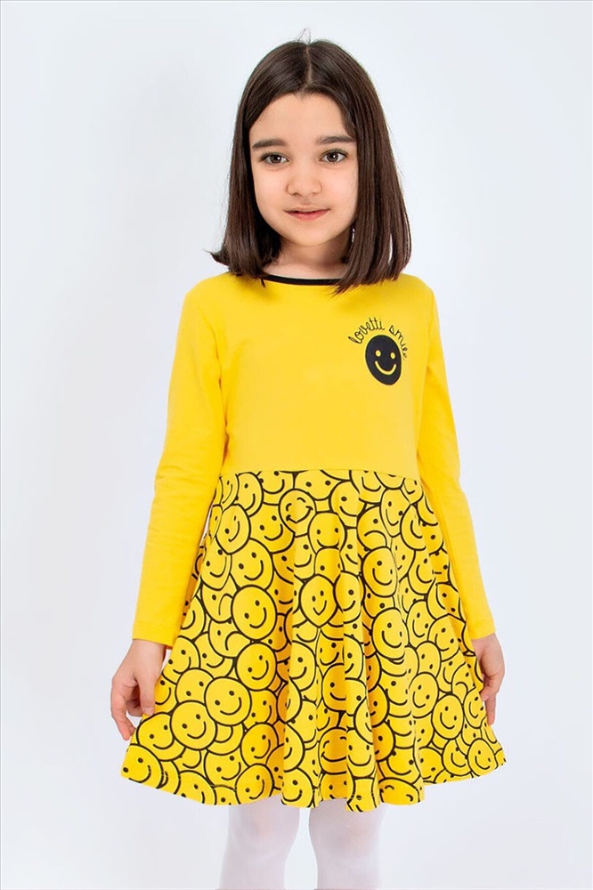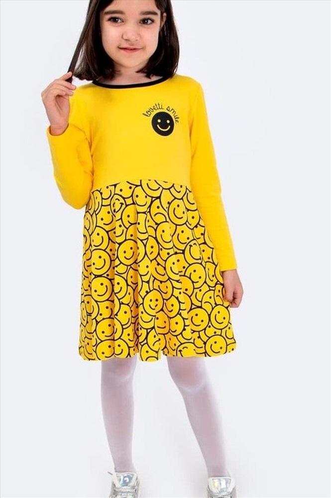 Яркое, трикотажное платье с приталенным верхом и расклешенной юбкой. Модель декорирована принтом с изображением смайлов. Материал мягкий и приятный к телу, прекрасно пропускает воздух, не электризуется.