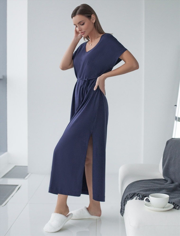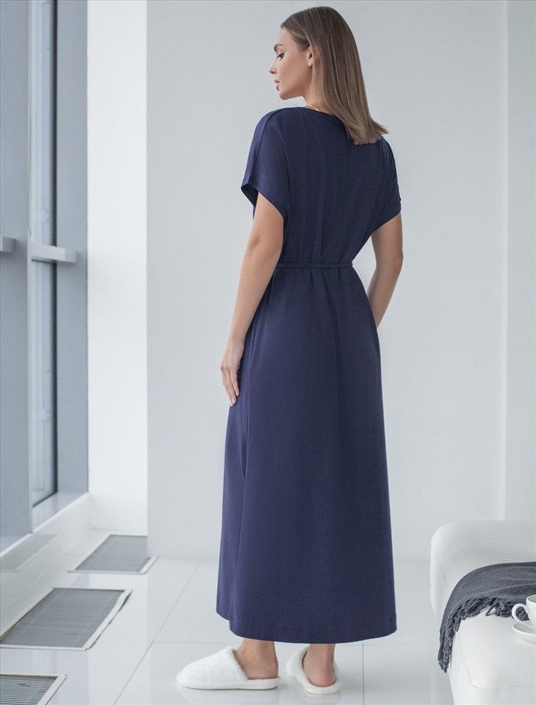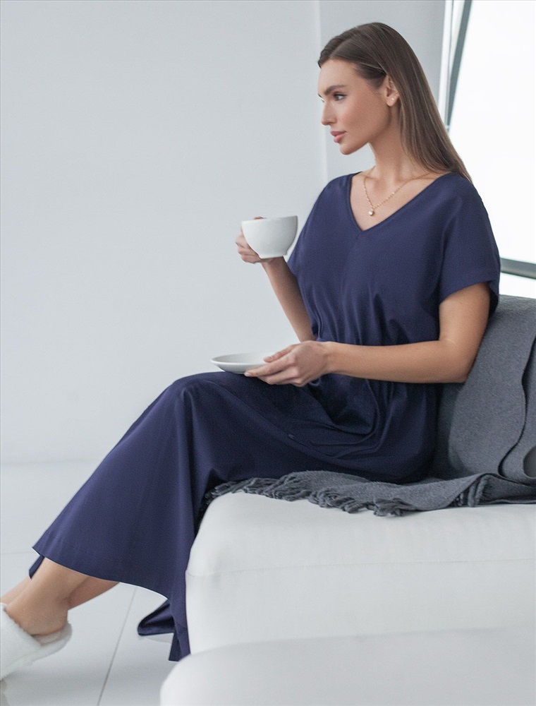 Плотность: 140 Г/м2 Длинное платье темно-синего цвета с V-вырезом из премиального 100% хлопка плотностью 140 Г/м2 сочетает в себе легкость и благородный стиль. Главная особенность этого изделия — тонкое кулирное полотно, которое легче и воздушнее стандартного трикотажа. Благодаря своей деликатной текстуре модель идеально подходит для домашних образов и пижамных комплектов. Ткань отлично «дышит», обеспечивая максимальный уют во время сна и отдыха. Женственный образ подчеркивает красивое декольте и тонкий пояс, который позволяет регулировать посадку по талии и создает А- силуэт. Модель украшена элегантным высоким разрезом сбоку, добавляющим свободы движению и нежности силуэту. Дышащий материал отлично подходит для теплой весны и лета, не теряет вида после длительного ношения, обеспечивая комфорт даже в жаркую погоду. Короткий цельнкроеный рукав добавляет свежести и удобства, делая платье универсальным для разных сезонов и случаев. Представленная широкая размерная линейка позволяет выбрать подходящий вариант для любой фигуры, в том числе и на большие размеры. Платье А-силуэта и длины макси подойдет девушкам и женщинам на низкий рост, а так же на высокий рост. Стильное платье гармонично сочетается с разными аксессуарами, помогая создавать как повседневные, так и более нарядные образы. Отсутствие сложных деталей делает это повседневное платье удобным для тех, кто ценит простоту и стиль одновременно. Будьте шикарной женщиной в этом красивом платье даже дома. Комментарии к товару