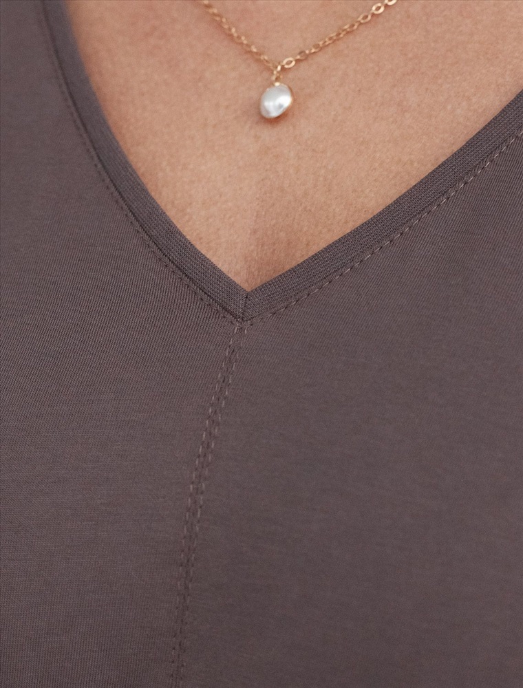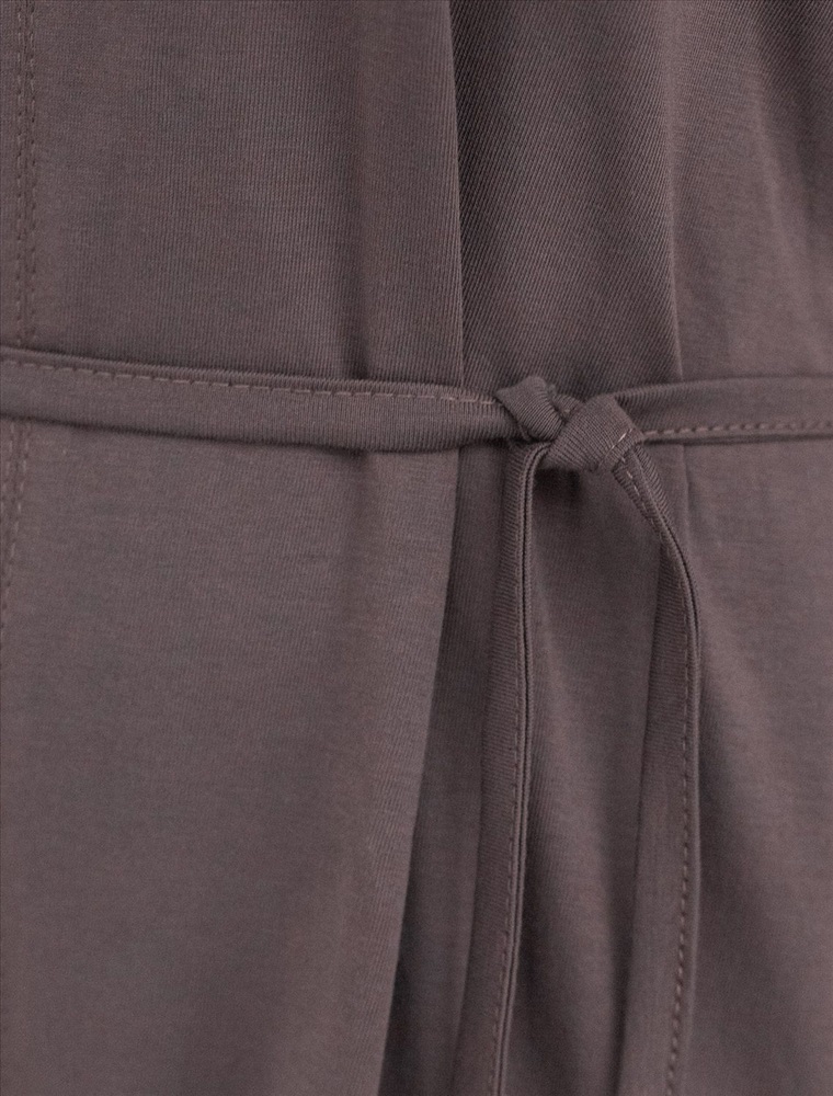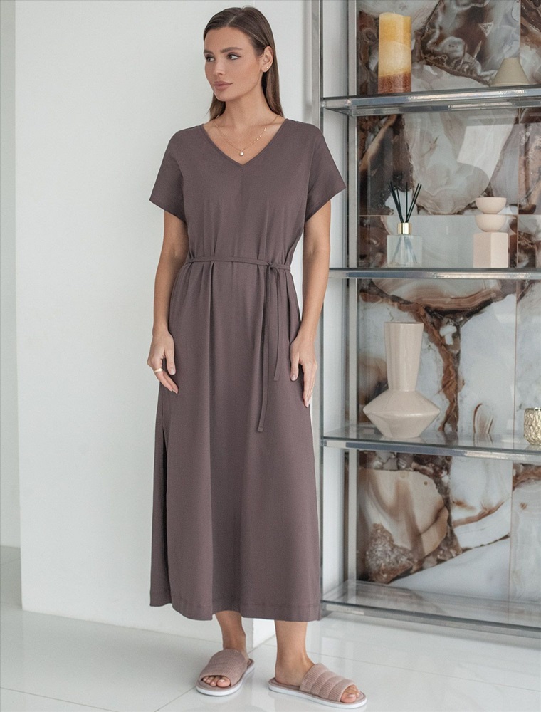 Длинное платье кофейного цвета с V-вырезом из премиального 100% хлопка плотностью 140 Г/м2 сочетает в себе легкость и благородный стиль. Главная особенность этого изделия — тонкое кулирное полотно, которое легче и воздушнее стандартного трикотажа. Благодаря своей деликатной текстуре модель идеально подходит для домашних образов и пижамных комплектов. Ткань отлично «дышит», обеспечивая максимальный уют во время сна и отдыха. Женственный образ подчеркивает красивое декольте и тонкий пояс, который позволяет регулировать посадку по талии и создает А- силуэт. Модель украшена элегантным высоким разрезом сбоку, добавляющим свободы движению и нежности силуэту. Дышащий материал отлично подходит для теплой весны и лета, не теряет вида после длительного ношения, обеспечивая комфорт даже в жаркую погоду. Короткий цельнкроеный рукав добавляет свежести и удобства, делая платье универсальным для разных сезонов и случаев. Представленная широкая размерная линейка позволяет выбрать подходящий вариант для любой фигуры, в том числе и на большие размеры. Платье А-силуэта и длины макси подойдет девушкам и женщинам на низкий рост, а так же на высокий рост. Стильное платье гармонично сочетается с разными аксессуарами, помогая создавать как повседневные, так и более нарядные образы. Отсутствие сложных деталей делает это повседневное платье удобным для тех, кто ценит простоту и стиль одновременно. Будьте шикарной женщиной в этом красивом платье даже дома.