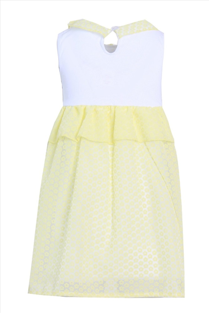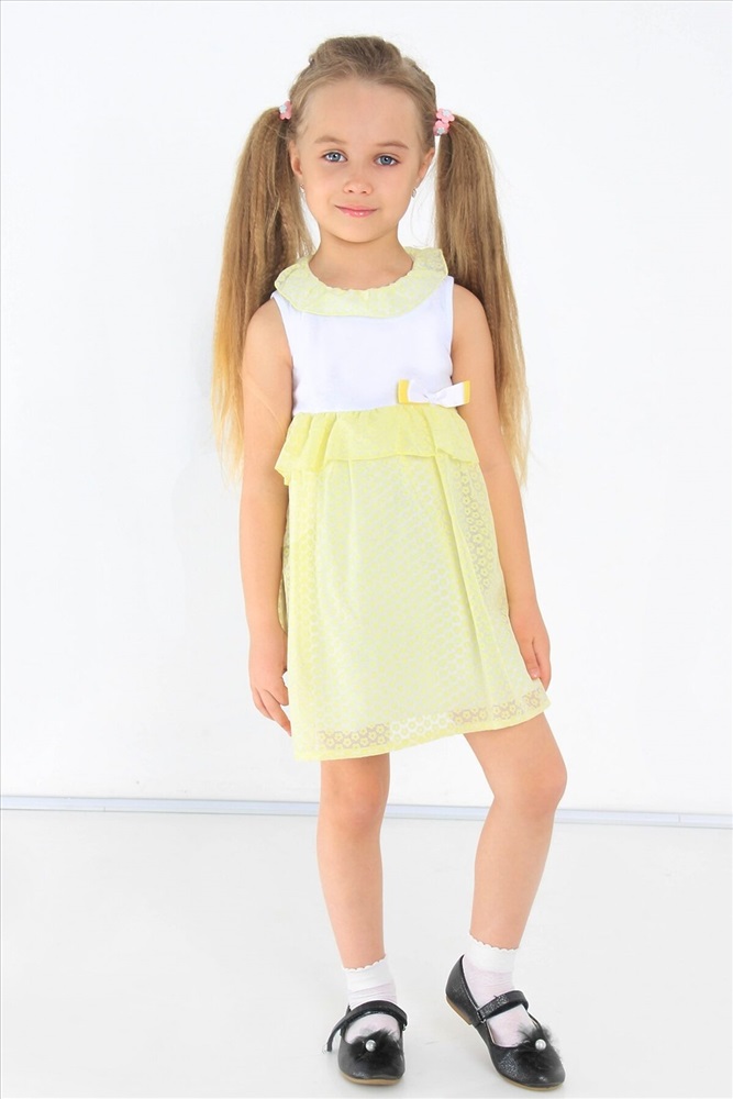 Платье из однотонной кулирки, без рукавов. Линия талии завышена. Юбка со сборкой, верхняя часть выполнена из набивной органзы, нижняя из кулирки. Горловина и линия талии декорированы сборками, юбка украшена бантиком. На спинке застежка на одну пуговицу.