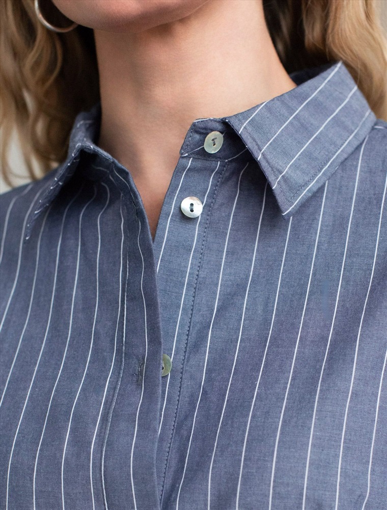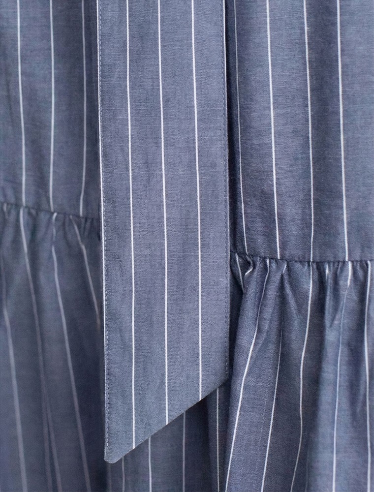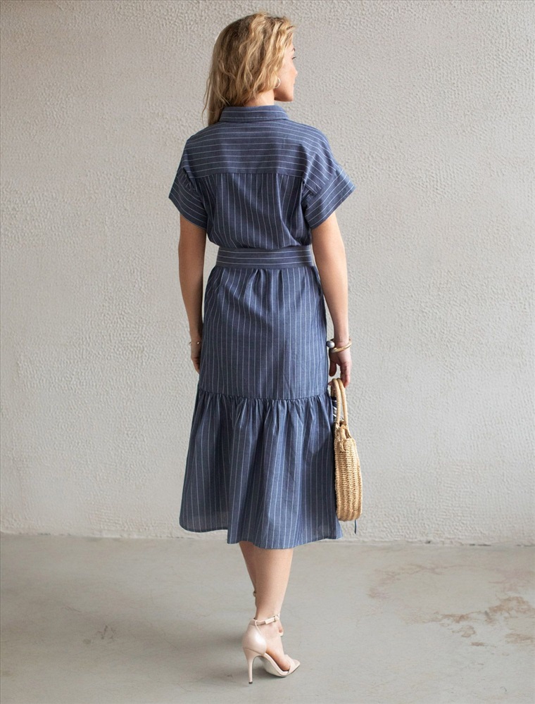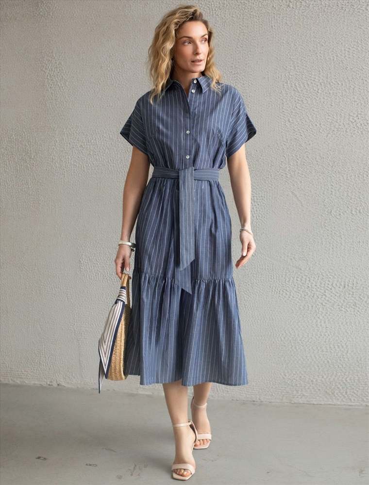 Платье А-силуэта с поясом серо-синего цвета в тонкую вертикальную полоску выполнено из легкого хлопкового поплина плотностью 106 Г/м2. Воздушное платье с застежкой на пуговицы с пышной юбкой-воланом отличный вариант для теплой и жаркой погоды. Модель обладает красивым кроем, который придает образу женственность и элегантность. Отложной воротничок и короткий цельнокроеный рукав с широкой манжетой создают стильный акцент, подходящий для повседневного ношения и различных ситуаций. Талия подчеркнута поясом, который легко регулируется и подчеркивает силуэт, придавая особый шарм и аккуратность образу. Натуральный состав ткани обладает высокой воздухопроницаемостью, а также способностью поглощать и отдавать влагу. В повседневном платье будет очень комфортно, благодаря правильной регуляции температуры тела. Такая модель подходит на маленький и высокий рост, а так же на любую фигуру, позволяя подчеркнуть достоинства и скрыть возможные недостатки, так же принт в тонкую вертикальную полоску визуально стройнит и вытягивает силуэт. Это длинное платье отлично подойдет тем, кто ценит удобство и утонченность в одежде из качественной вискозы и хлопка. Красивое легкое платье прекрасно подходит для динамичного рабочего дня, городских прогулок или торжественных мероприятий, его легко адаптировать под разные ситуации и стили.