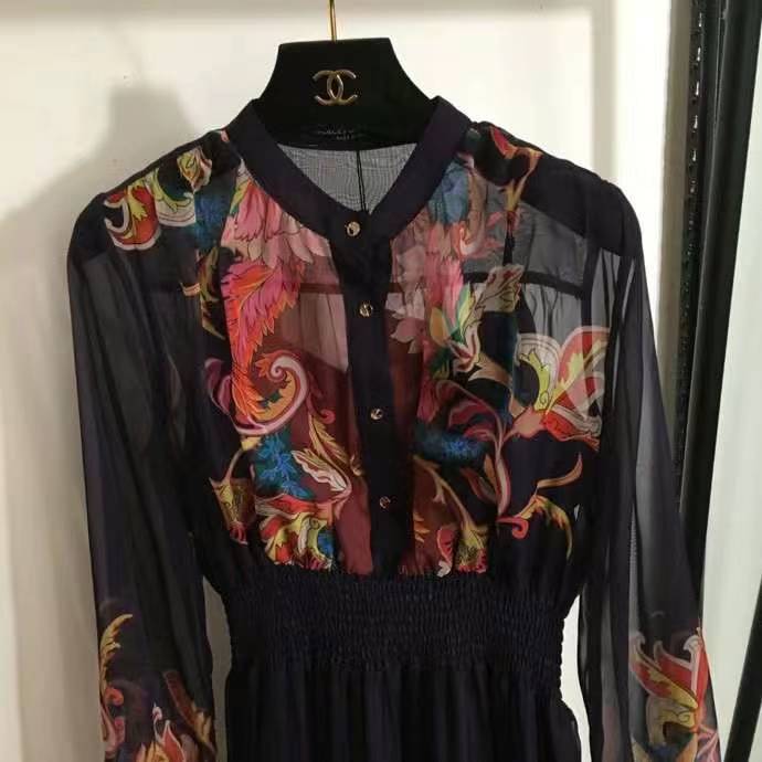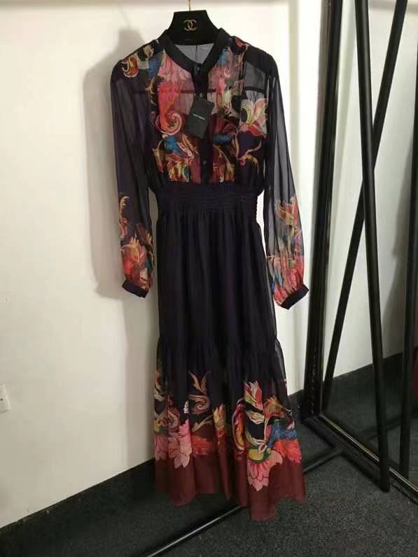 платье в стиле ретро с цветочным принтом и эластичной резинкой на талии с длинными рукавами, длинная юбка, синяя, S-XL, [размер S; ширина плеч 36, обхват груди 90, резинка по талии 56, длина рукава 57, длина 132]
