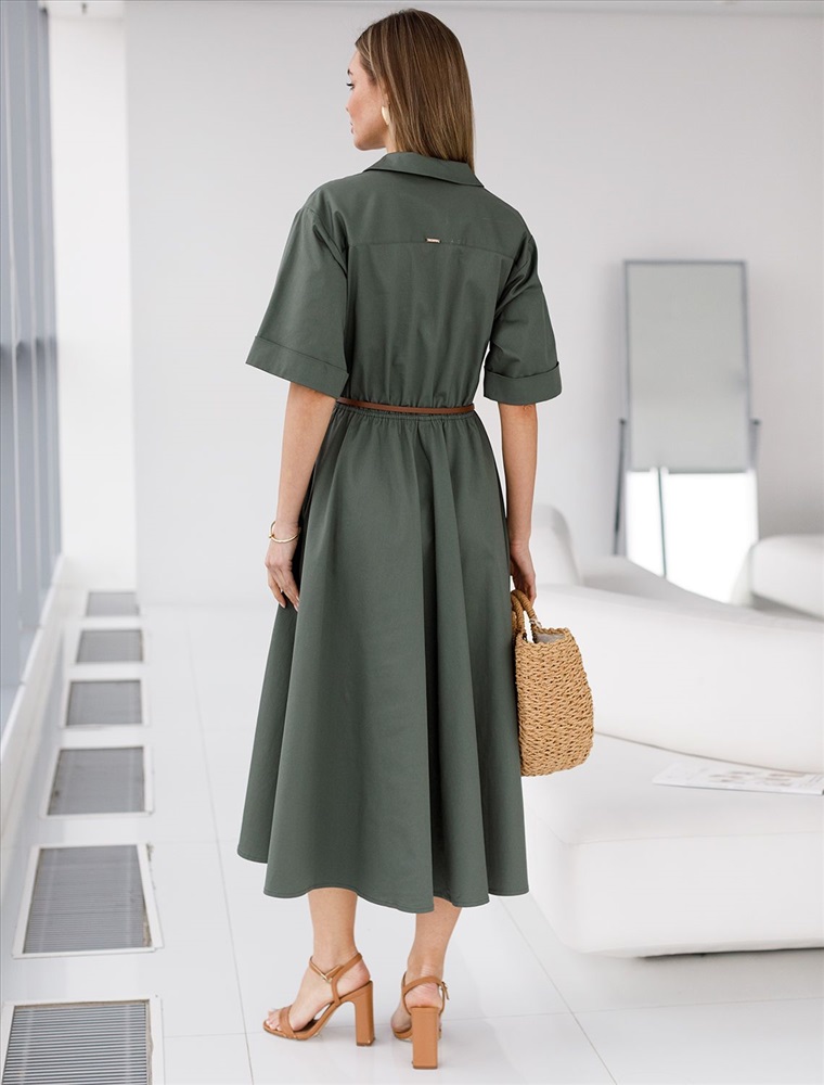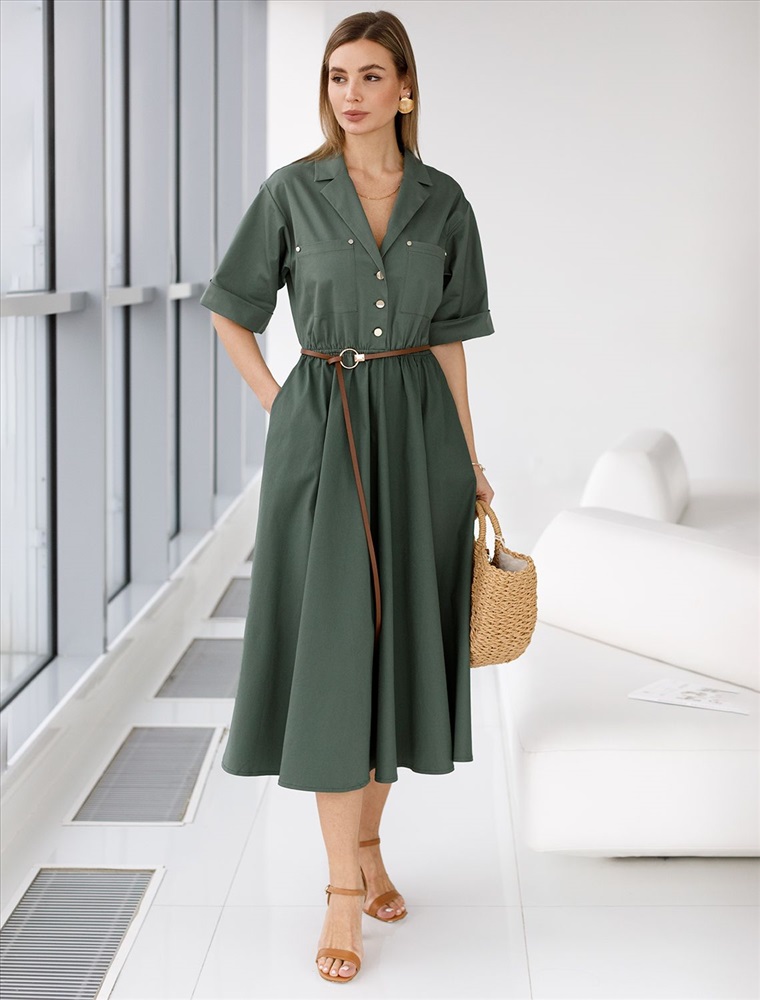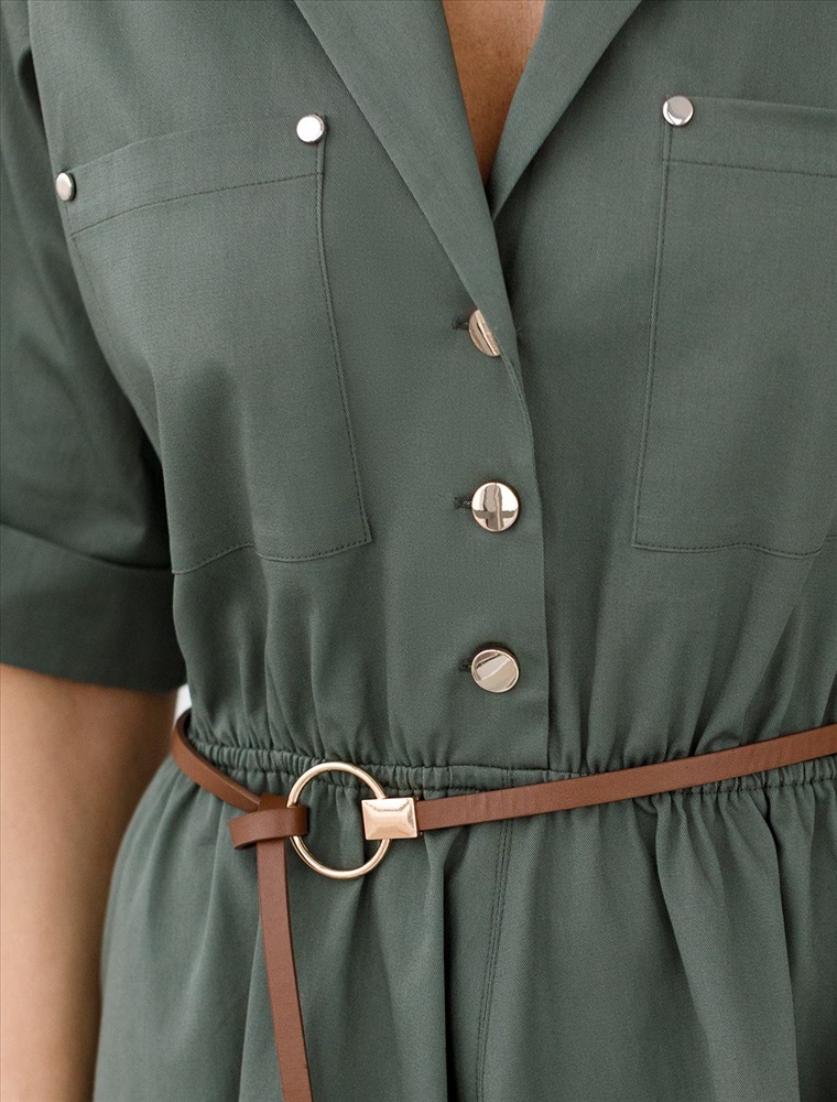 Состав: 97%Хлопок 3%ПУ Платье в стиле сафари выполнено из хлопкового твила. Изделие дополнено тонким ремешком из эко-кожи, боковыми и нагрудными карманами, подворотами на рукавах. Застежка на пуговицы спереди. Благодаря наличию эластана в составе изделие сохранит свой безупречный внешний вид в течение долгого времени. Обладает высокой воздухопроницаемостью, в платье будет комфортно даже в жаркое время года.