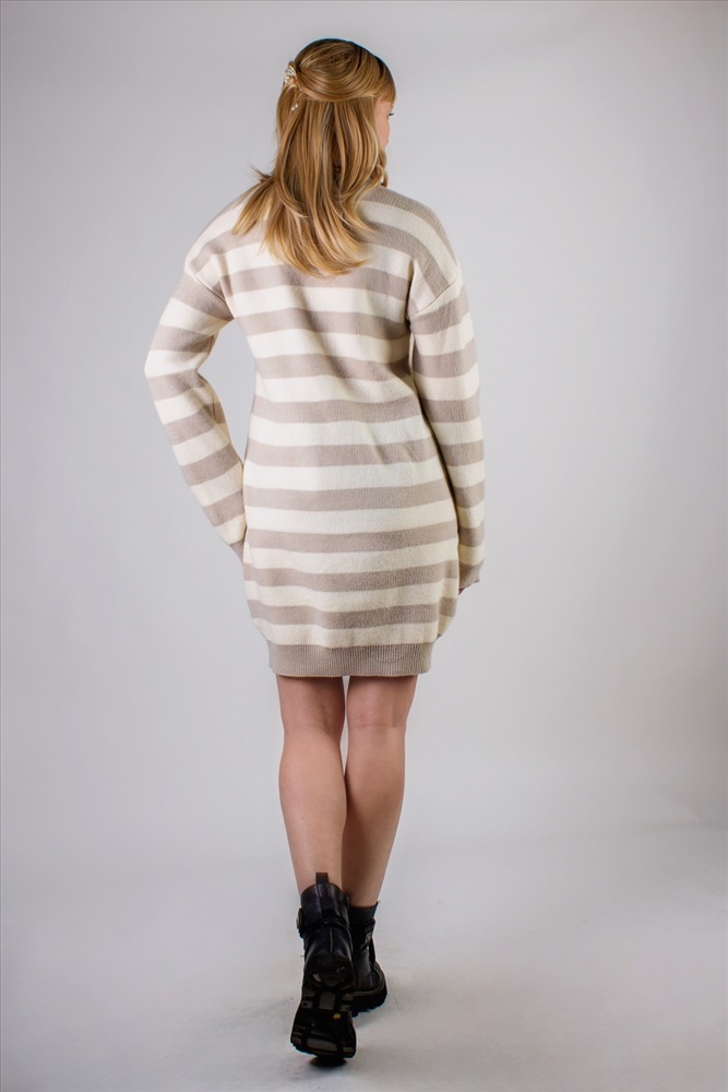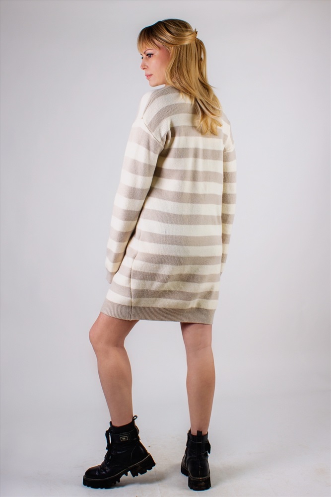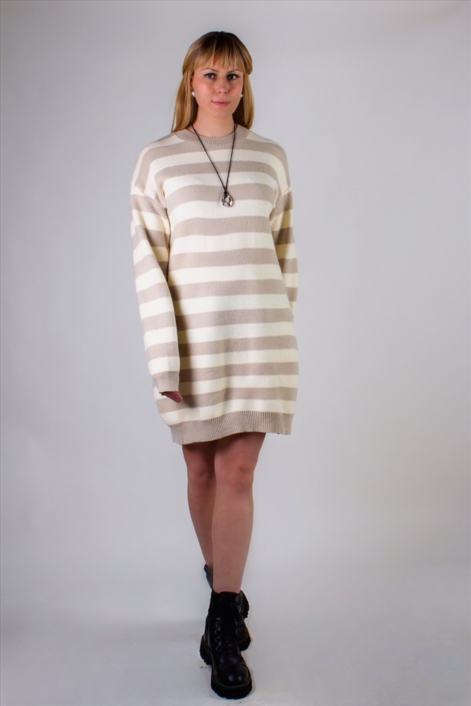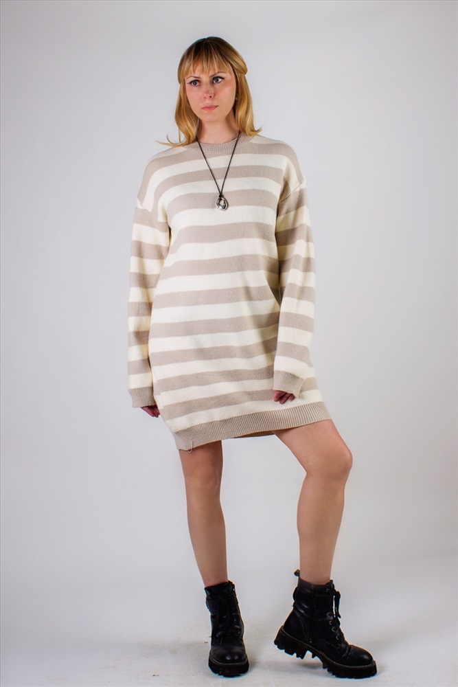 Состав: акрил 100% Модель: Платье, вязаная туника Полоска арт.1991 Тип товара: туника Материал: вязаный трикотаж | вязаный трикотаж Бренд: Styie Evolution Карман: без карманов Назначение: для дома НДС: Без НДС Особенности: вязаные изделия Рейтинг: Рейтинг 4 и выше Рисунок: полоска Рукав: длинный рукав Сезонность: осень | весна | зима Силуэт: свободный Скидка: любая | от 10% и больше Стиль: домашний | повседневный Воротник: без воротника Застежка: без застежки Платье свитер, вязаная туника Полоска арт.1991 - уютная и стильная модель, которая гармонично сочетает в себе элегантность платья и комфорт пуловера. Платье-свитер в полоску выполнена в корейском стиле: лаконичный силуэт прямого кроя с длиной до колена, что делает образ одновременно современным и женственным. Модель изготовлена из качественного современного акрила, обладающего мягкой и приятной на ощупь текстурой. Материал не вызывает зуда и раздражения, он легко пропускает воздух и сохраняет тепло, а по структуре напоминает благородную ангору: ткань мягко обволакивает тело, не колется и не вызывает никакого дискомфорта. Туника универсального размера (4250) превосходно адаптируется под любой тип фигуры: она мягко обнимает тело, скрывая возможные несовершенства и подчёркивая достоинства. Манжеты и горловина связаны контрастной вязкой более плотной и аккуратной, что придает образу чёткость и завершённость. То же декоративное решение использовано на рукавах и по низу изделия: слегка утяжнённые края удерживают форму, не растягиваются и не скатываются даже после многократной стирки. Палитра цветов включает четыре гармоничных сочетания: чёрно-белая полоса классика, подходящая к любому гардеробу и аксессуарам; серый + светло-бежевый мягкий, нюдовый вариант для дневных выходов; молочный + бежевая полоса нежная, тёплая гамма, идеально сочетающаяся с пастельными оттенками; молочный + коричневая полоса контрастный, но при этом очень натуральный и уютный вариант. Благодаря универсальному дизайну и уютной фактуре это платье-туника станет идеальной базой для создания многослойных ансамблей: носите его с плотными колготами или лосинами, дополняйте объемными шарфами, ботильонами или высокими сапогами. Оно легко впишется как в городской гардероб, так и в уютную домашнюю атмосферу. Туника легко комбинируется с кожаными лосинами или удобными кедами. Она прекрасно впишется в образ для офиса, прогулок и встреч с друзьями, а также станет отличным дополнением в путешествии ведь изделие практически не мнётся, быстро сохнет и сохраняет презентабельный вид. Преимущества модели: универсальный размер (4250); мягкий акрил с пушистым ворсом; не колется, не вызывает аллергии; контрастная отделка горловины, манжет и низа; актуальные цветовые решения в полоску; лёгкость ухода и стойкость формы. Следует отметить что чем больше Ваш размер, тем менее будет выражен эффект оверсайз. Рост модели на фото: 168 см, размер: 46-48, на ней платье единого 42-50 размера. Таблица размеров и веса