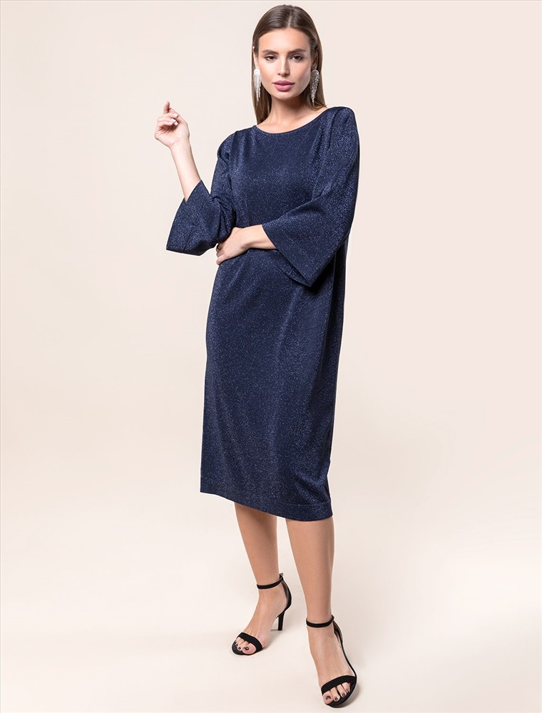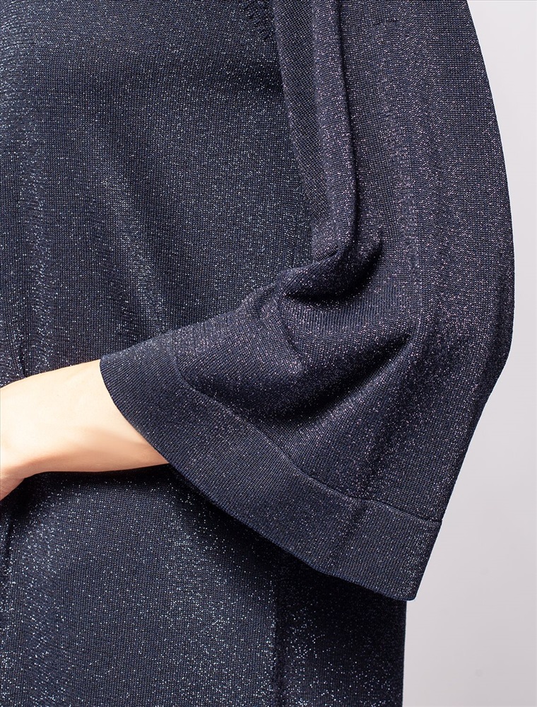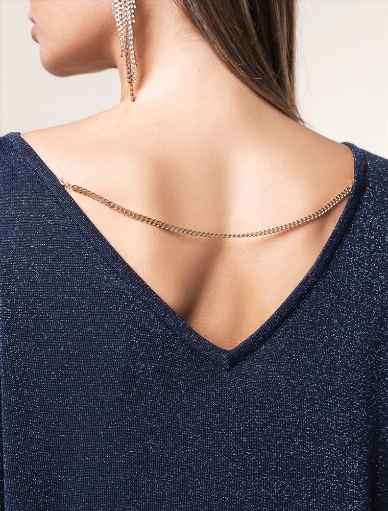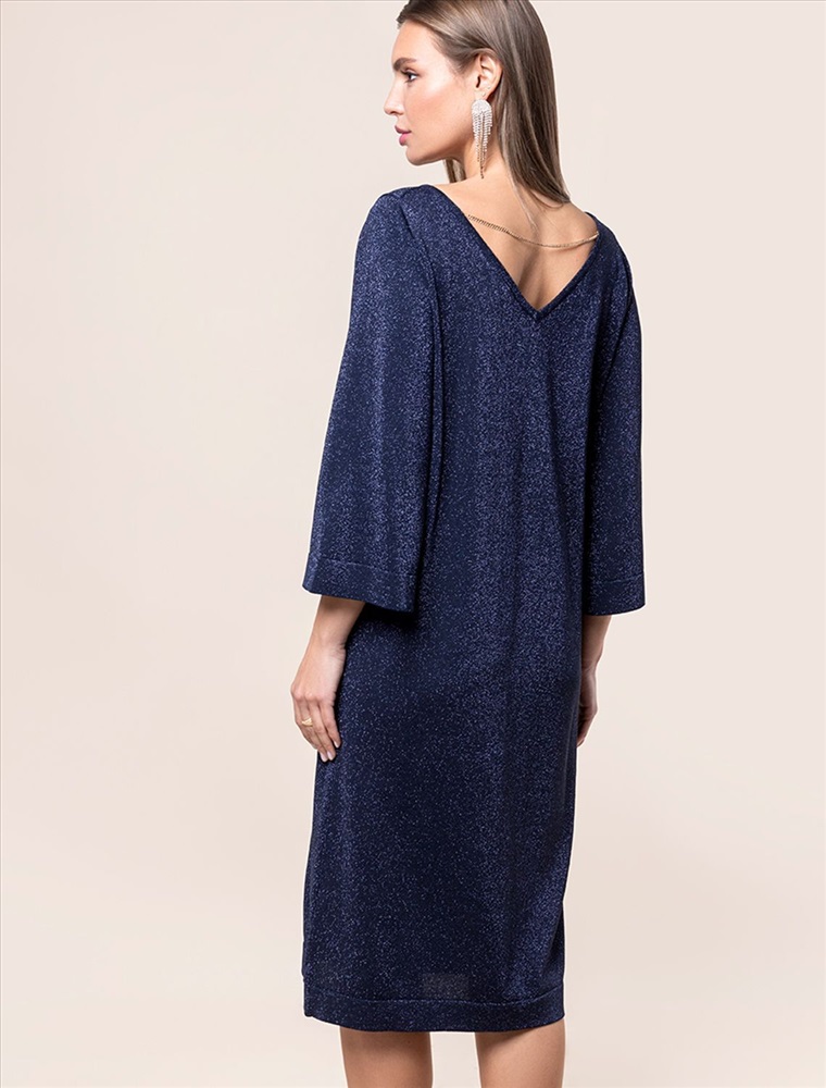 Свободное платье тонкой вязки из вискозы с добавлением мягкого люрекса. V-вырез на спинке изделия изящно притягивает внимание. Дополнительной изюминкой является тонкая цепочка, касающаяся лопаток. Внутренняя сторона изделия без люрекса, абсолютно гладкая и комфортная даже на голое тело. Совет стилиста: платье не требует к себе дополнительных аксессуаров, сочетайте свободную модель с босоножками на тонком ремешке или лодочками.