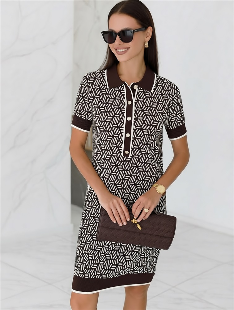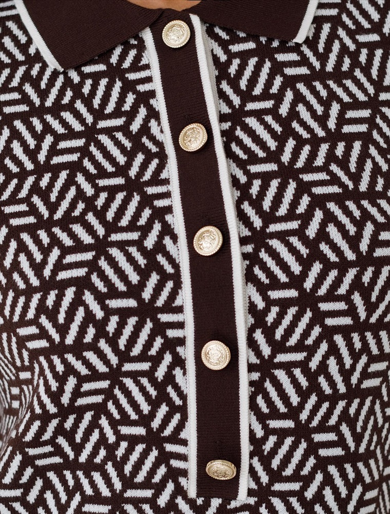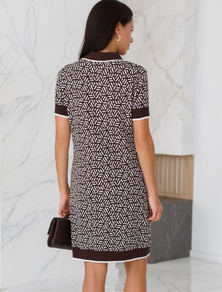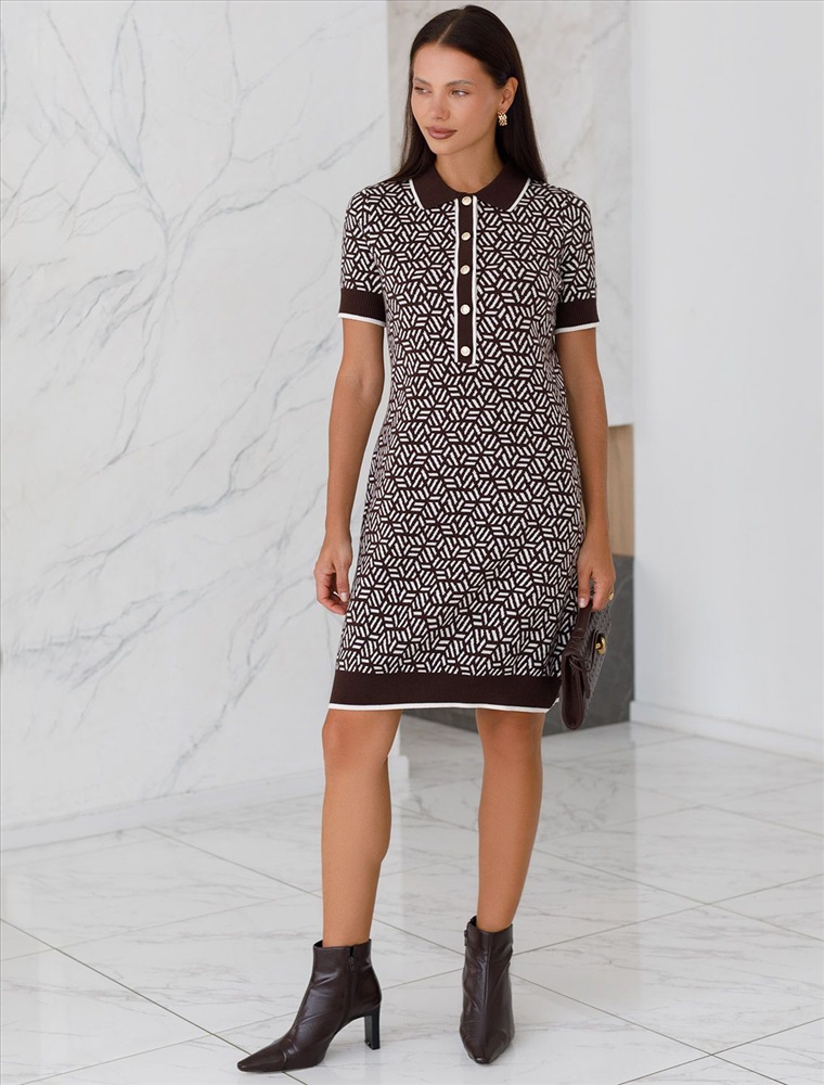 Параметры модели на первом фото: Рост 170, бюст 83, талия 64, бедра 88 Платье жаккардовой вязки выполнено из нежной пряжи на основе вискозы с добавлением кашемира. Модель прямого силуэта с застежкой планкой как у поло. Фигурные золотистые пуговицы вносят изысканности и роскоши. Изделие приятно ощущается на теле и поддерживает комфортный микроклимат. Жаккардовое вязание - это один из самых дорогих способов изготовления трикотажных изделий, так как для вязания используется сразу несколько цветов нитей. Жаккард вяжется намного дольше, чем однотонное полотно, имеет гораздо больший вес и плотность. Благодаря этому трикотаж дольше сохраняет красивый внешний вид, не пилингуется и не подвержен спуску петель. Два цвета пряжи использовано также для горловины и низа изделия, которые обработаны рибсами с добавленией спандекса. Спандекс позволяет сохранить форму платья на длительное время, даже после многократных стирок. Сочетается в комплекте total-look с жакетом D31.150