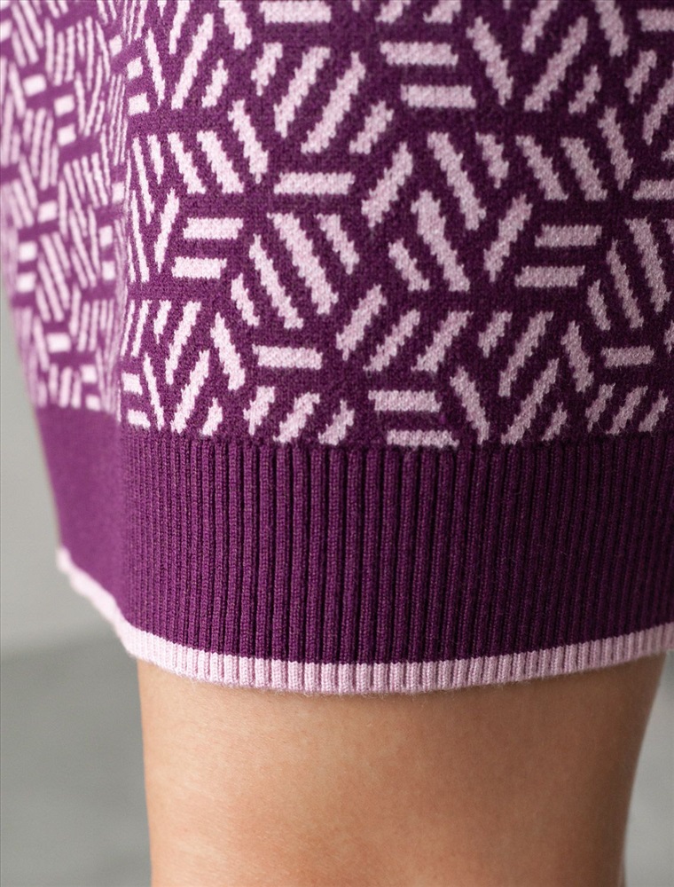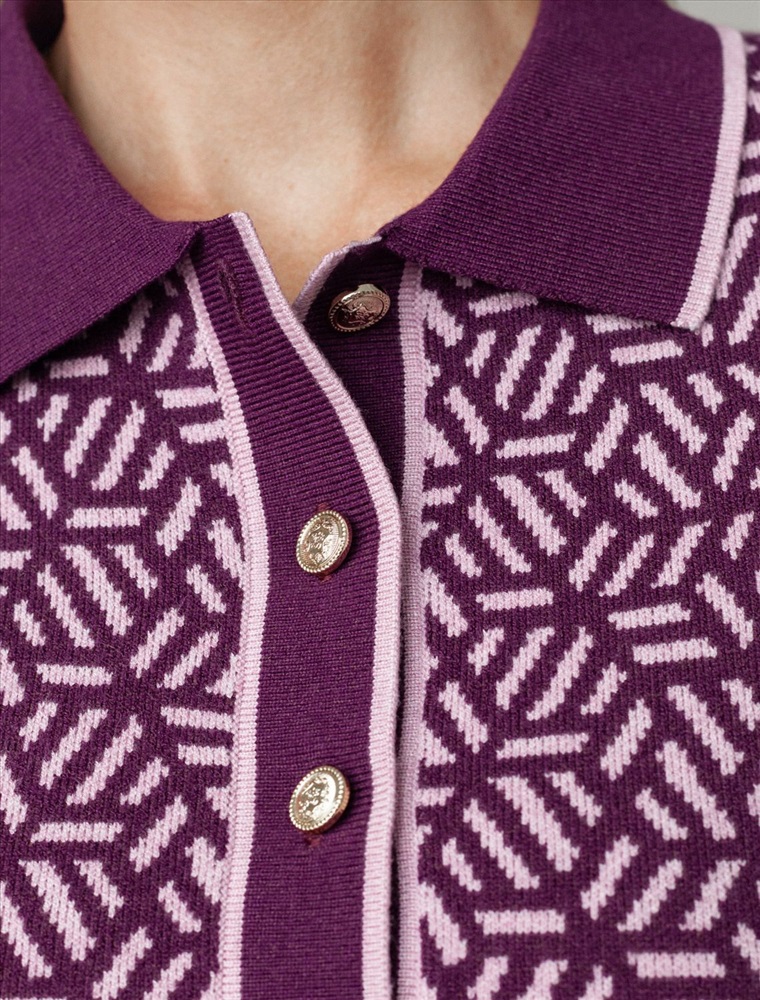 Платье жаккардовой вязки выполнено из нежной пряжи на основе вискозы с добавлением кашемира. Модель прямого силуэта с застежкой планкой как у поло. Фигурные золотистые пуговицы вносят изысканности и роскоши. Изделие приятно ощущается на теле и поддерживает комфортный микроклимат. Жаккардовое вязание - это один из самых дорогих способов изготовления трикотажных изделий, так как для вязания используется сразу несколько цветов нитей. Жаккард вяжется намного дольше, чем однотонное полотно, имеет гораздо больший вес и плотность. Благодаря этому трикотаж дольше сохраняет красивый внешний вид, не пилингуется и не подвержен спуску петель. Два цвета пряжи использовано также для горловины и низа изделия, которые обработаны рибсами с добавленией спандекса. Спандекс позволяет сохранить форму платья на длительное время, даже после многократных стирок.