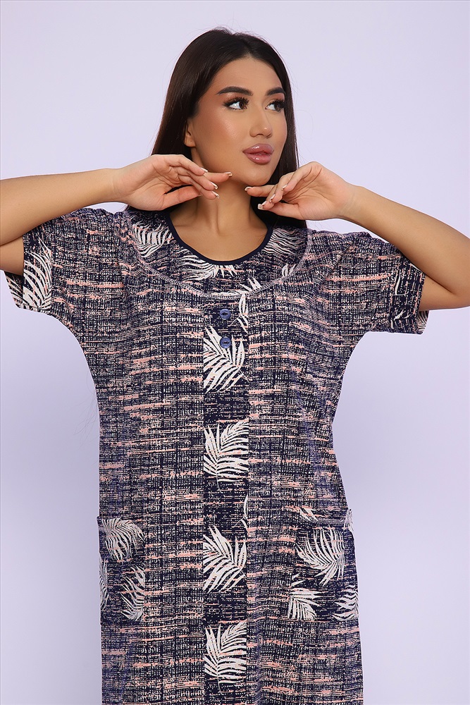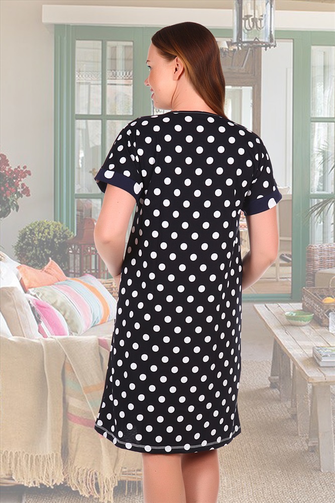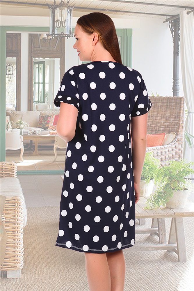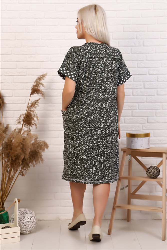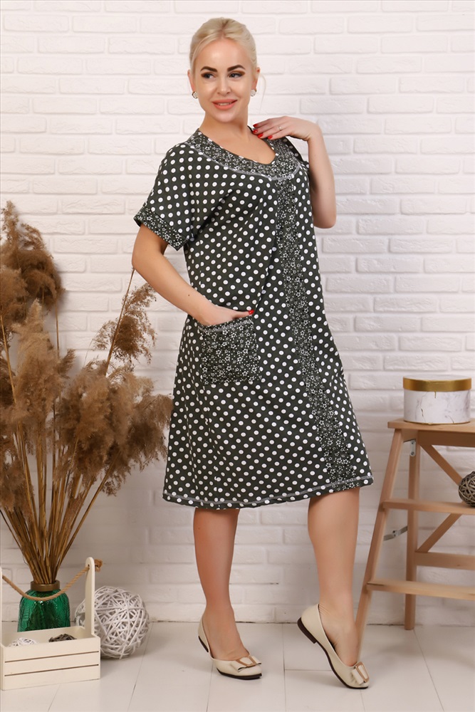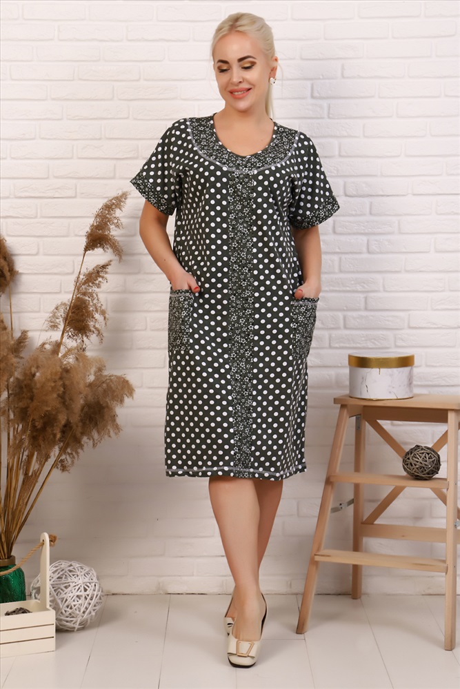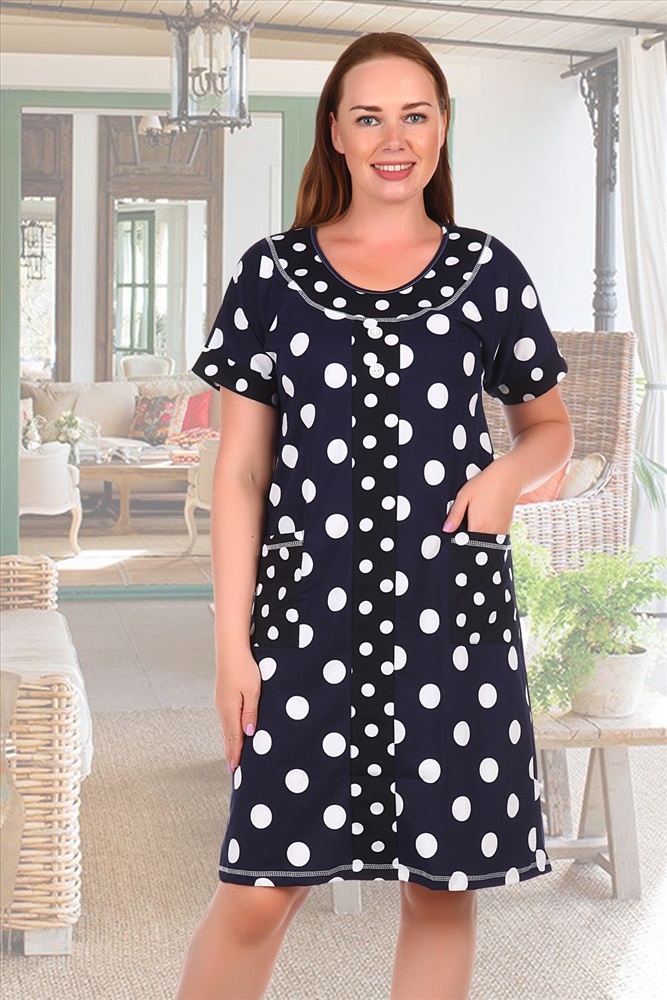 Застежка: пуговицы Женское платье из кулирки. Дизайн в виде крупного и мелкого гороха, несколько вариантов расцветки, по бокам накладные карманы, длина приблизительно до коленей.