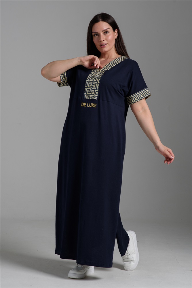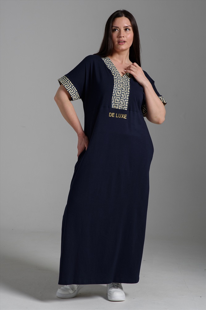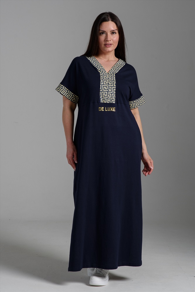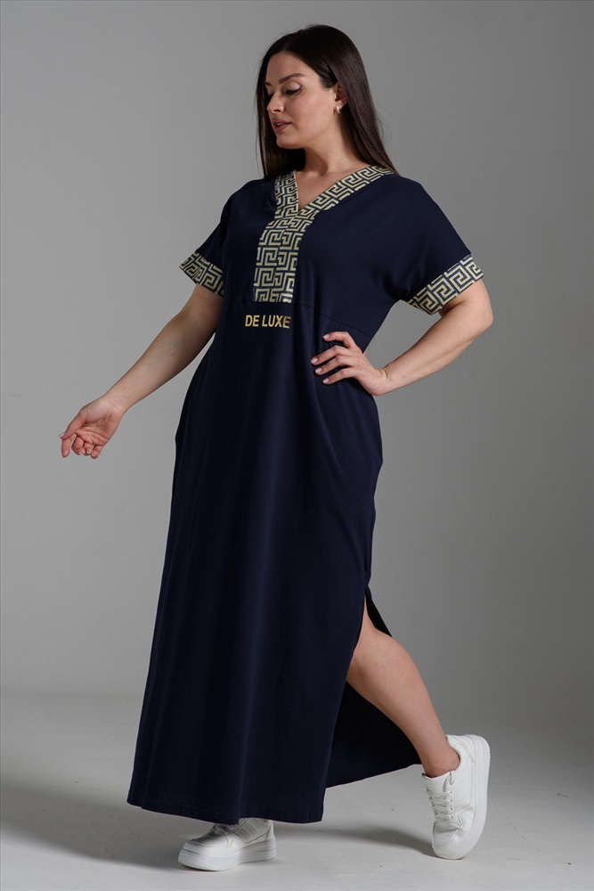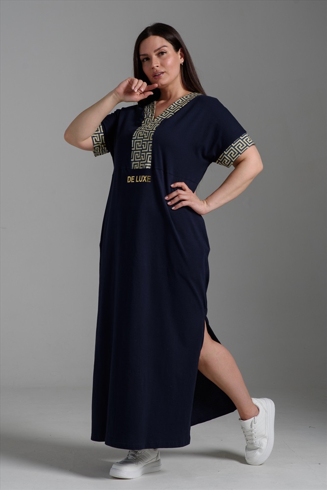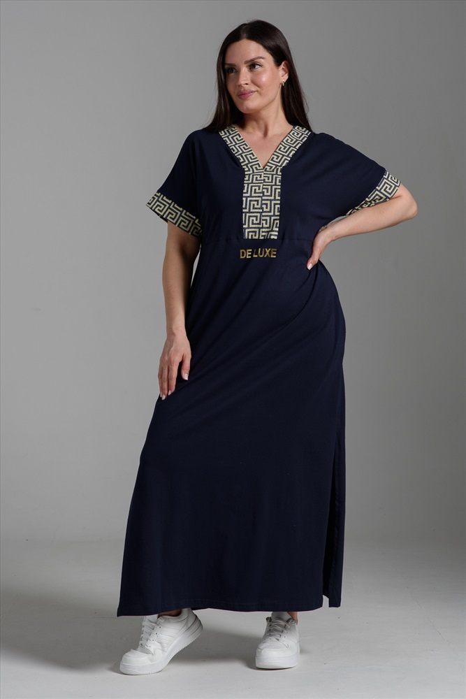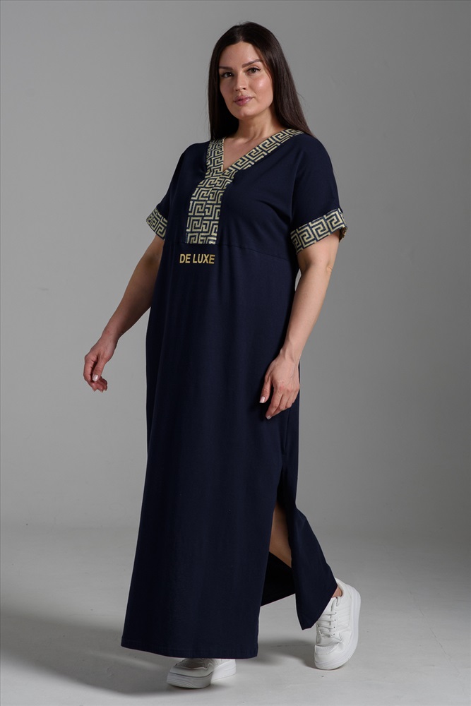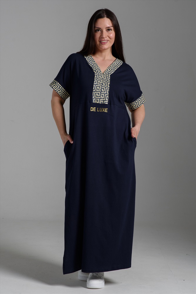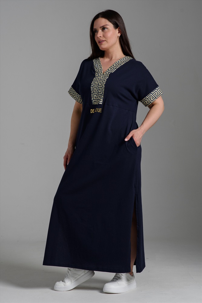 Застежка: без застежки Платье прямого силуэта, с V-образной фигурной горловиной, с боковыми карманами, с разрезами в нижней части боковых швов. Рукав цельнокроеный, короткий, с манжетом из отделочного полотна. Горловина обработана обтачкой из отделочного полотна.
