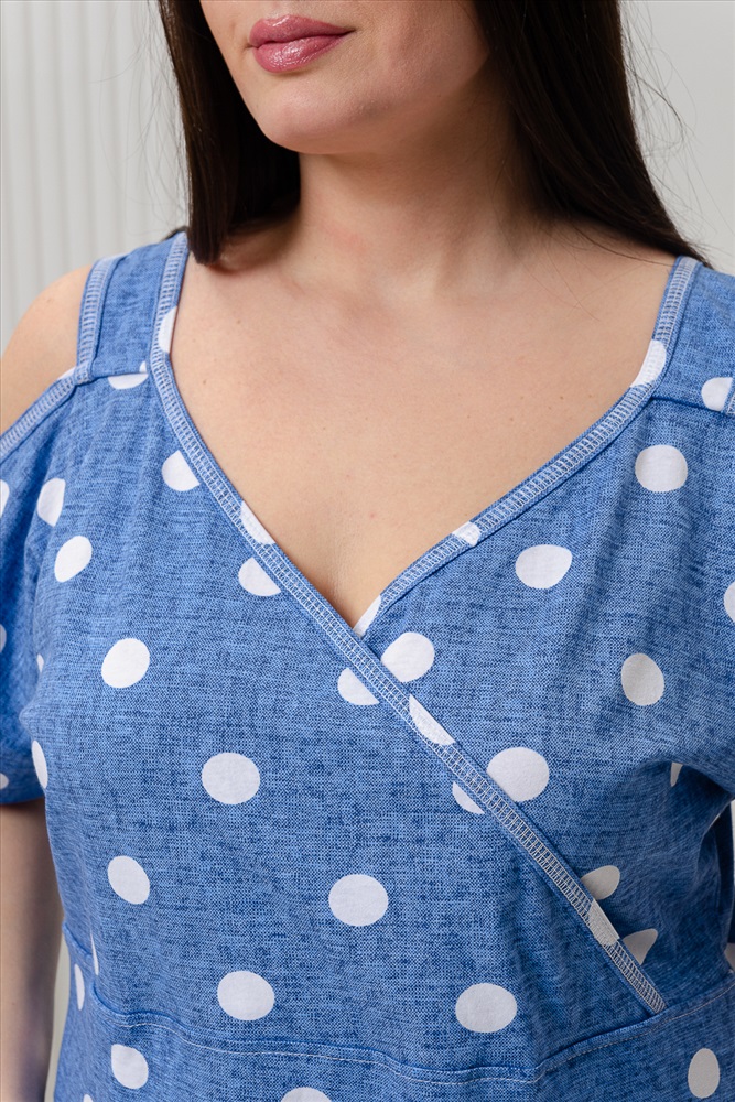 Застежка: без застежки Платье женское полуприлегающего силуэта. Платье с запахом в верхней части. В нижней части на полочке внутренние фигурные карманы. На плечах широкие удобные бретели , переходящие в открытый цельнокроенный рукав на манжете.