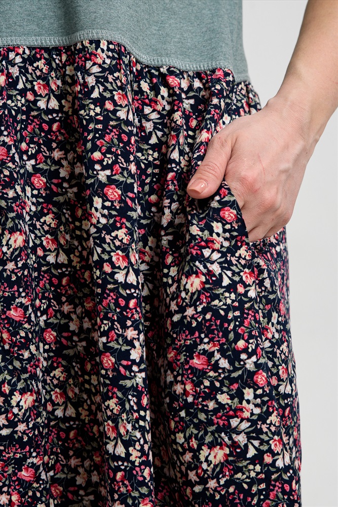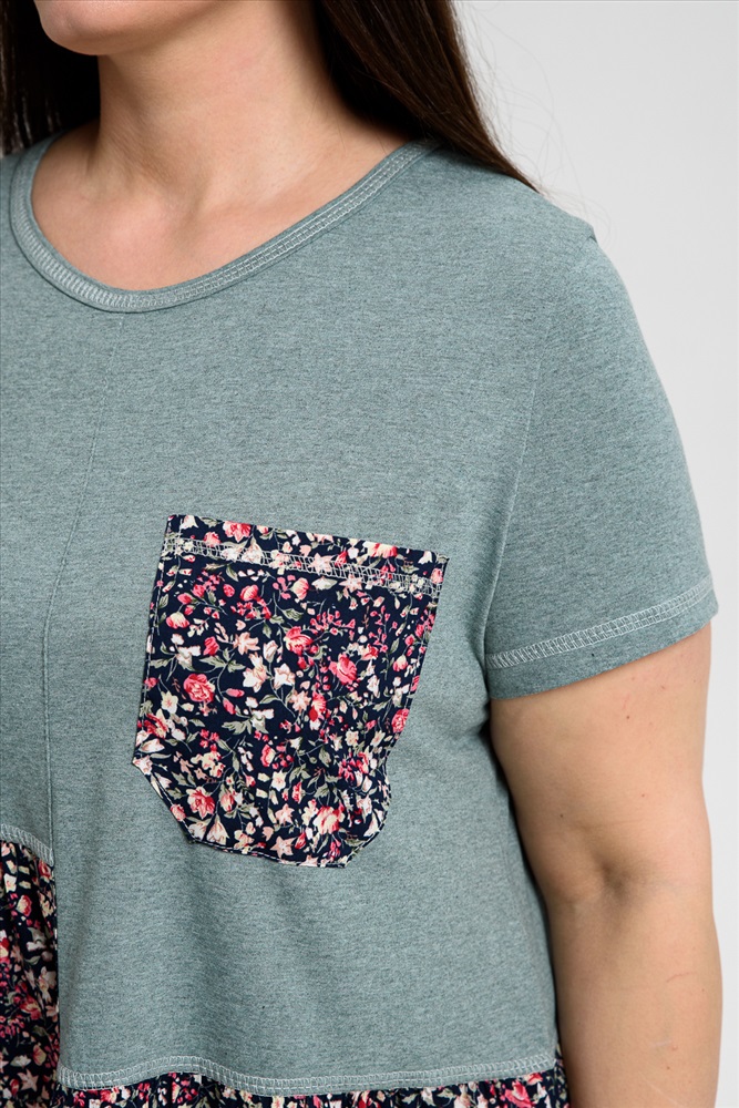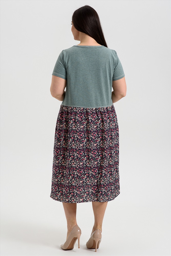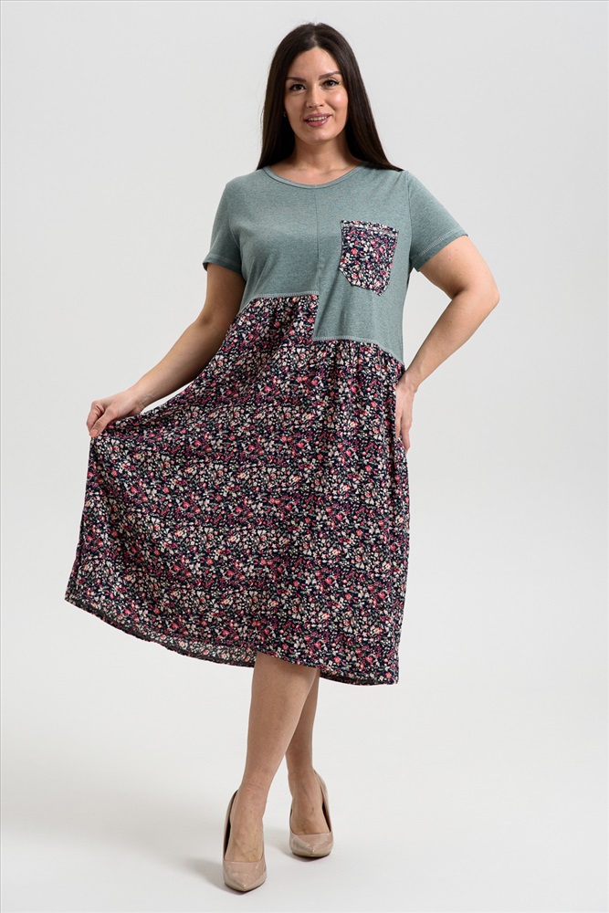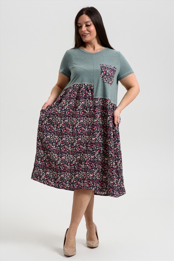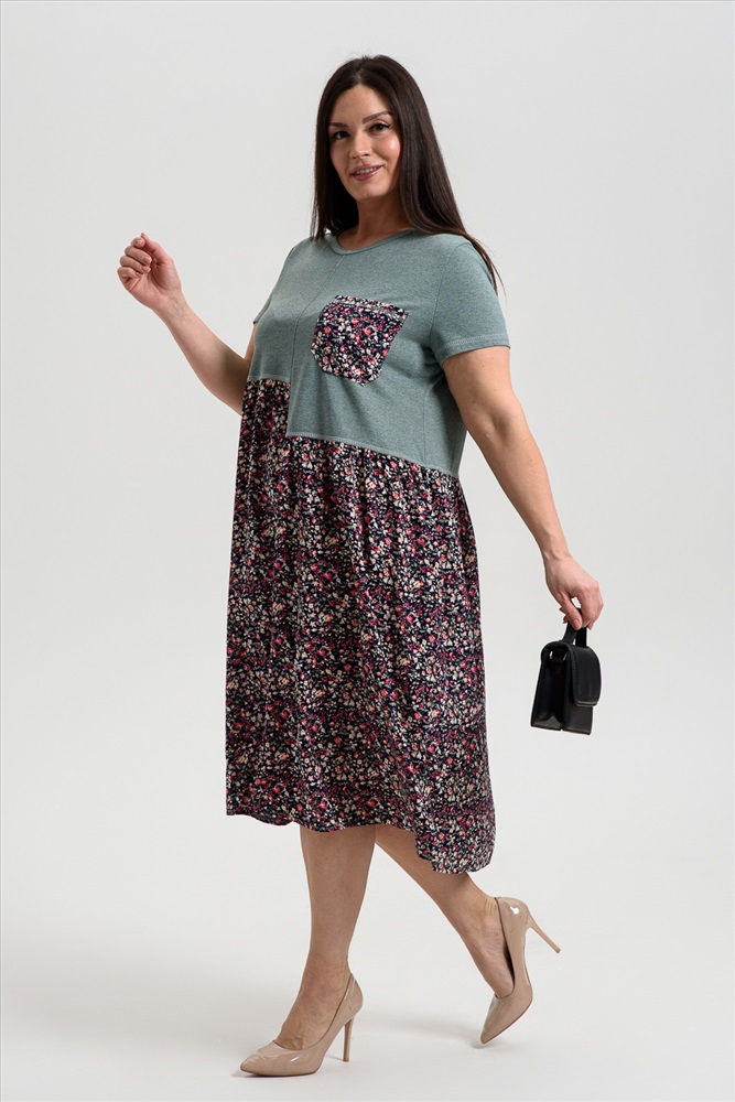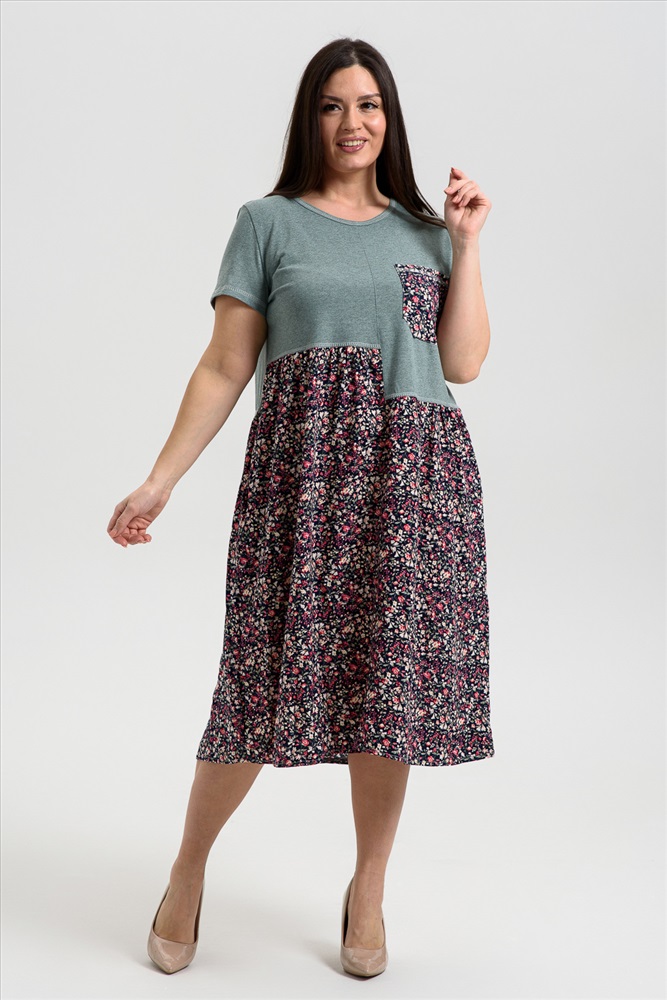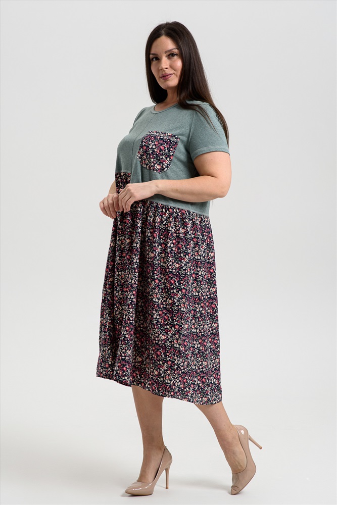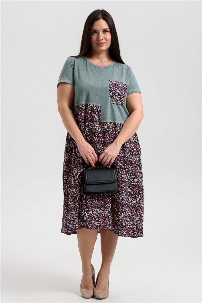 Состав: 70% х/б 30% ПЭ; 100% вискоза Модель: Платье женское 9258 Тип товара: платье Материал: кулирка | штапель | кулирка | штапель Бренд: Натали Суслова Длина: средняя длина Карман: накладные НДС: 22% Отделка: с карманами Рисунок: цветы Рукав: короткий рукав Силуэт: свободный Скидка: любая | от 10% и больше | от 30% и больше Воротник: без воротника Застежка: без застежки Платье женское полуприлегающего силуэта. Горловина округлая, рукав втачной короткий. Верхняя часть полочки и спинки, рукав из кулирки. Нижняя часть платья из штапеля в мелкий цветочек. Верхняя правая и верхняя левая части полочки заканчиваются на разных уровнях, на левой полочке нагрудный карман из штапеля. Нижняя часть платья слегка собрана, что дает более свободный объем по бедрам. В боковых швах внутренние карманы. Таблица размеров и веса
